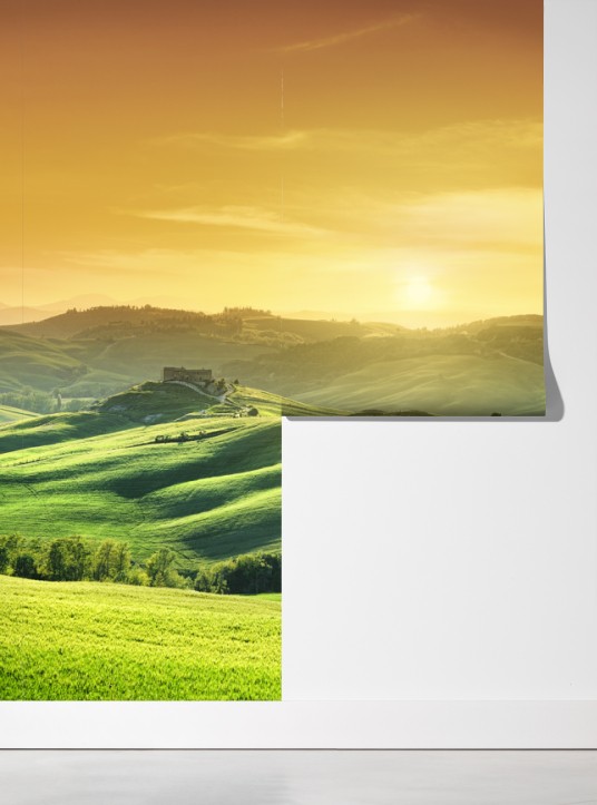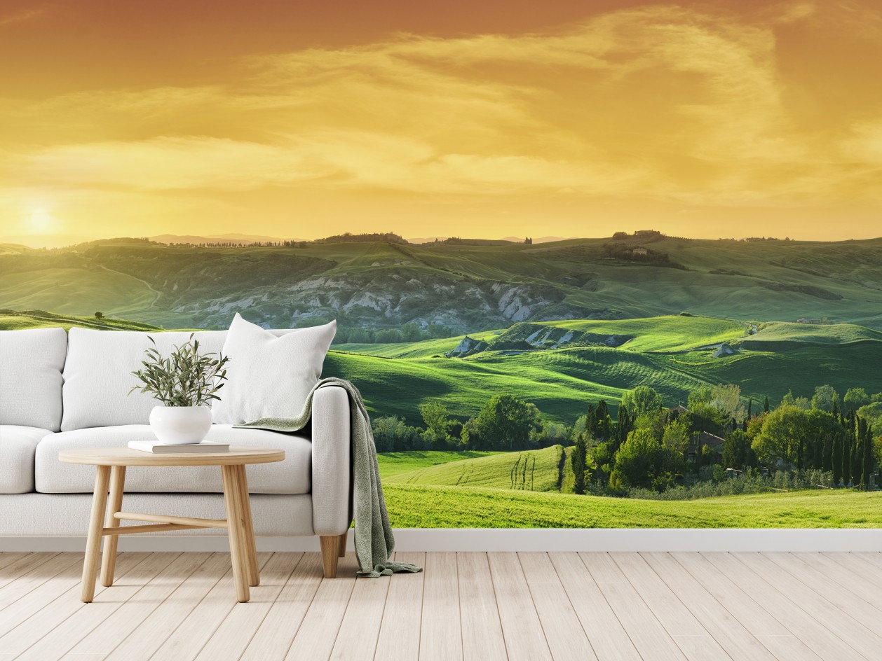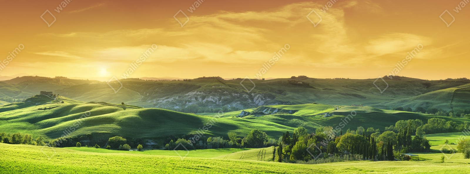 Bringen Sie die ruhige Schönheit der Toskana in Ihr Zuhause mit dieser Panoramaaufnahme grüner, sanfter Hügel im warmen Abendlicht.