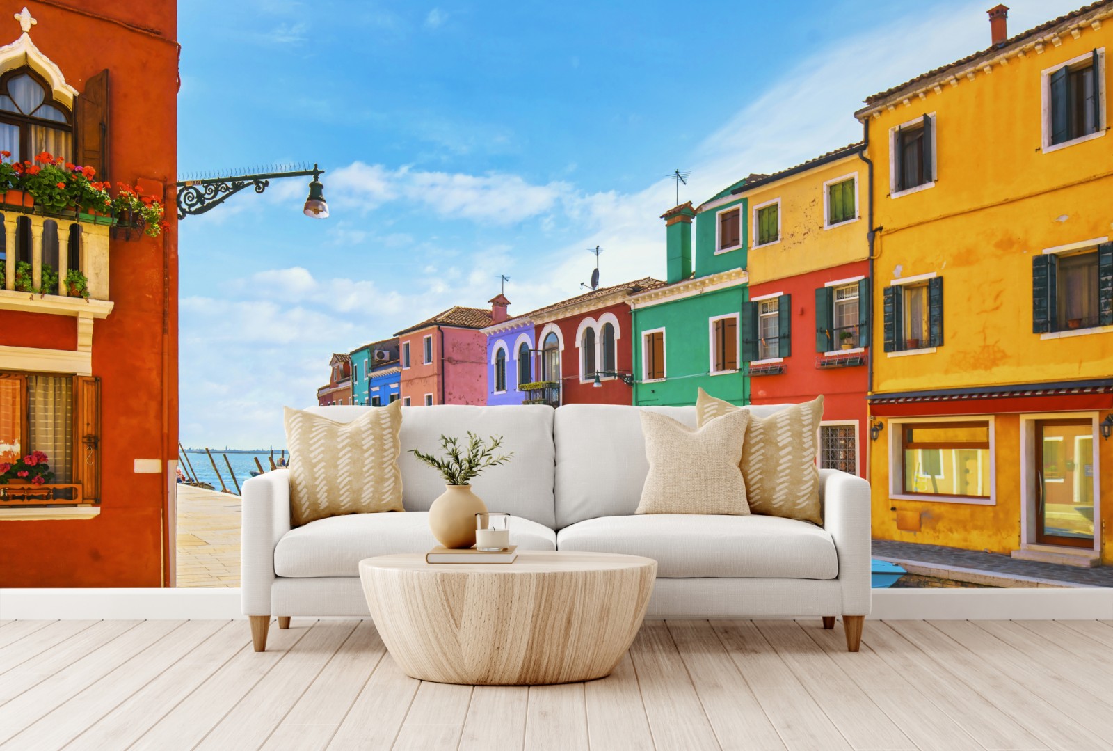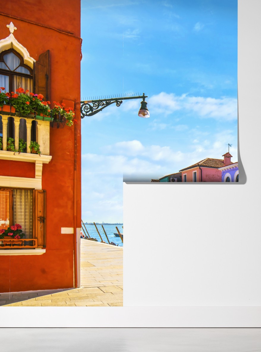 Bringen Sie lebendige venezianische Farben in Ihr Zuhause mit dieser Aufnahme der bunten Häuser am Kanal von Burano.