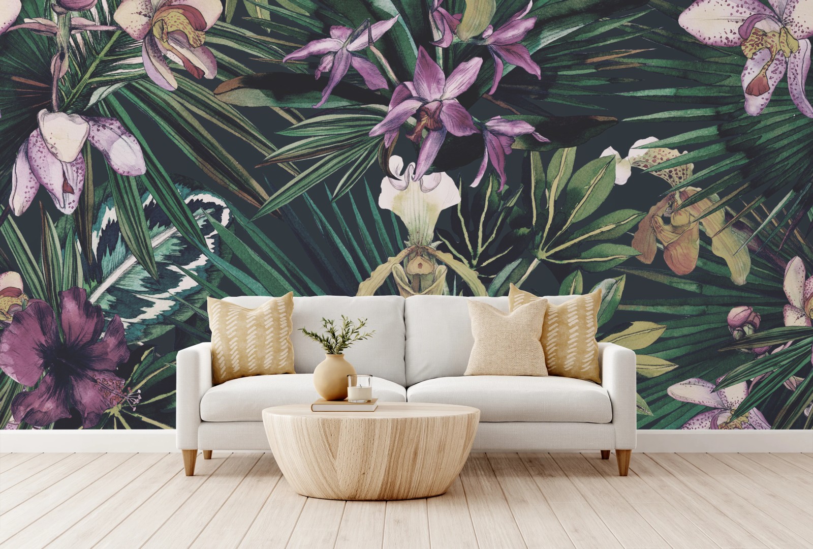Fototapete Tropische orchideen in aquarell und palmblättern
