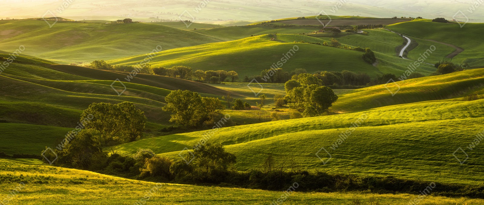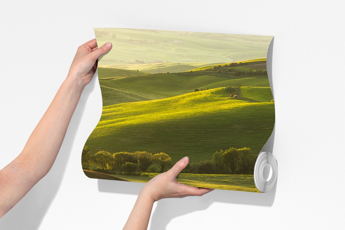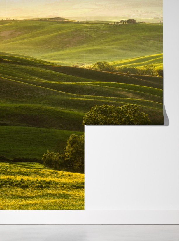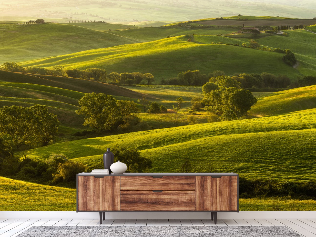 Bringen Sie Ruhe in Ihren Raum mit grünen Hügeln im Sonnenlicht, die in lebendigen Farben eingefangen wurden und als beruhigender Blickfang dienen.
