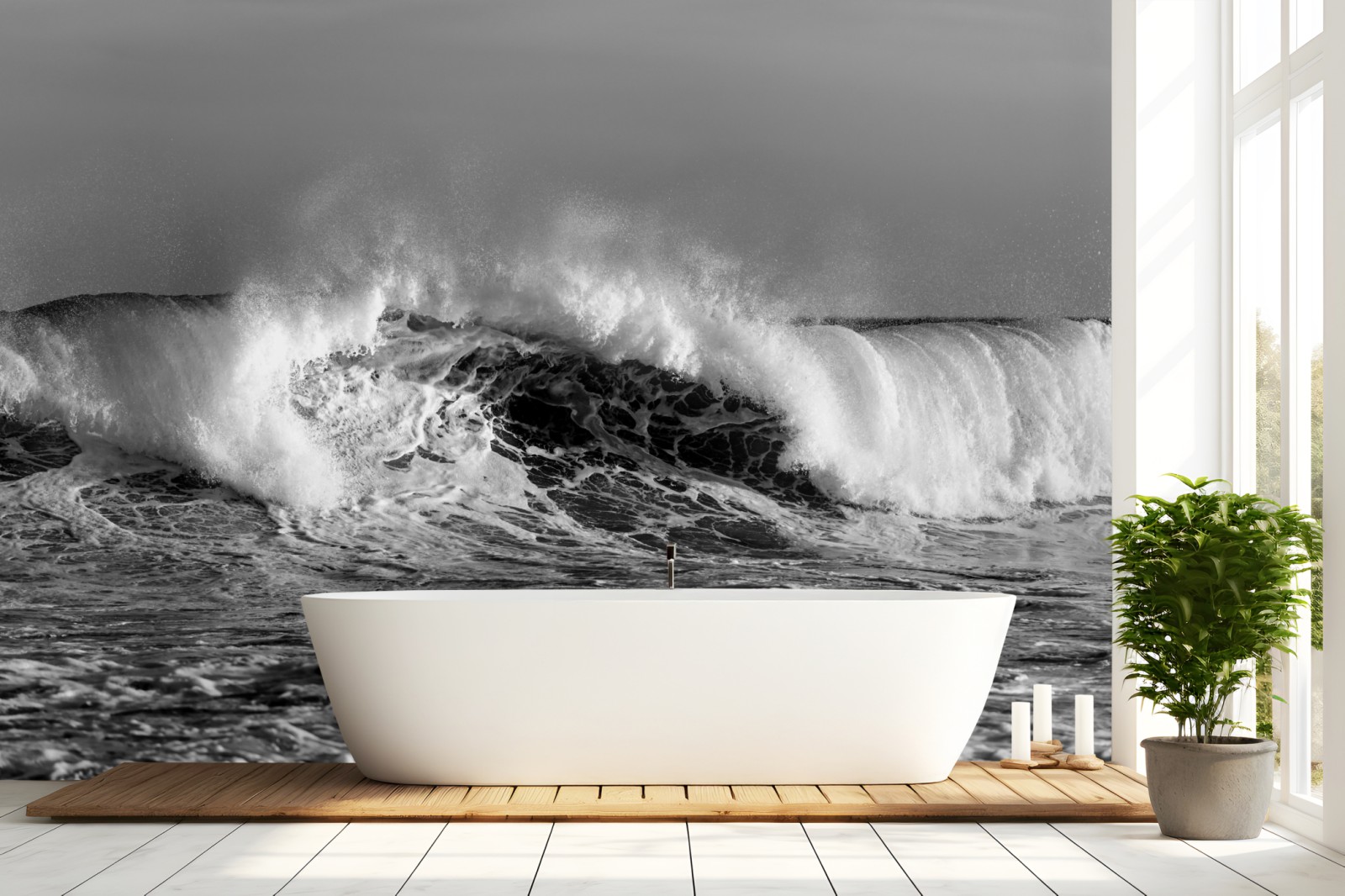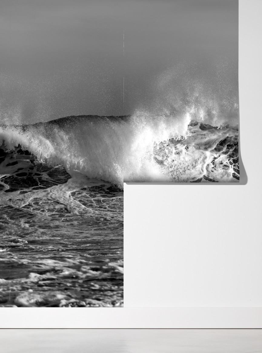 Erleben Sie die rohe Kraft des Meeres mit dieser dramatischen schwarzweißen Aufnahme brechender Wellen, ideal für ein modernes, minimalistisches Badezimmer oder Wohnzimmer.