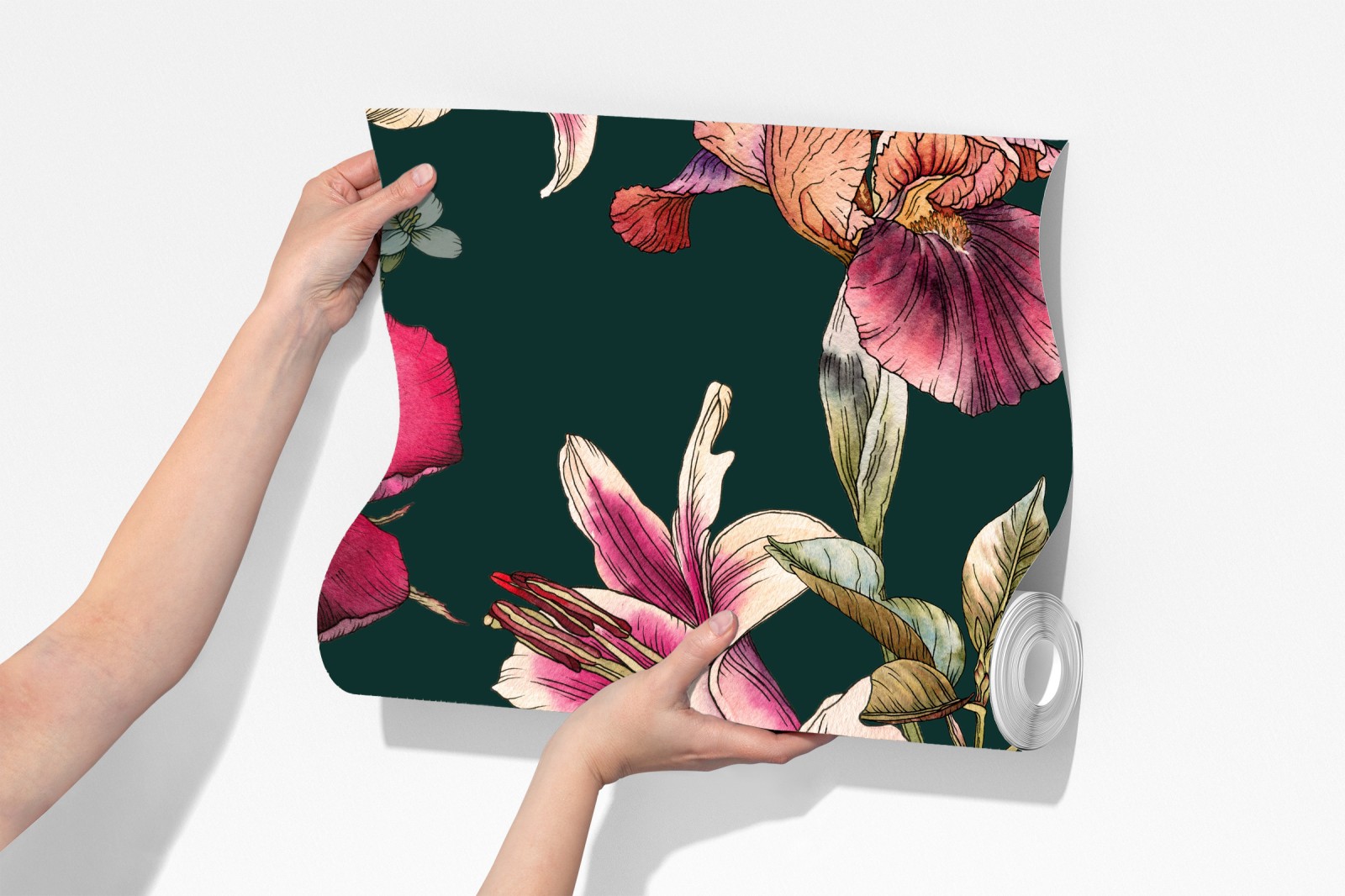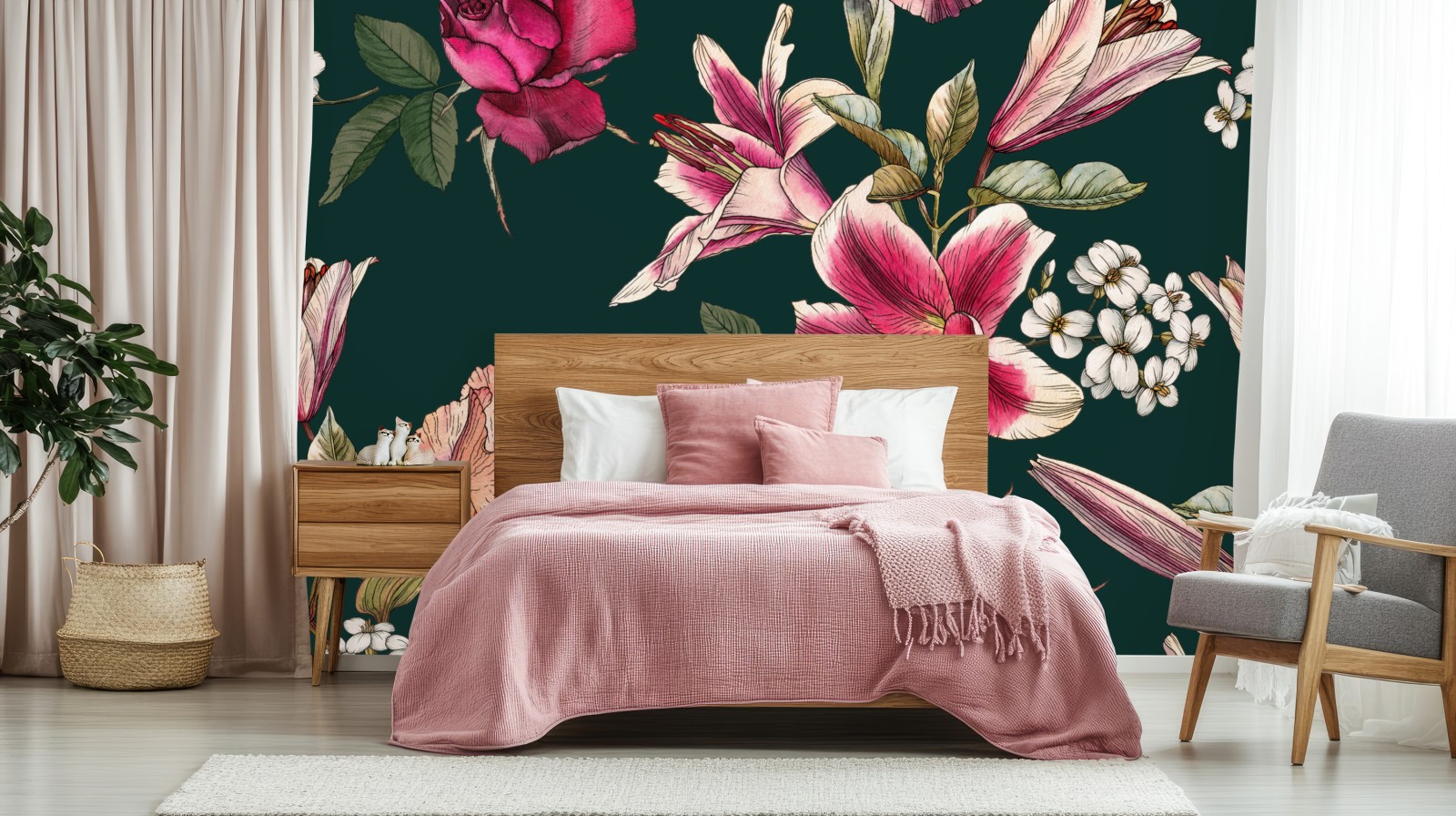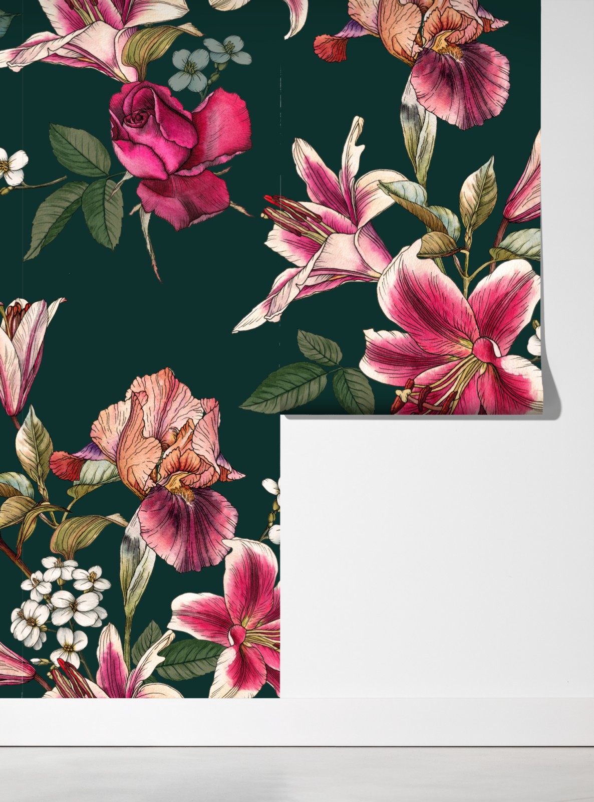 Bringen Sie zeitlose florale Eleganz in Ihren Raum mit diesem botanischen Muster in satten Rosatönen auf tiefgrünem Hintergrund.