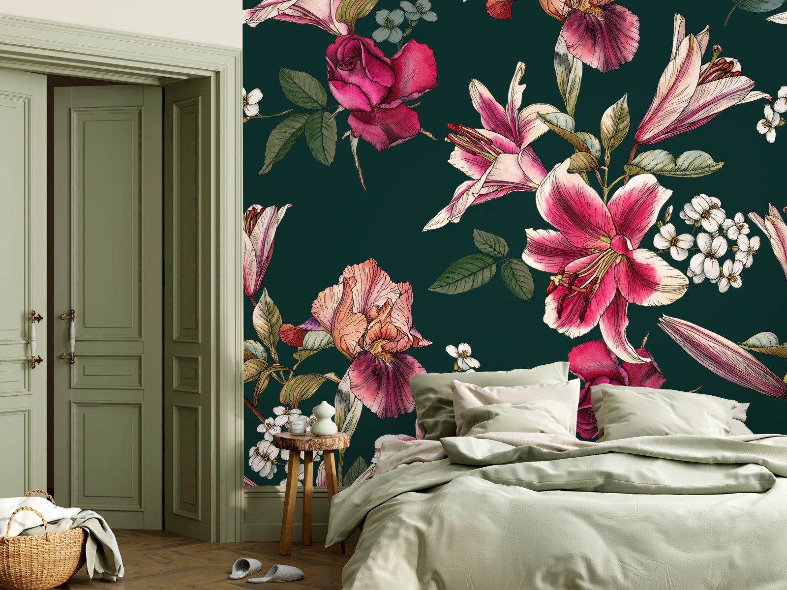 Fototapete Vintage botanisches floralmuster auf tiefgrün