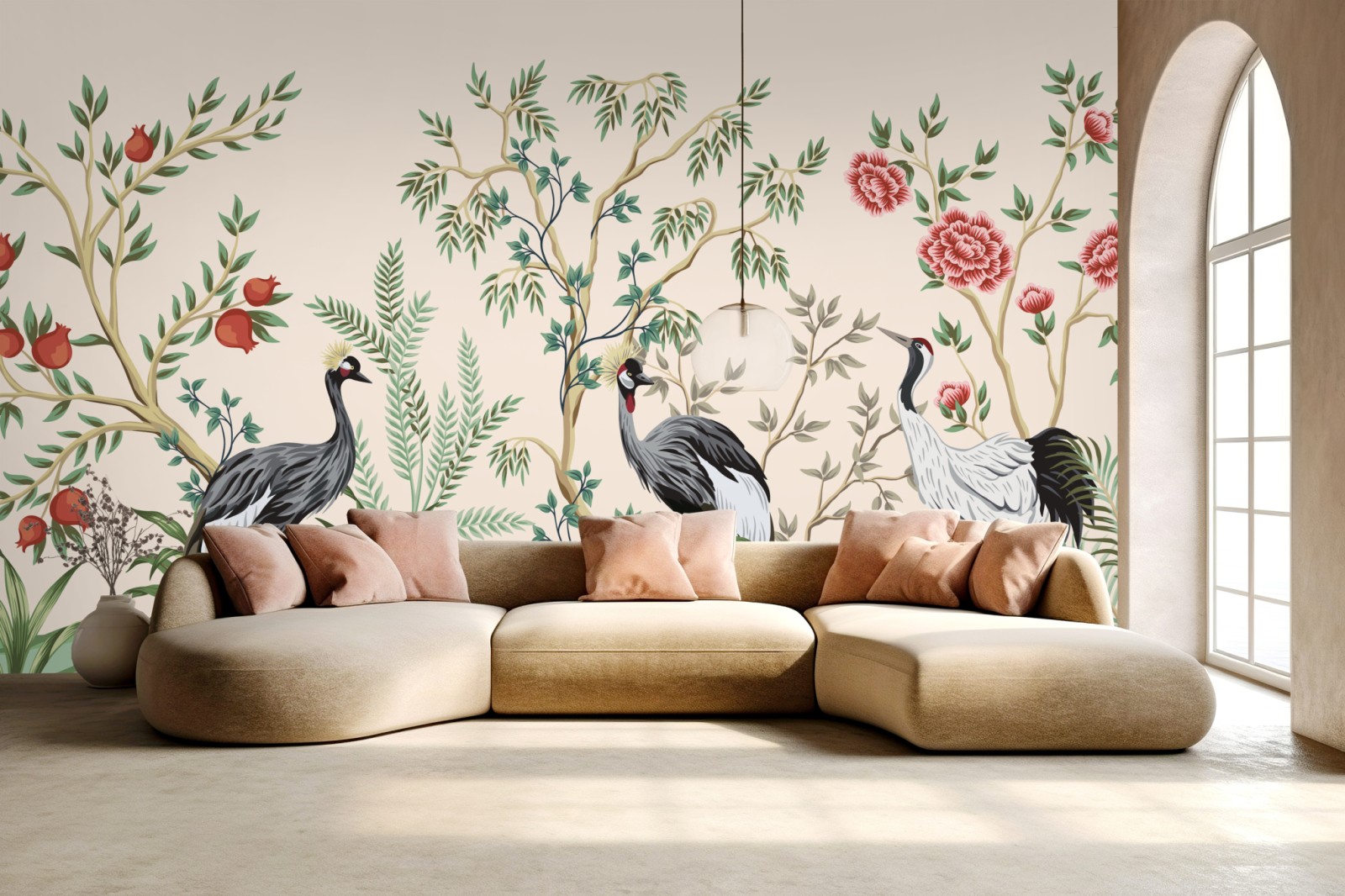 Zarte Illustration von Kranichen zwischen blühenden Zweigen in sanften Pastelltönen, perfekt, um Ihrem Wohnraum eine elegante und ruhige Atmosphäre zu verleihen.