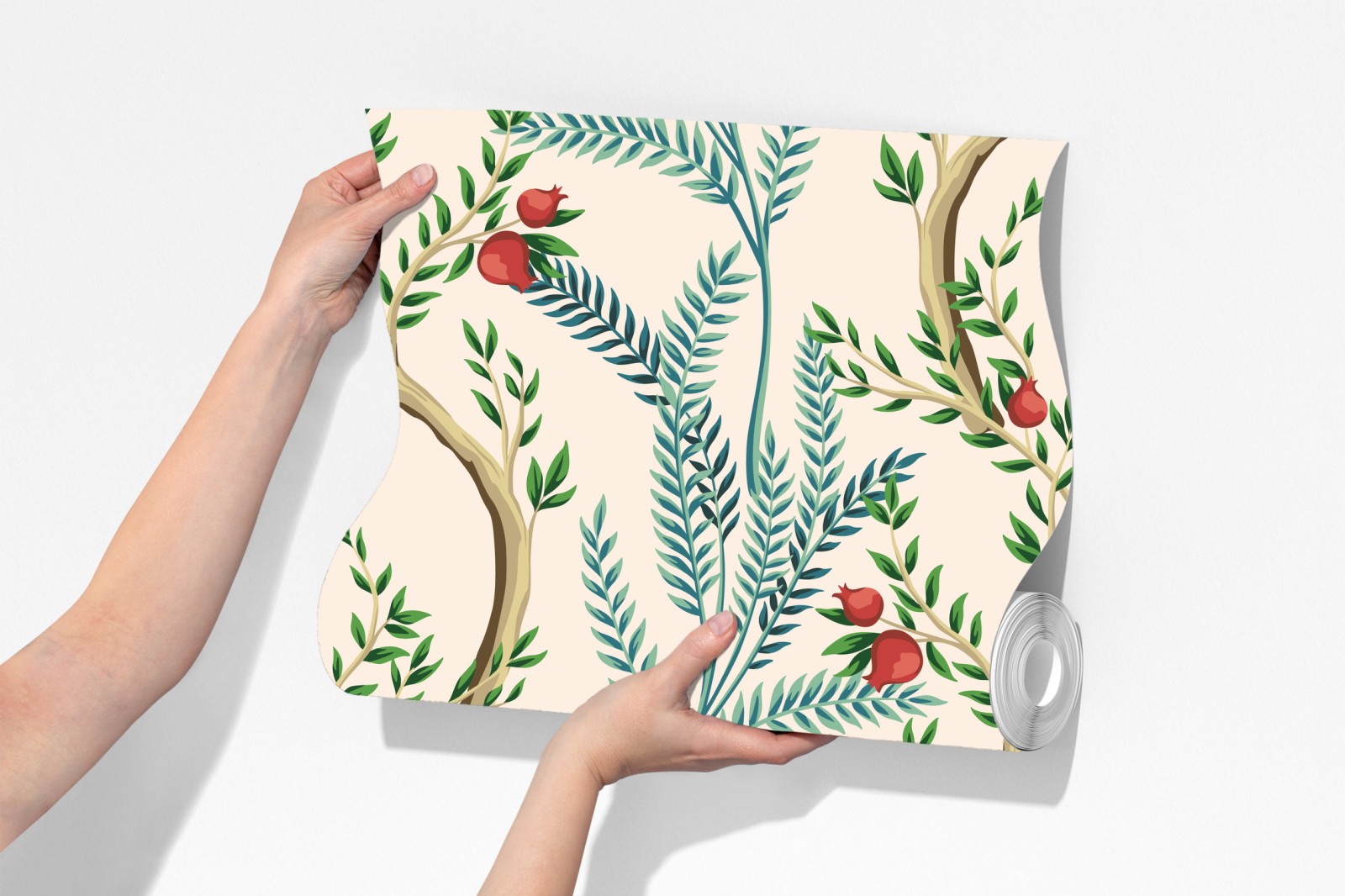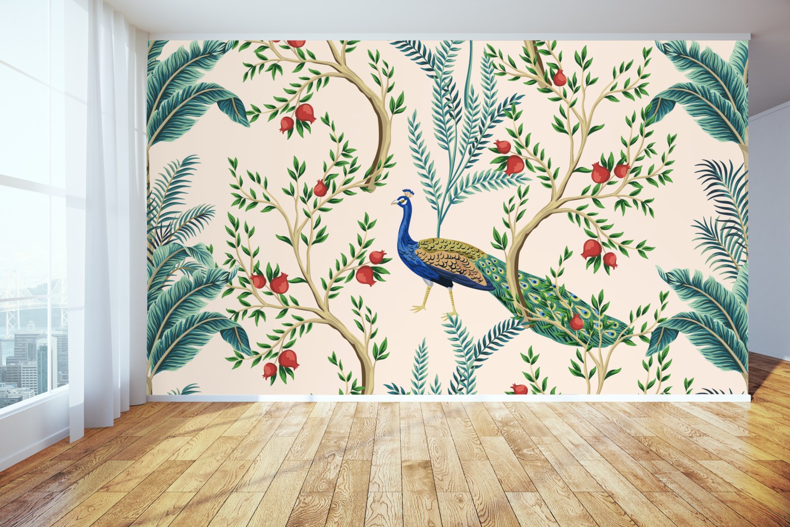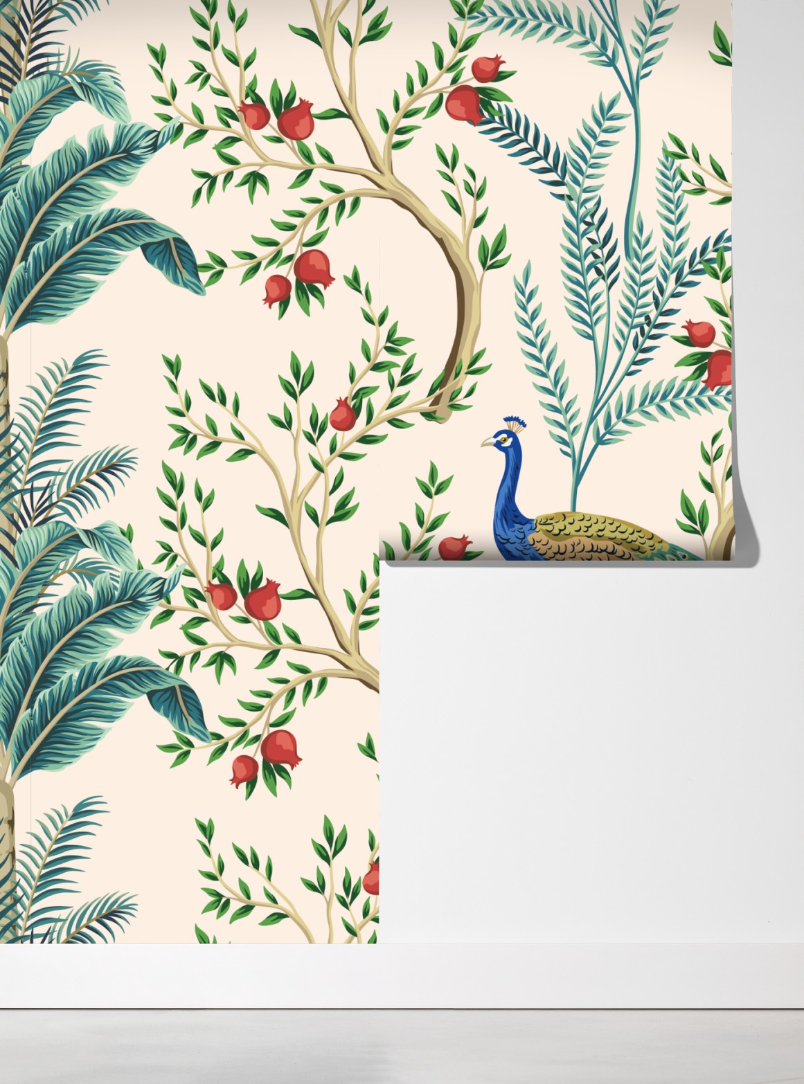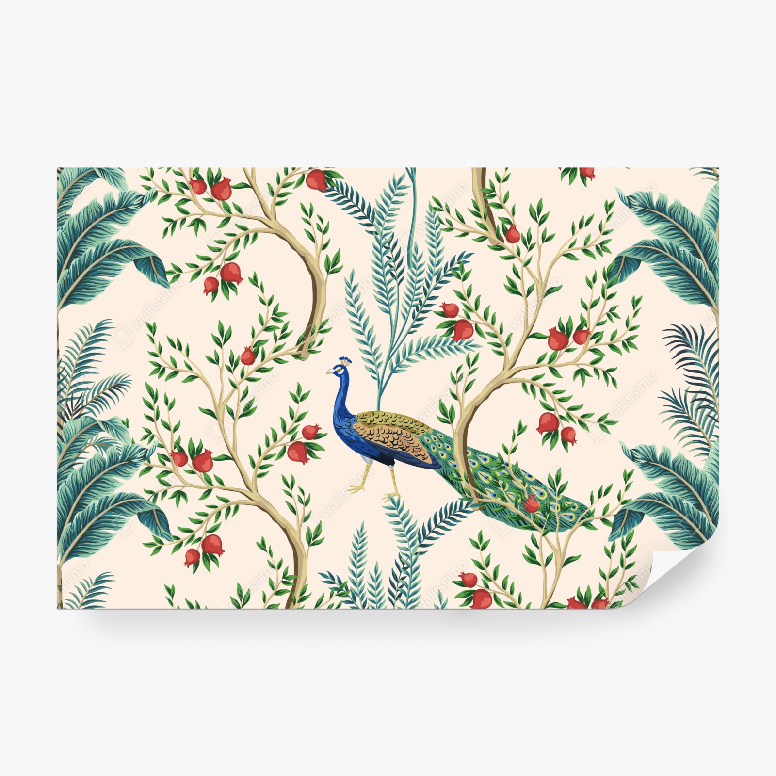 Bringen Sie exotische Eleganz in Ihr Zuhause mit diesem farbenfrohen Pfau- und Pflanzenmotiv mit Granatäpfeln.