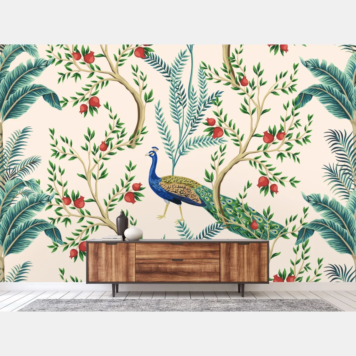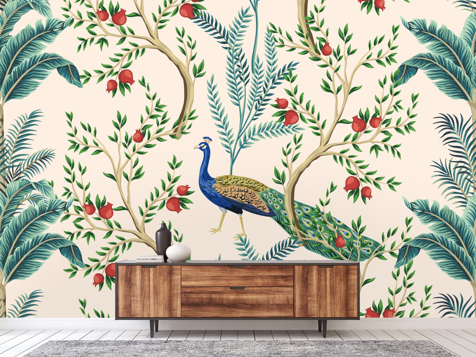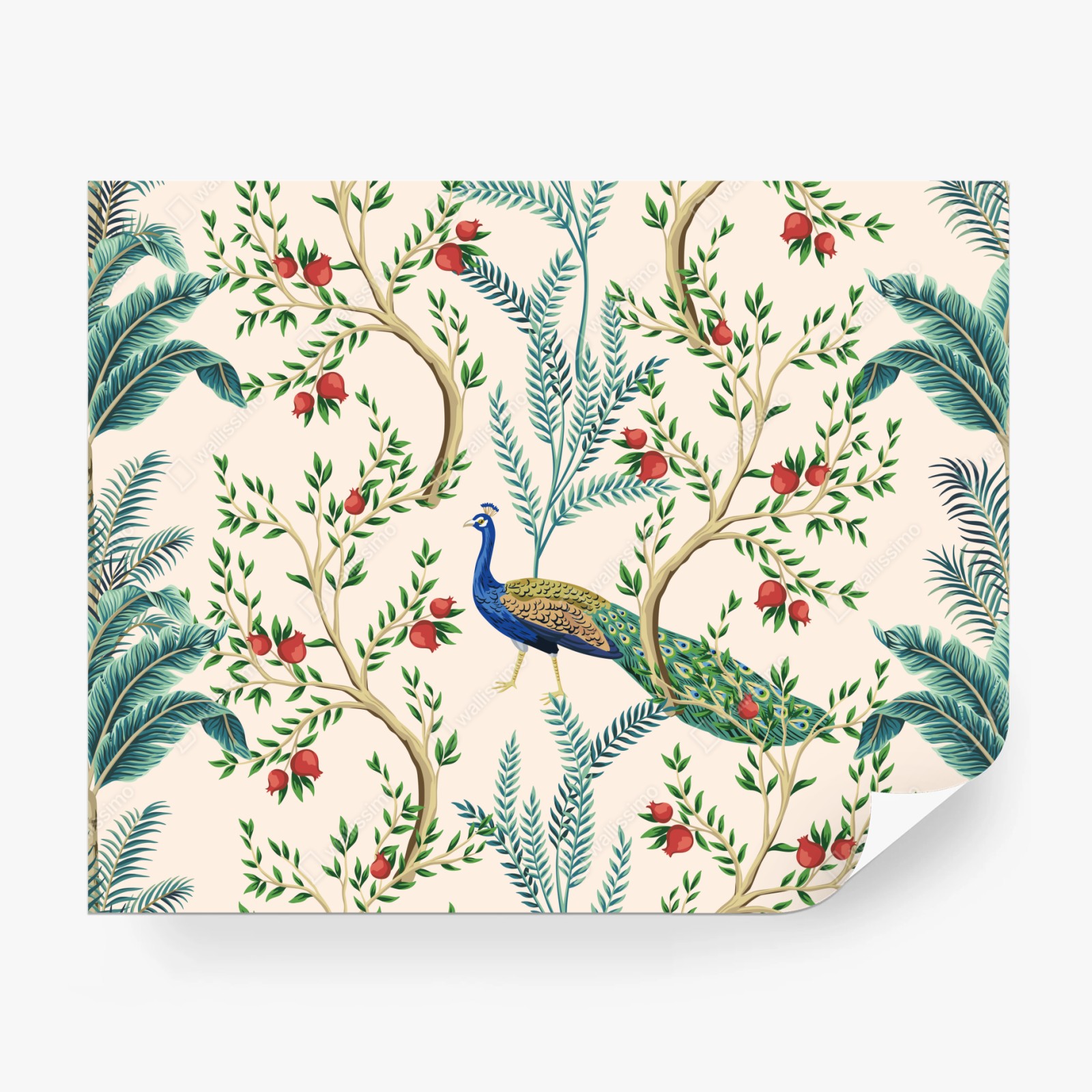 Bringen Sie exotische Eleganz in Ihr Zuhause mit diesem farbenfrohen Pfau- und Pflanzenmotiv mit Granatäpfeln.MehrWeniger