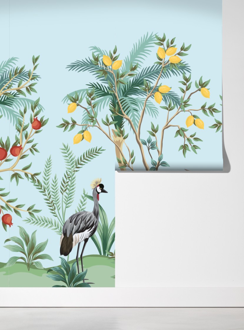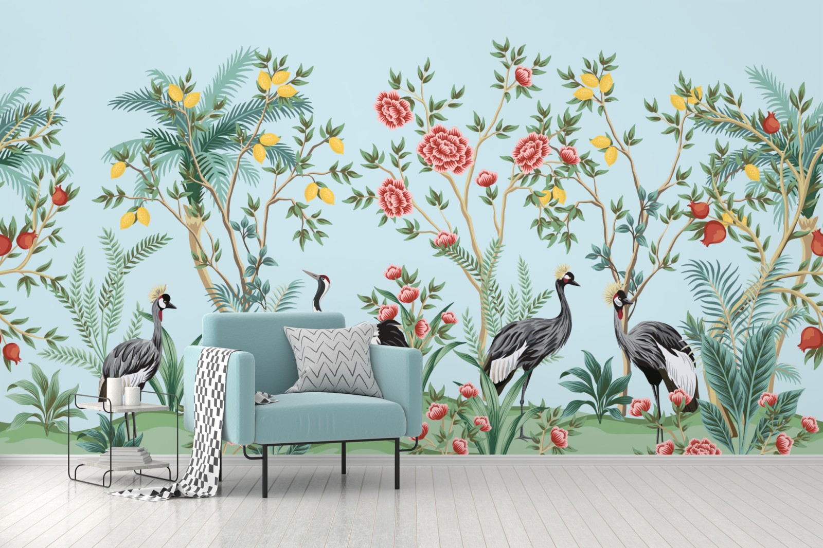 Bringen Sie orientalische Ruhe in Ihr Zuhause mit detaillierten Kranichen, üppigen Palmen und blühenden Blumen vor türkisfarbenem Hintergrund.