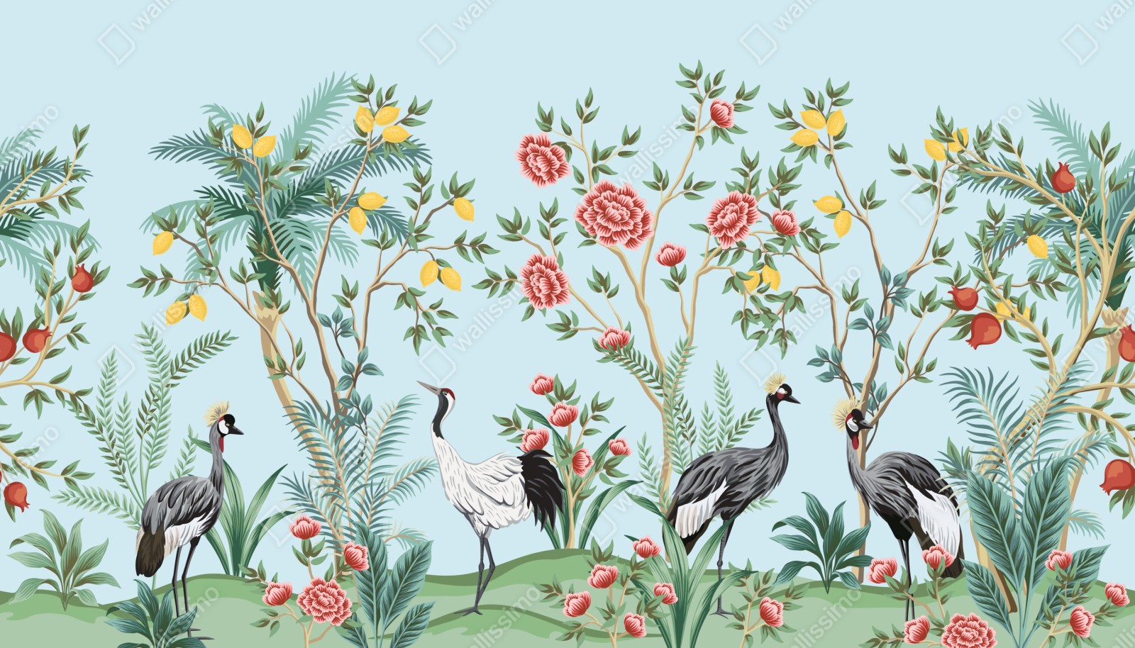 Fototapete eleganter kranichgarten mit blüten