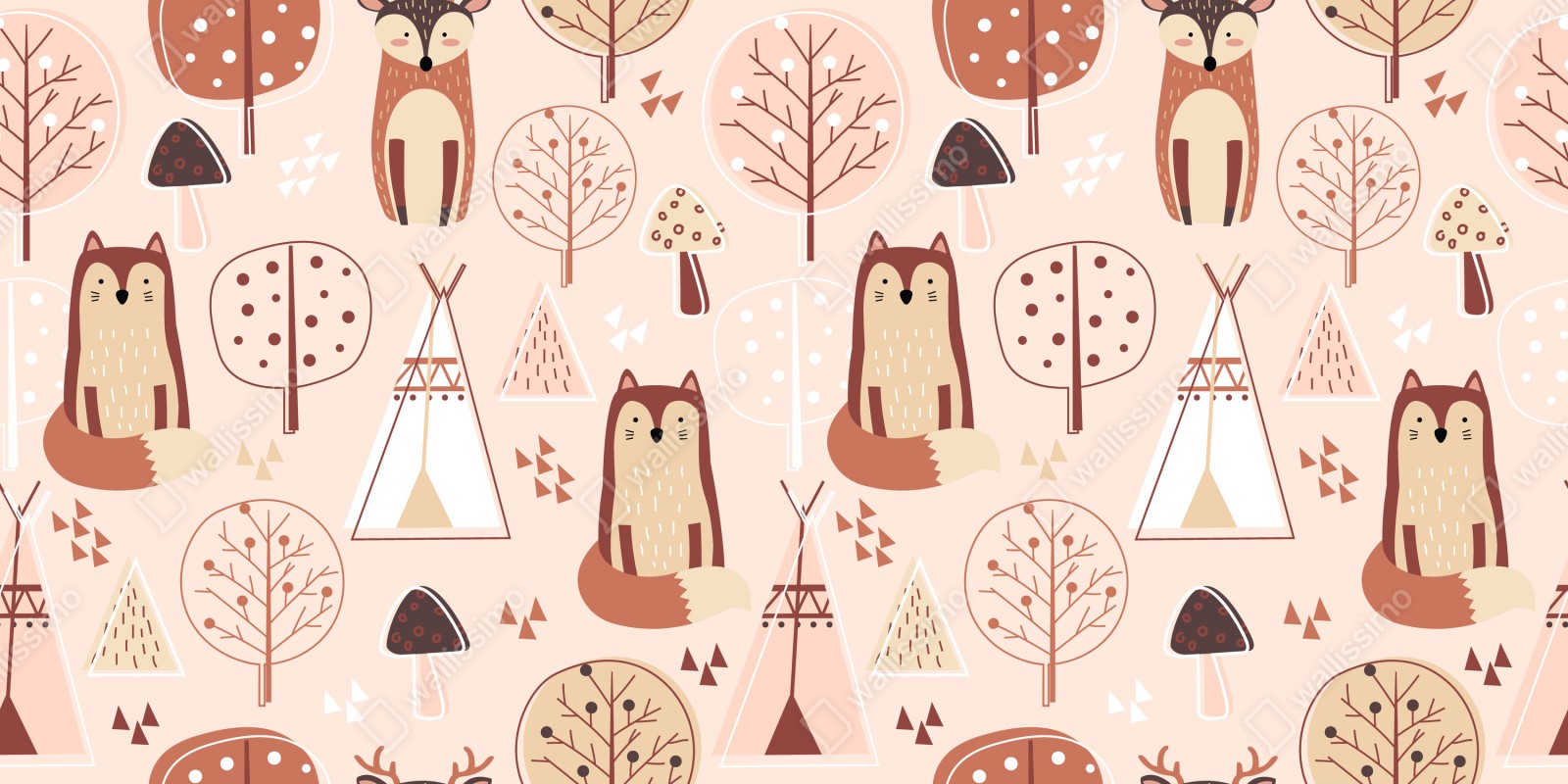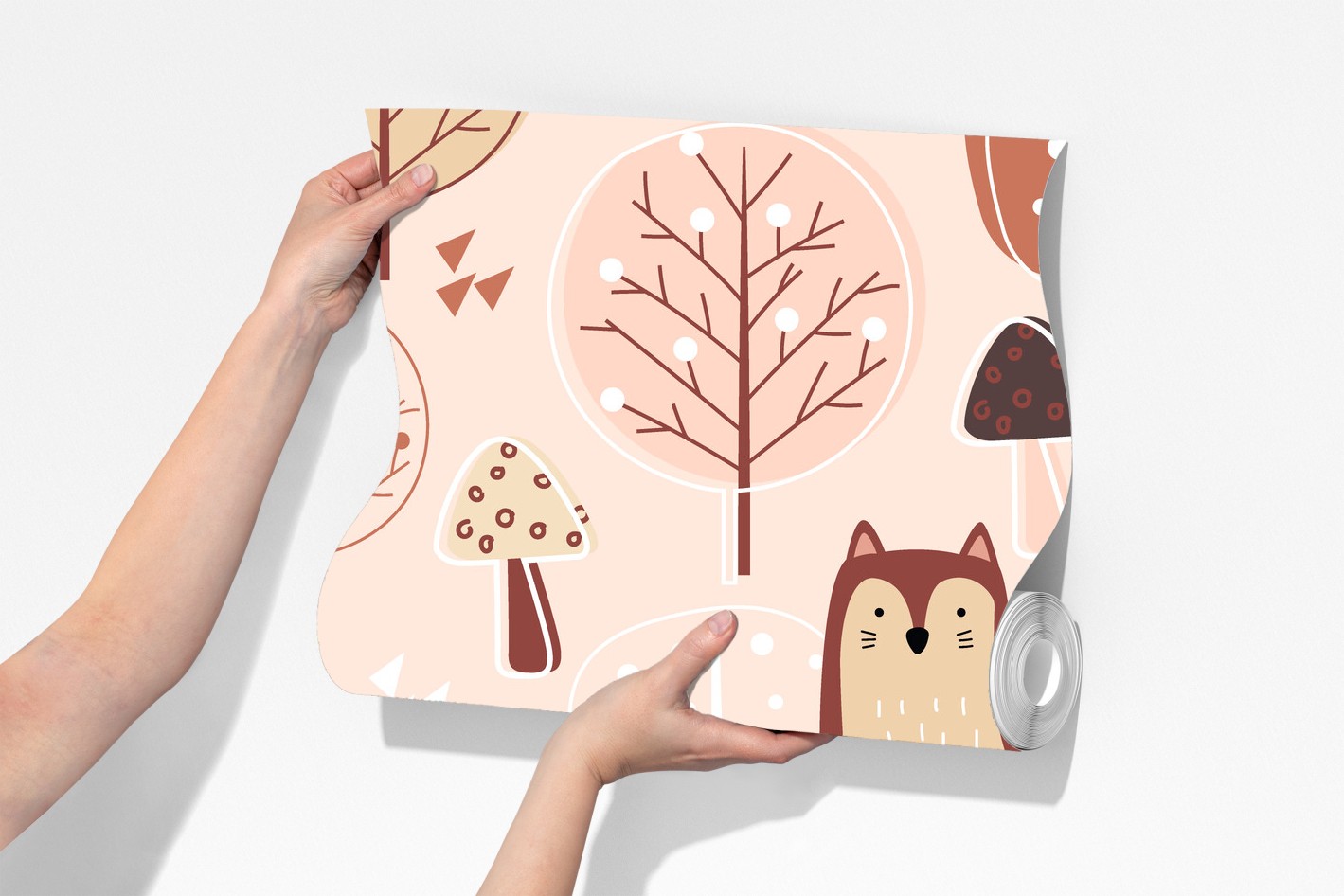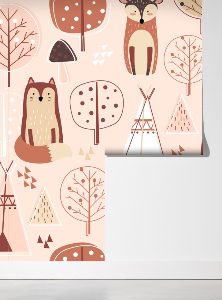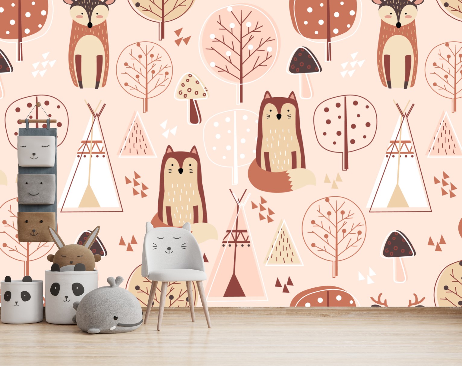 Bringen Sie gemütlichen Waldblick ins Kinderzimmer mit einem pastellfarbenen Fuchs- und Baummuster, das eine beruhigende Atmosphäre schafft.