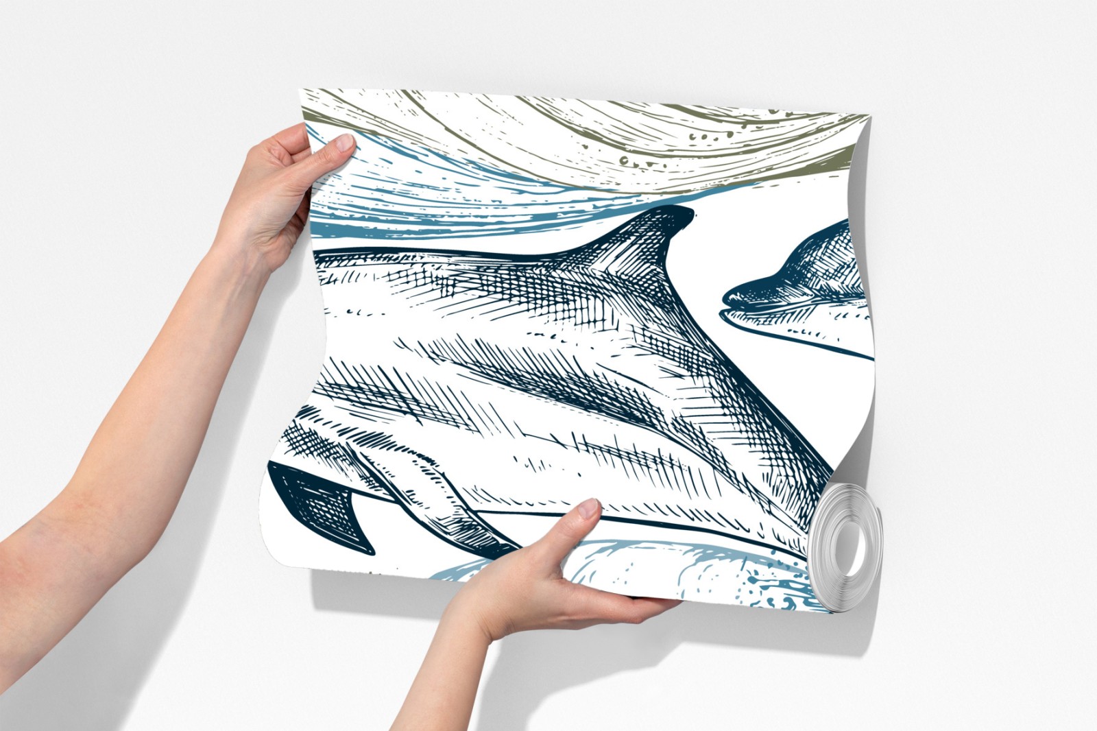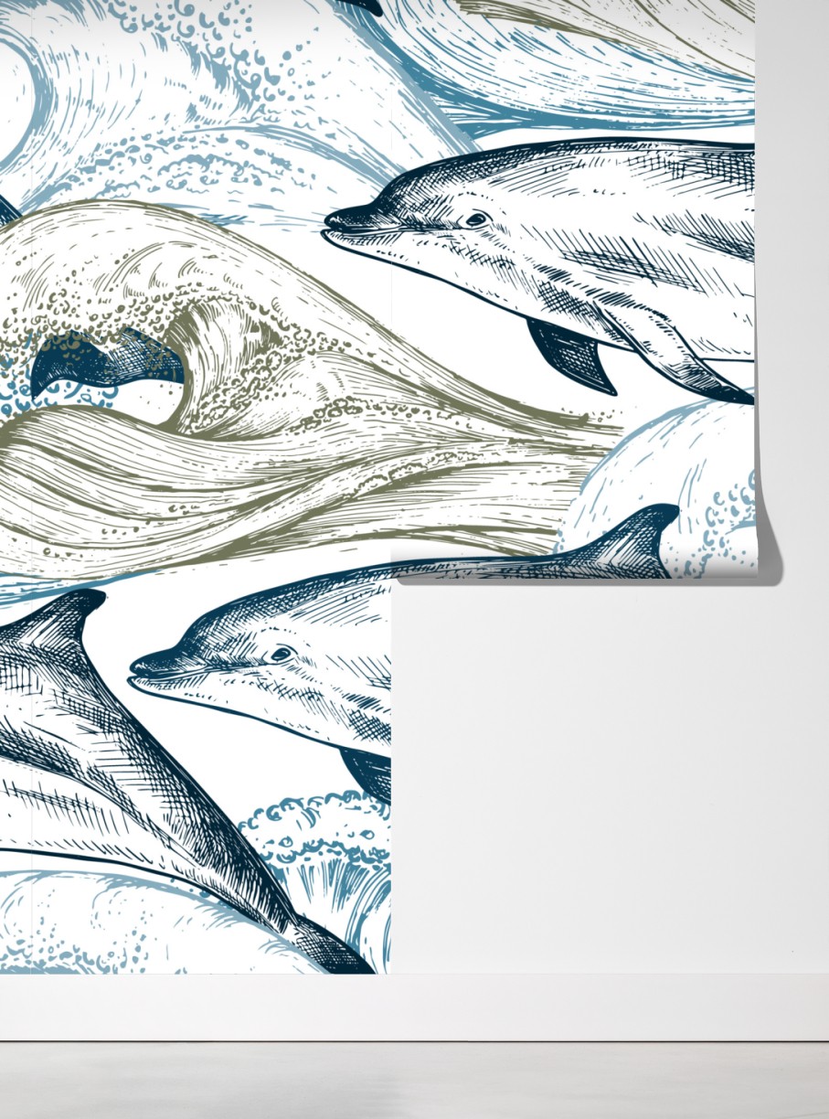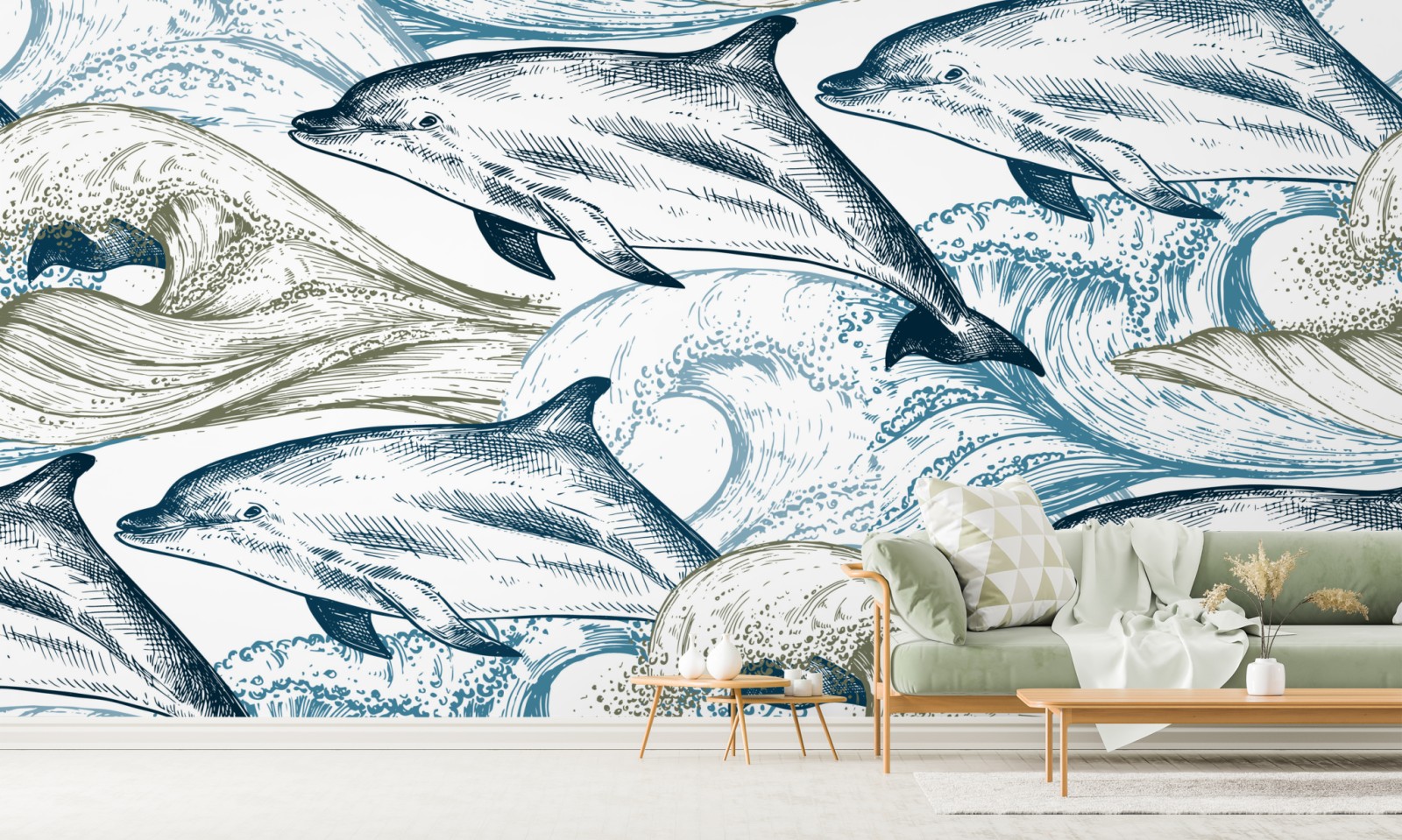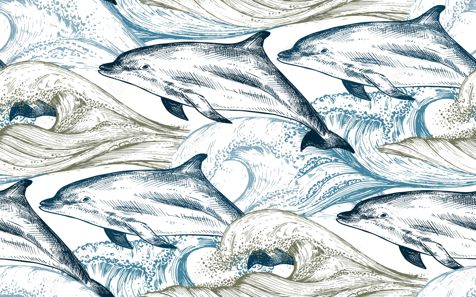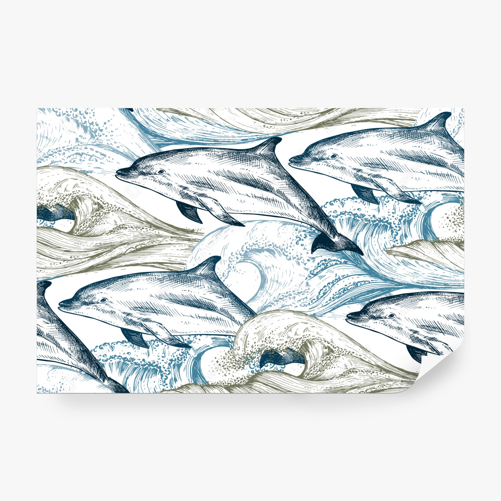 Bringen Sie eine ruhige Meeresatmosphäre in Ihr Zuhause mit dieser Vintage-Illustration von Delfinen, handgezeichneten Wellen und beruhigenden Blautönen.
