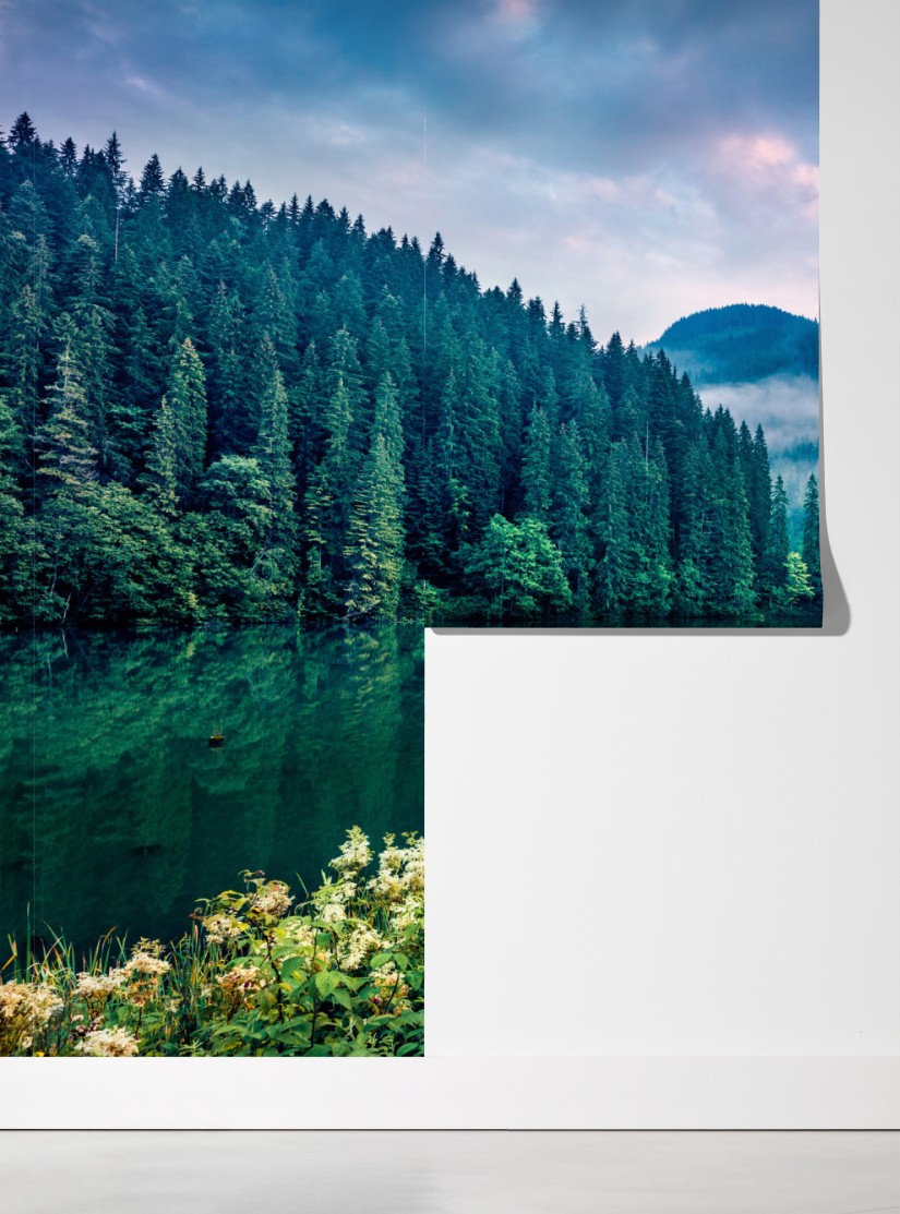 Erleben Sie einen nebligen Sonnenaufgang über Lacu Rosu, der beruhigende natürliche Atmosphäre und Tiefe in Ihr Zuhause bringt.