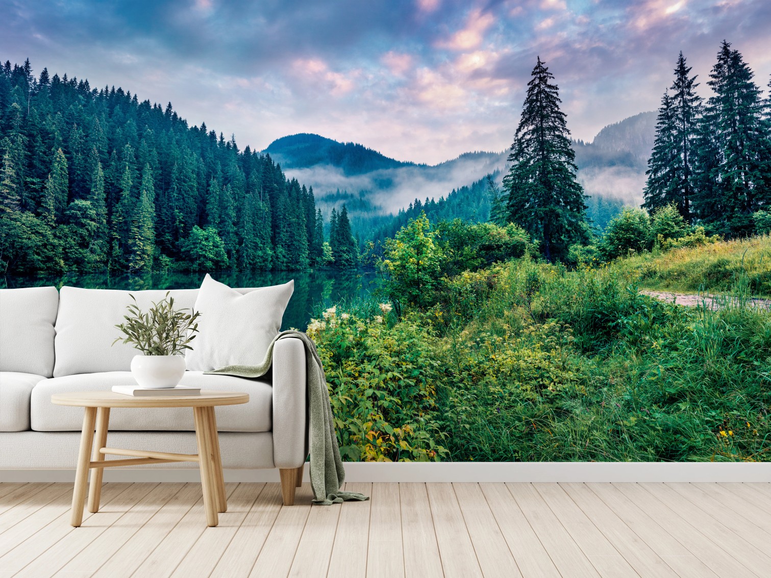 Fototapete Nebliger sonnenaufgang über Lacu Rosu