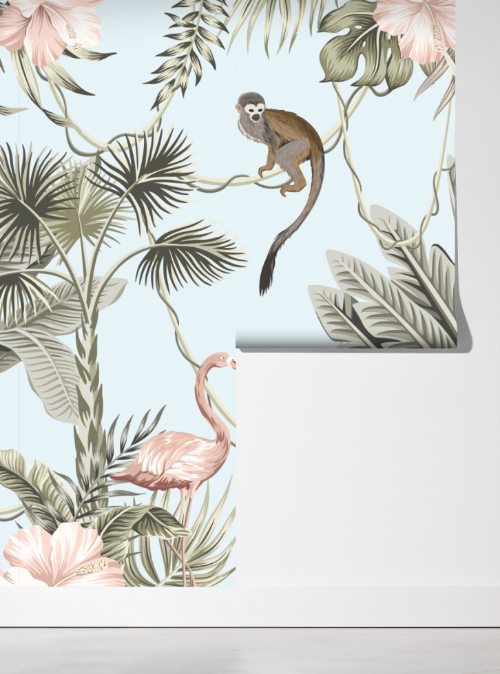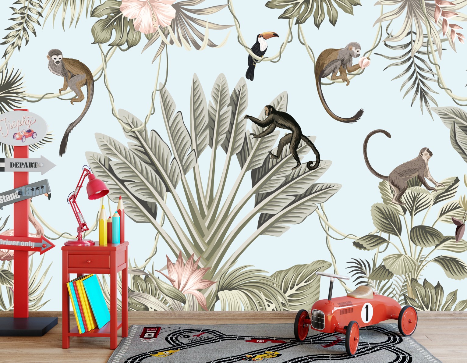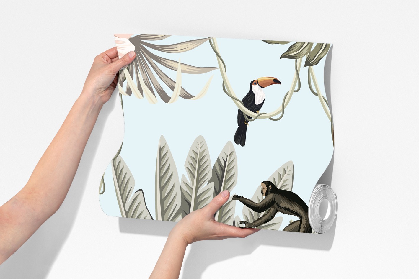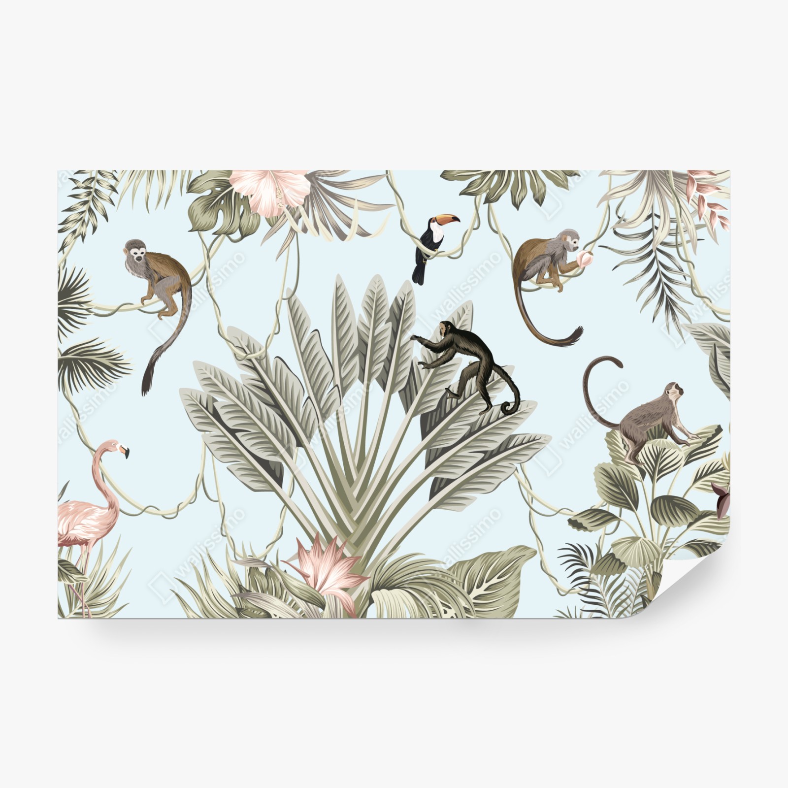 Bringen Sie tropische Ruhe in Ihr Zuhause mit dieser pastellfarbenen Dschungelillustration mit verspielten Affen, Tukan und üppigem Laub.