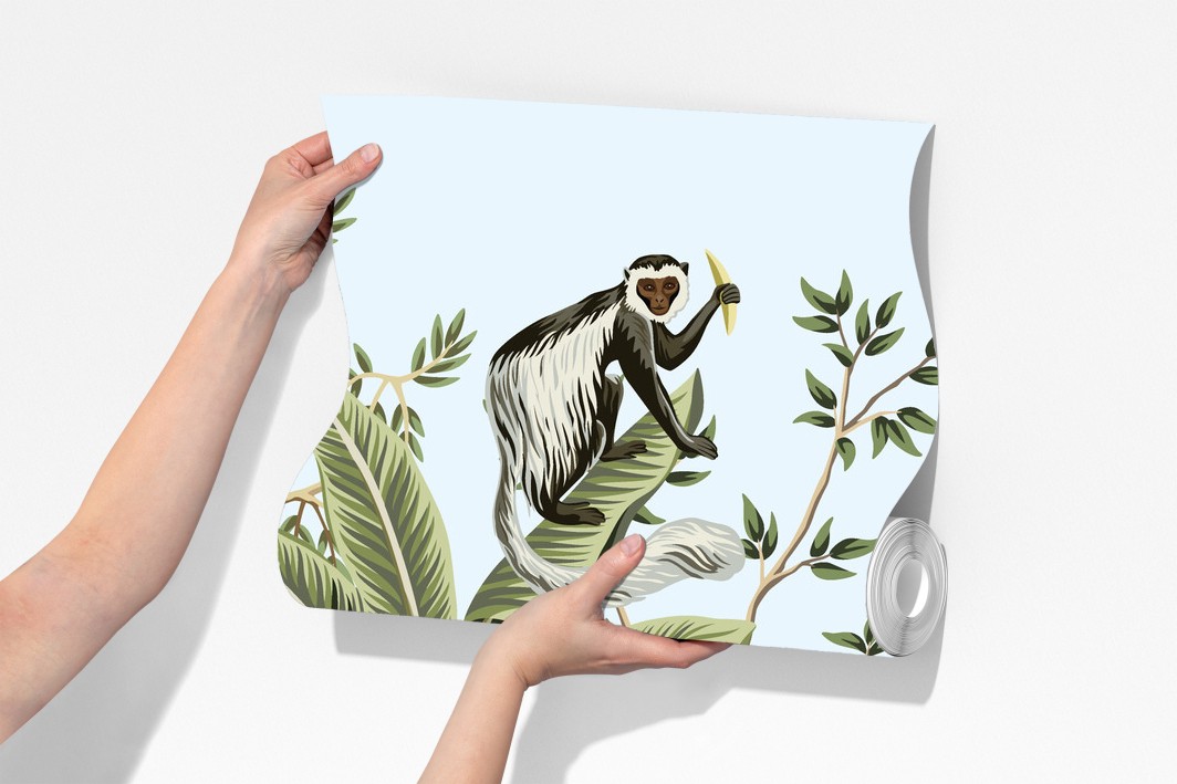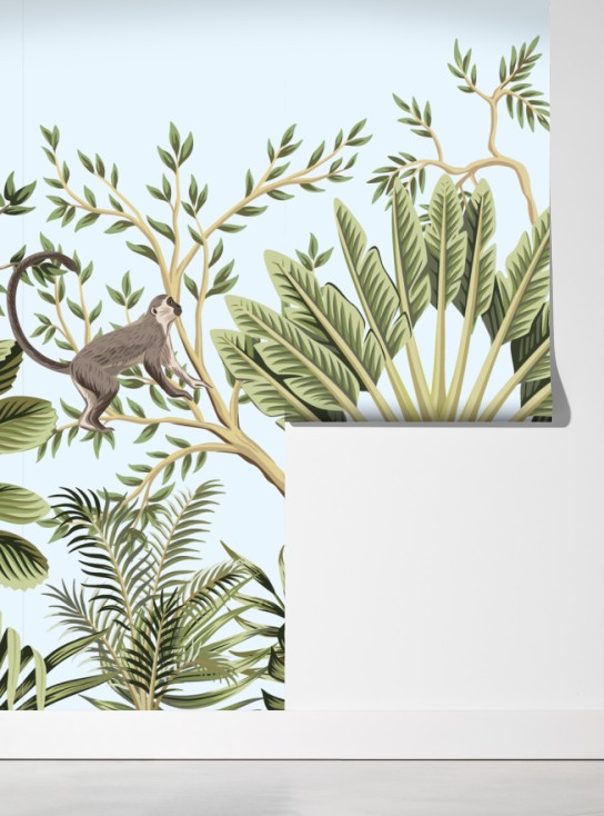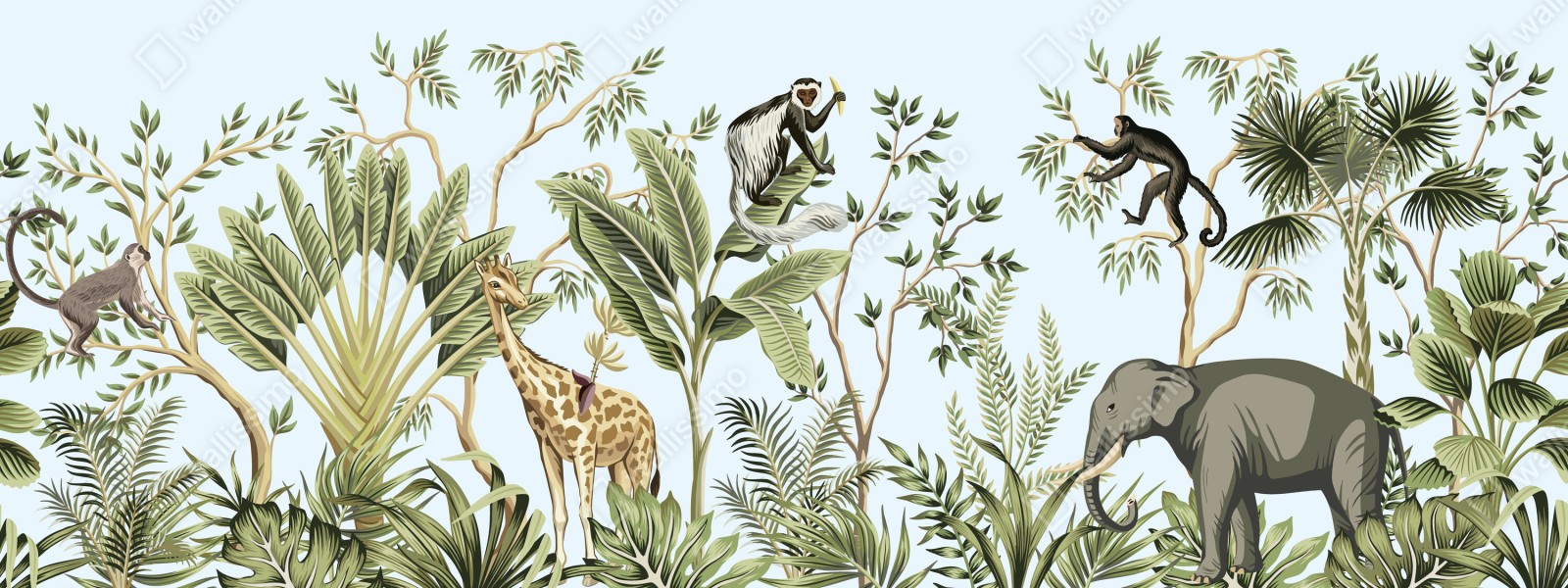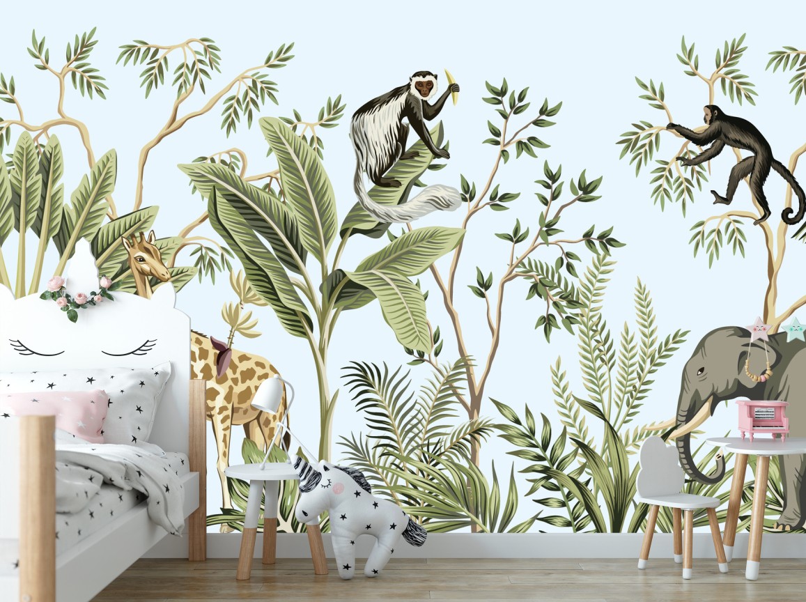Bringen Sie tropisches Flair in den Raum mit liebenswerten Tieren und üppigem Blattwerk in sanften Pastelltönen.