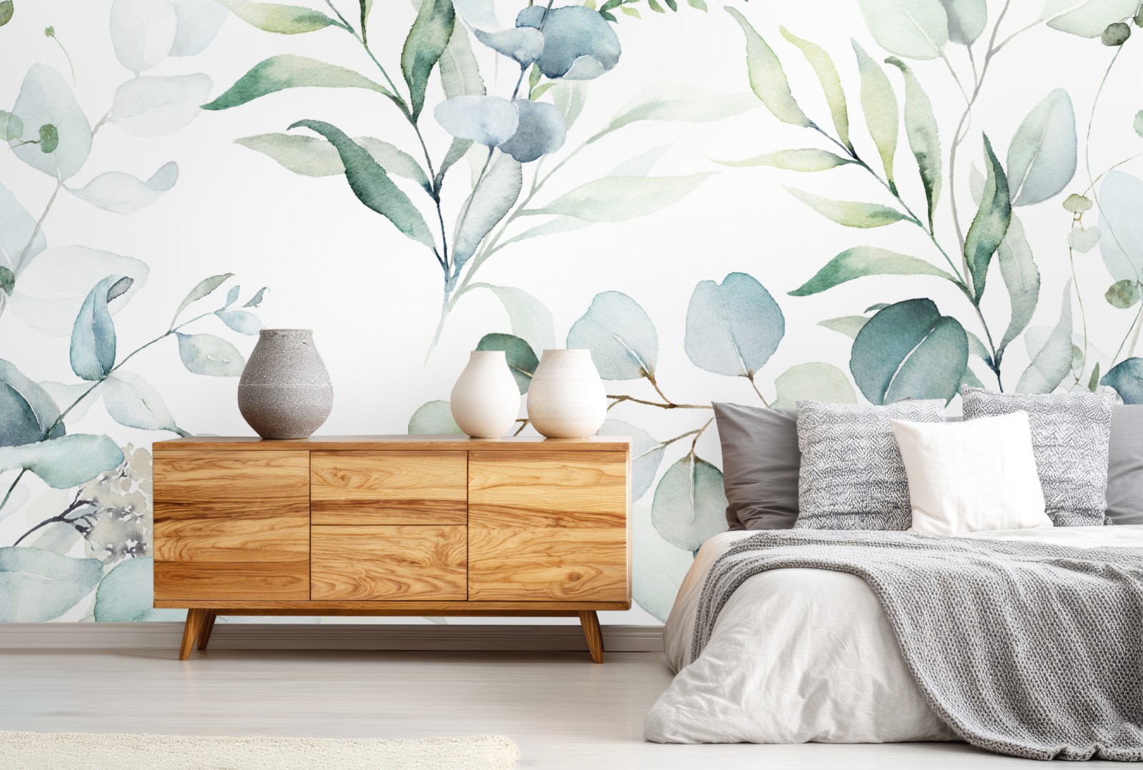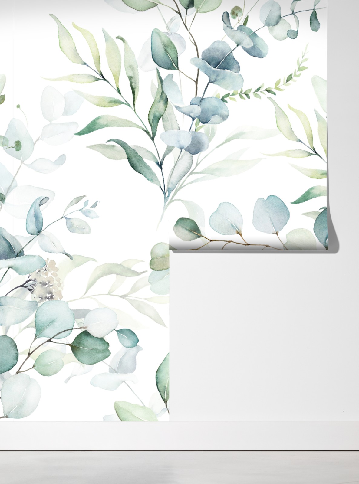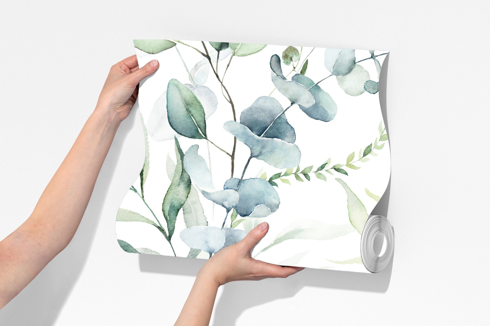 Bringen Sie Ruhe und natürliche Schönheit an Ihre Wände mit diesem zarten Aquarell-Eukalyptusmuster, perfekt um eine luftige und entspannte Atmosphäre zu schaffen.