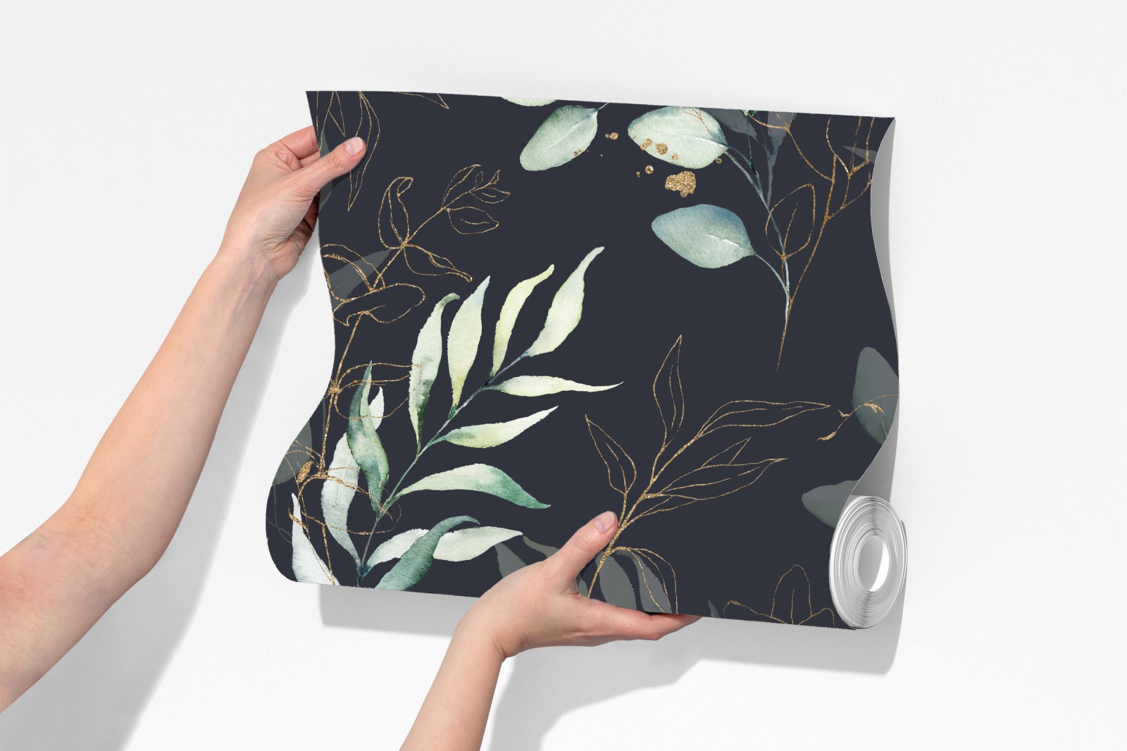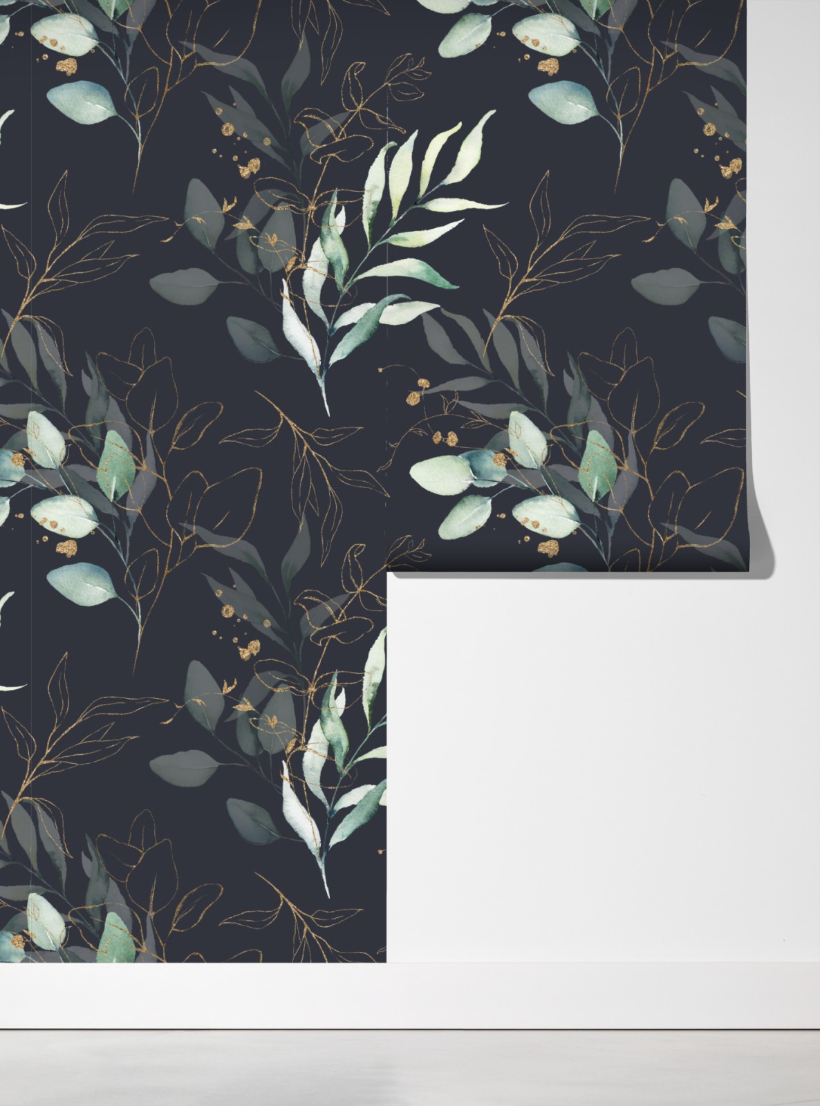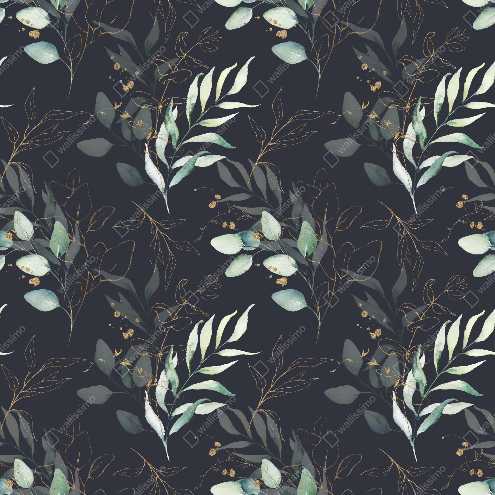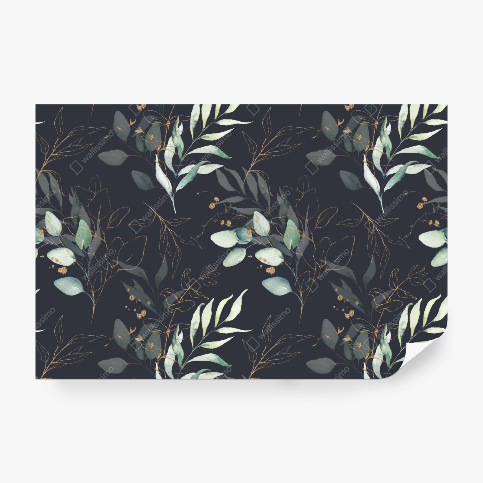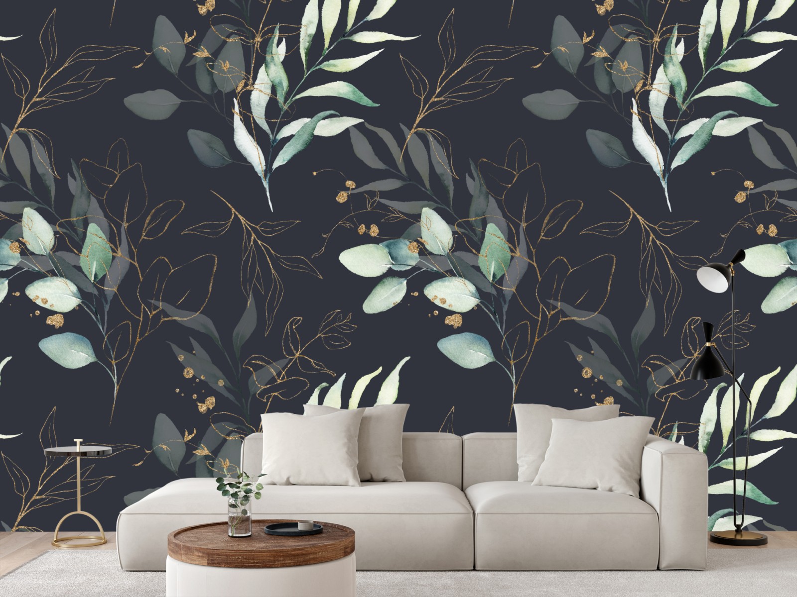 Bringen Sie Ruhe und natürliche Eleganz in Ihren Raum mit Aquarell-Eukalyptusblättern auf dunklem Hintergrund mit goldenen Linienakzenten.