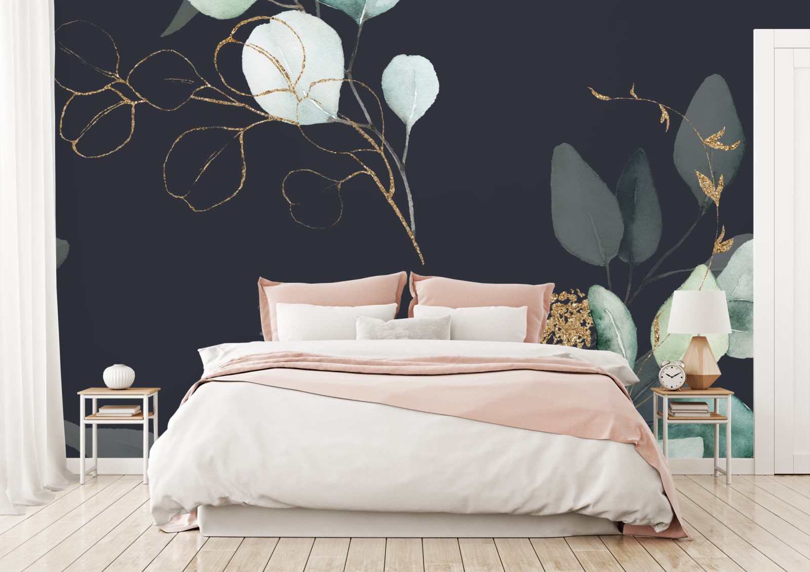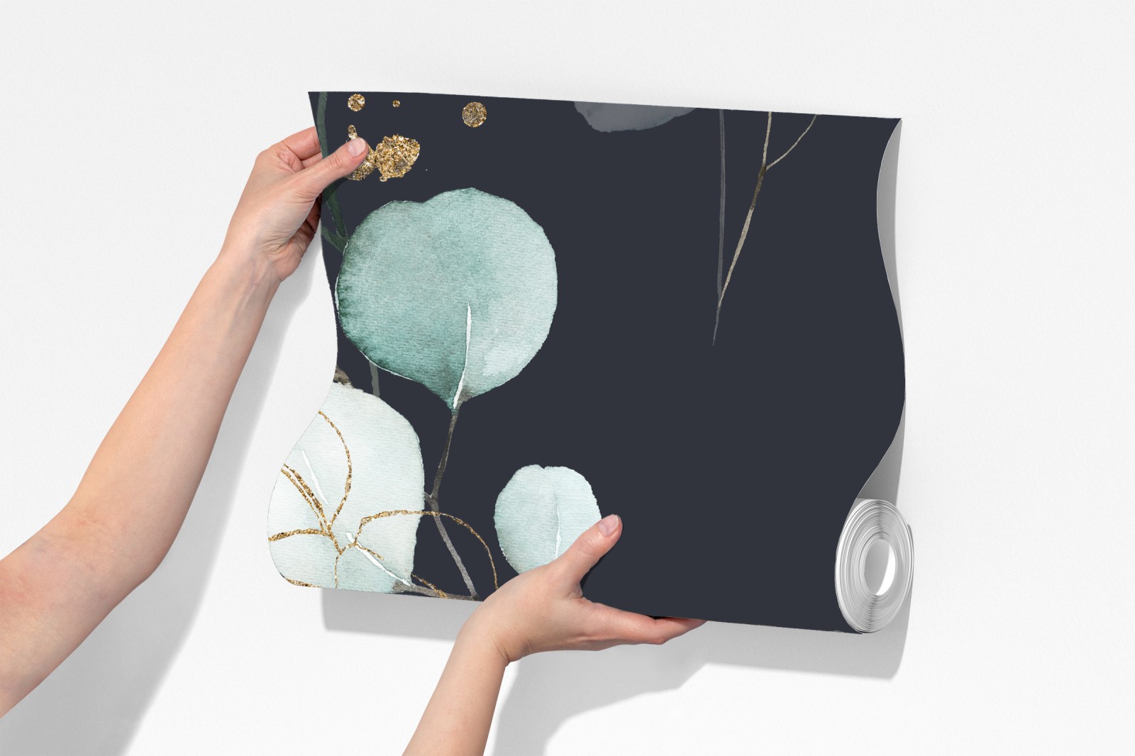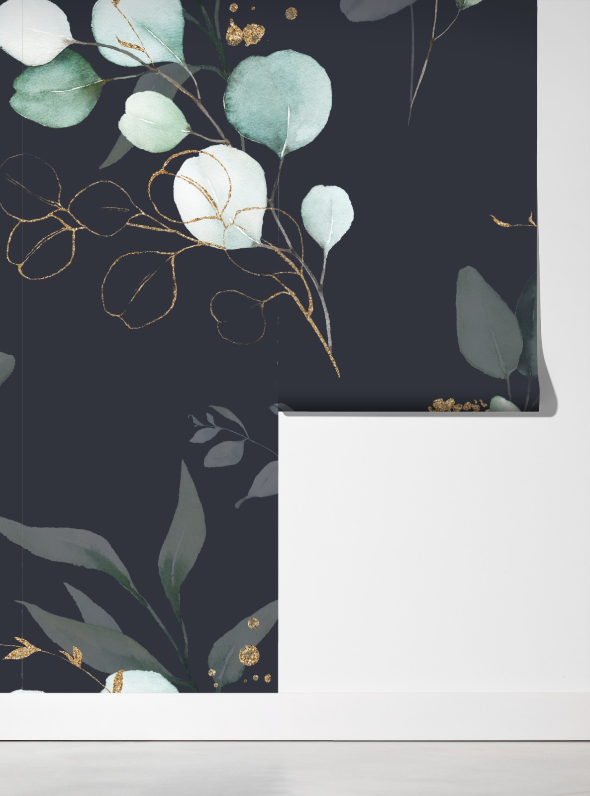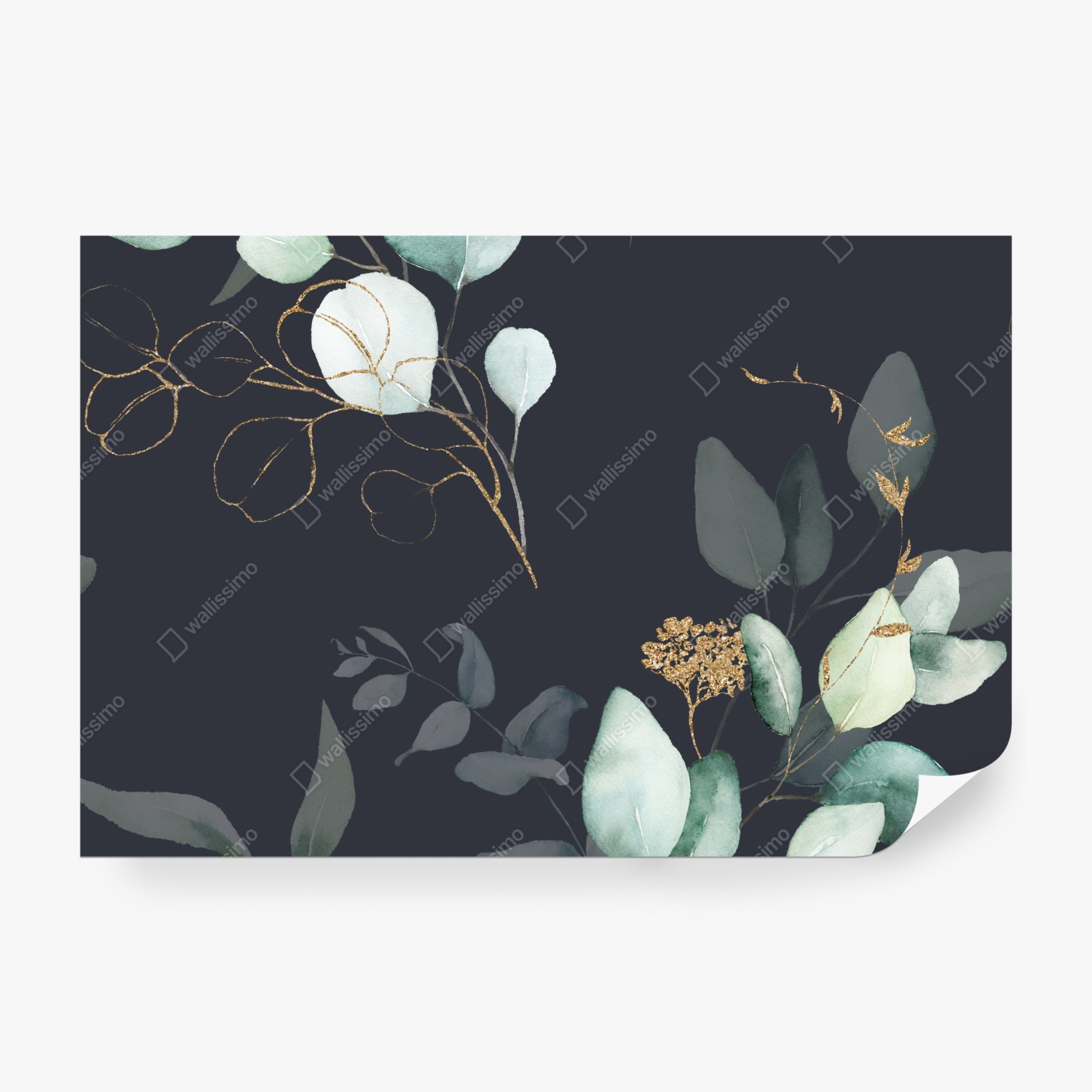 Verleihen Sie Ihrem Raum eine ruhige botanische Eleganz mit Eukalyptusblättern in Aquarell und dezenten goldenen Akzenten auf einem tiefen, stimmungsvollen Hintergrund.