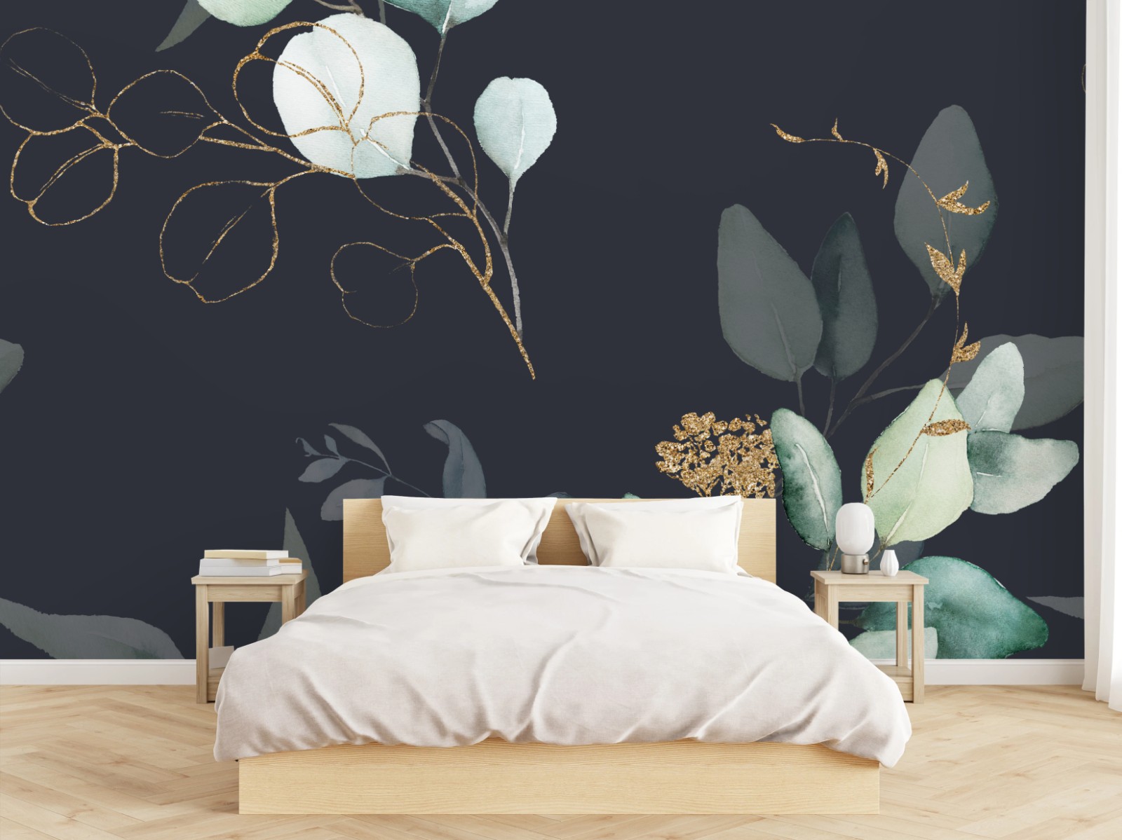 Fototapete Eukalyptus aquarellblätter auf dunklem hintergrund