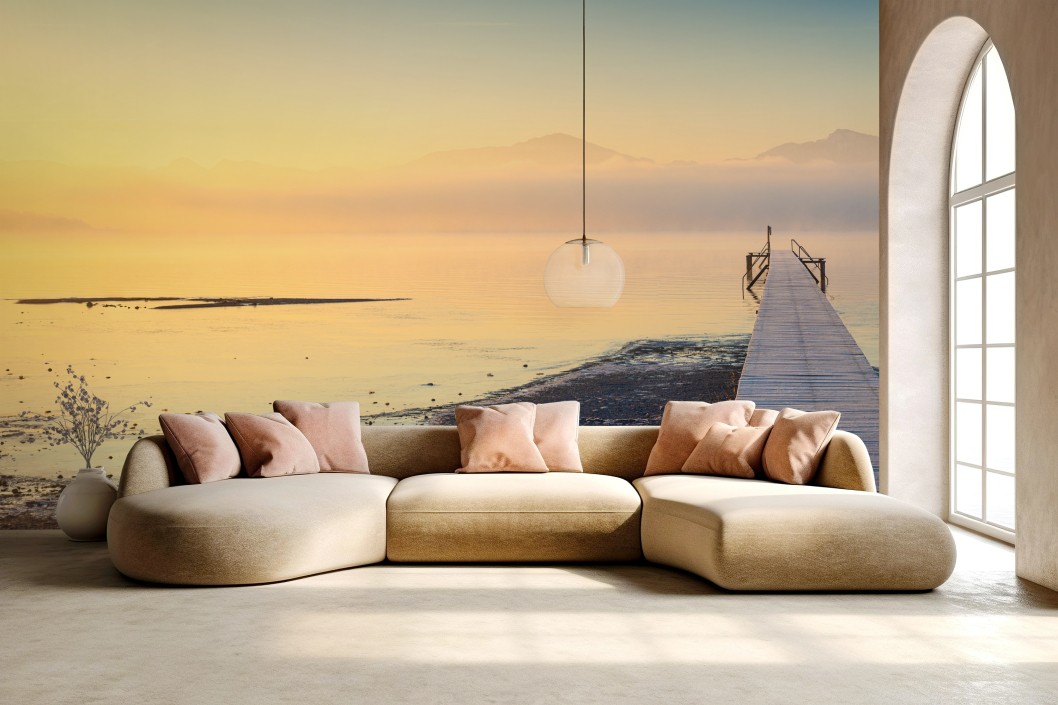 Fototapete Nebliger sonnenaufgang über holzsteg