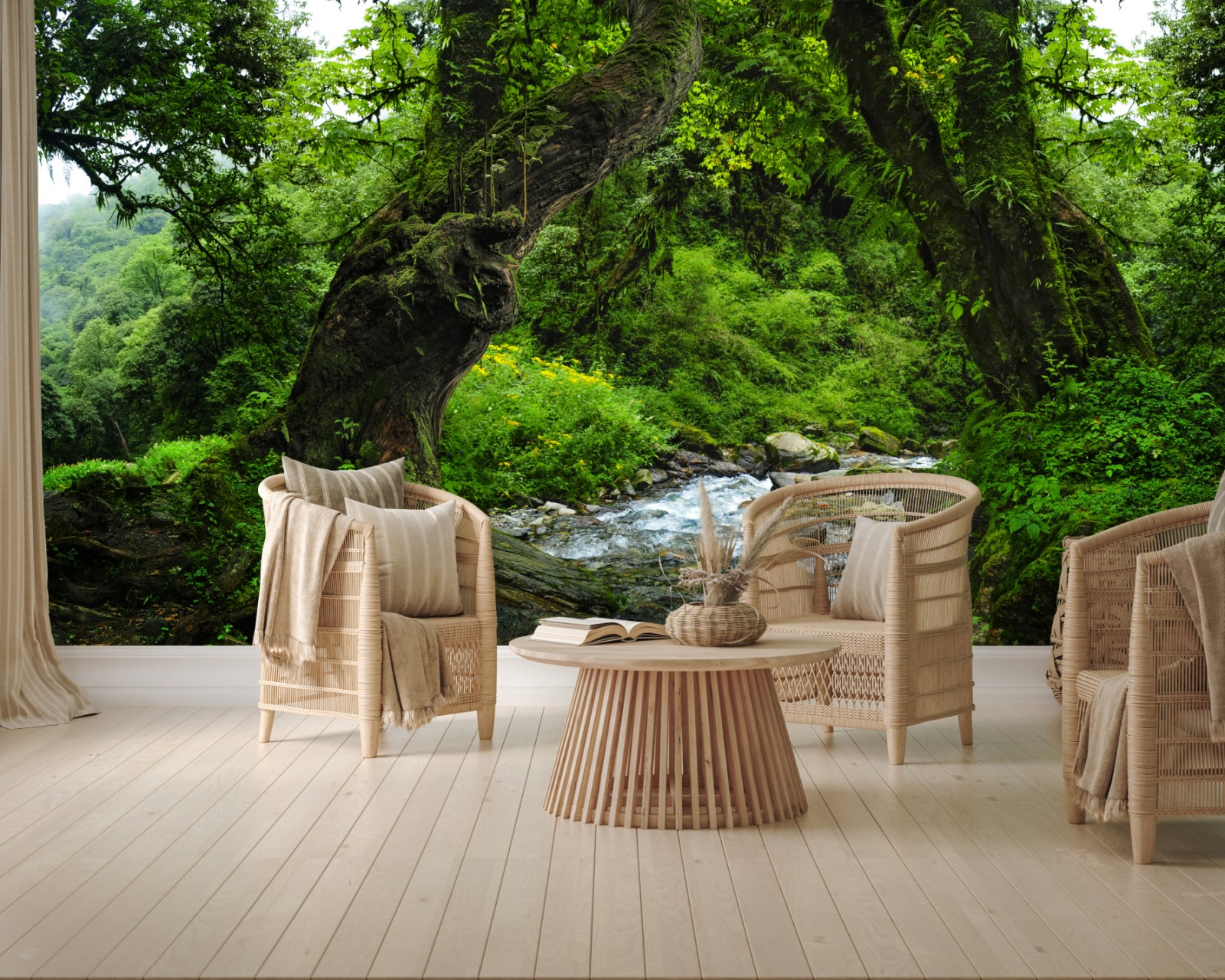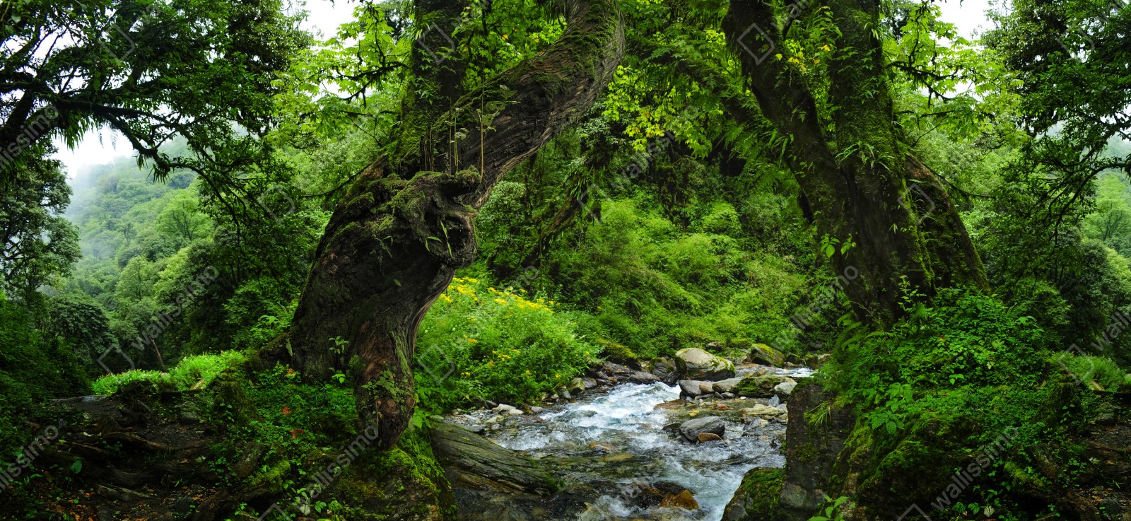 Bringen Sie die beruhigende Energie eines üppigen, moosbedeckten Waldbachs in Ihr Zuhause mit diesem lebendigen Panorama-Druck, ideal für eine naturnahe Atmosphäre.