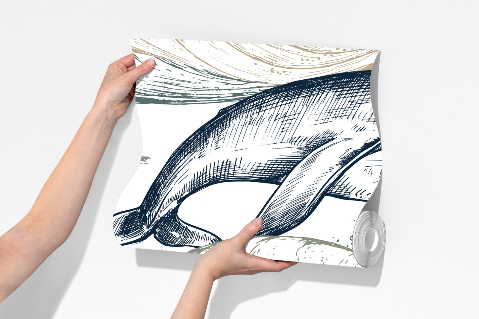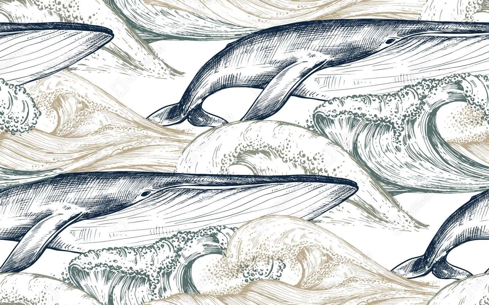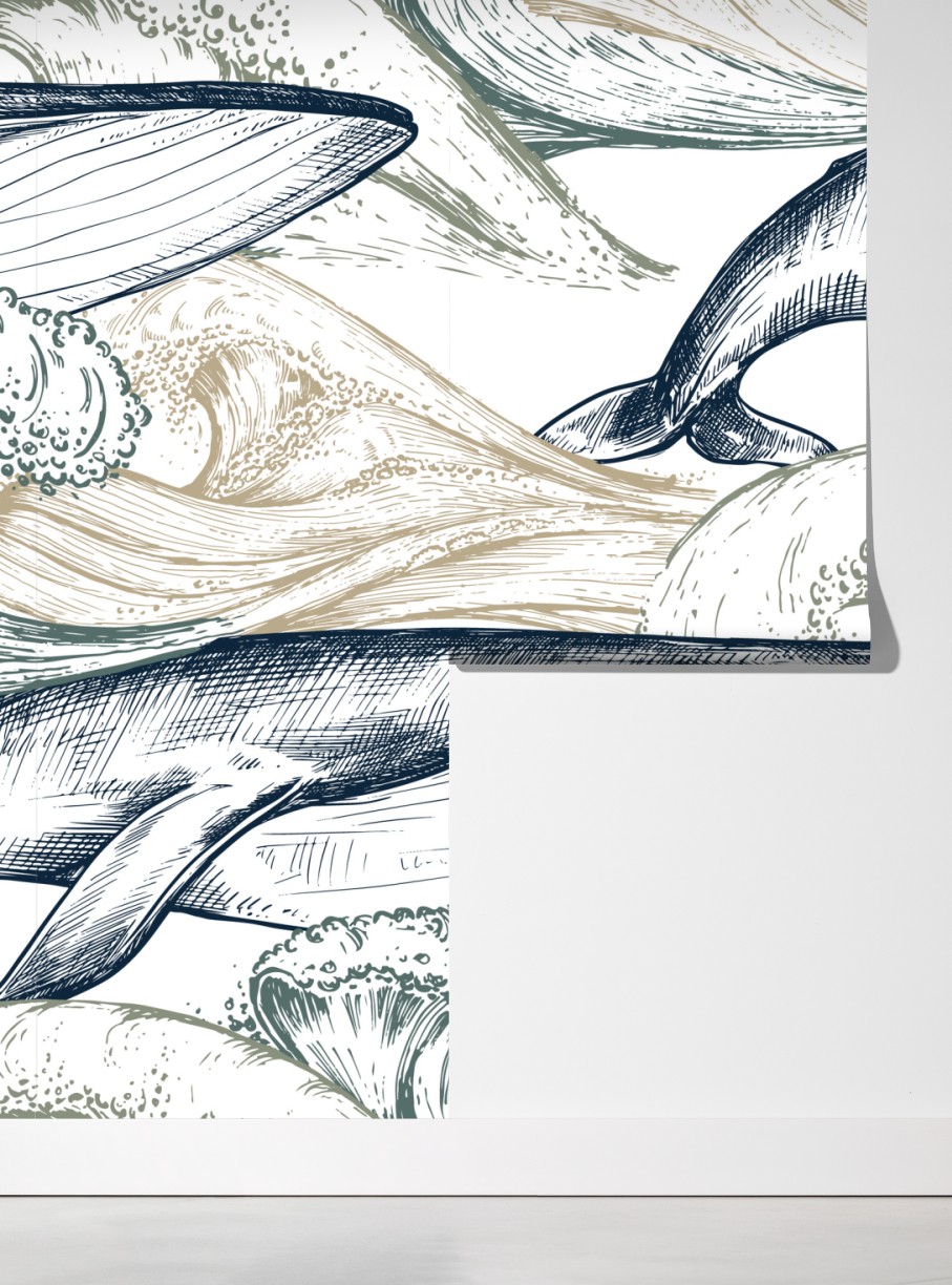 Bringen Sie beruhigende Meeresstimmung in Ihr Zuhause mit dieser handgezeichneten Darstellung von Walen und Wellen. Die gedämpfte Blau- und Beigetöne schaffen eine zeitlose und entspannte Atmosphäre.