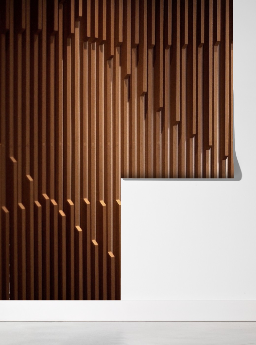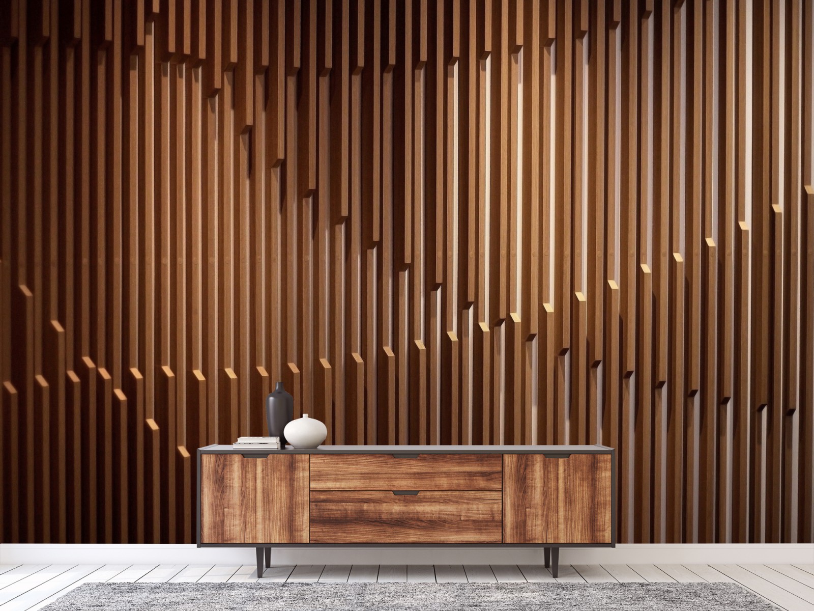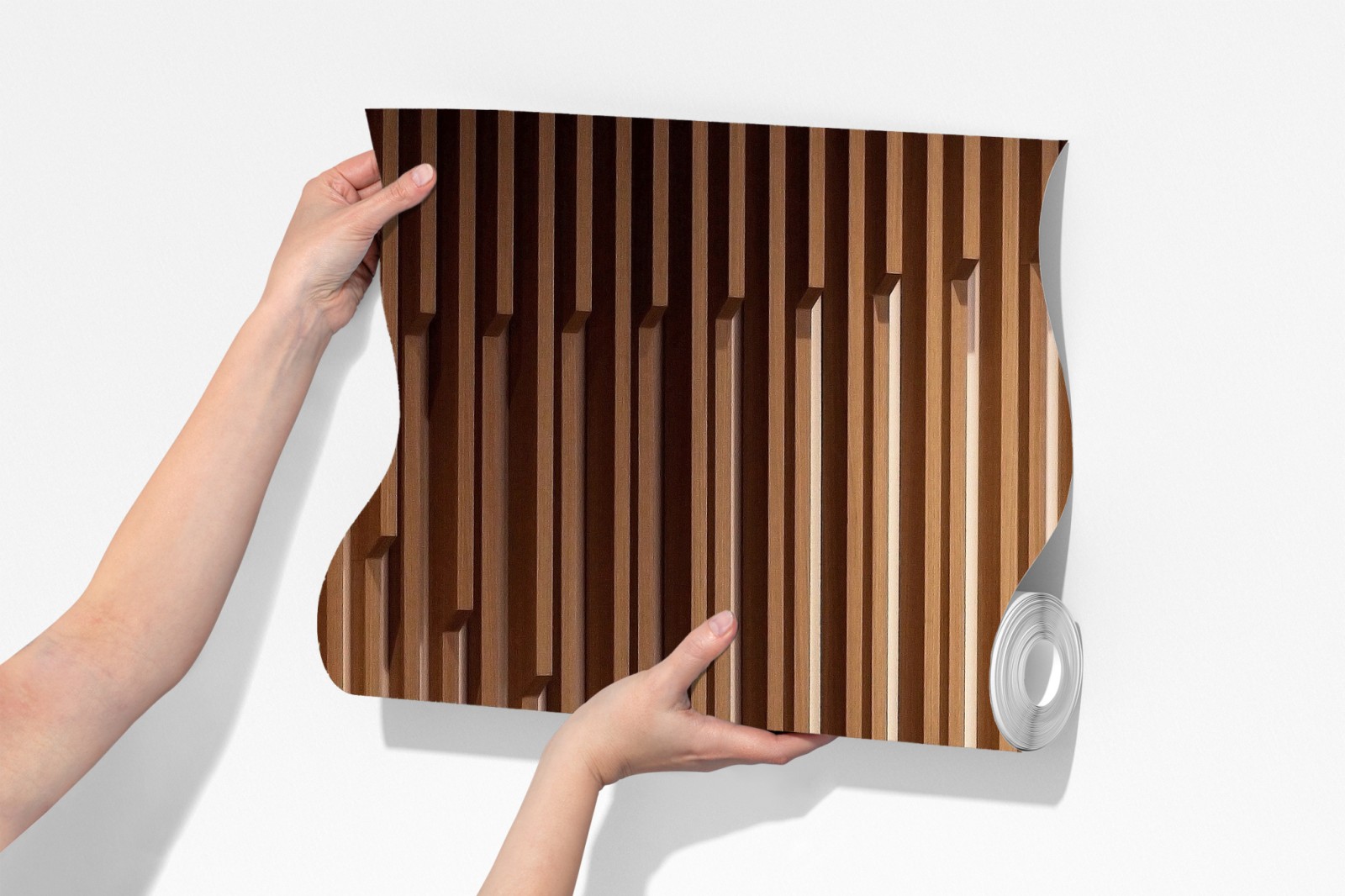 Bringen Sie skandinavische Wärme und Struktur in Ihr Interieur mit diesem vertikalen Muster aus Holzlamellen, ideal für Akzentwände und modernes Design.