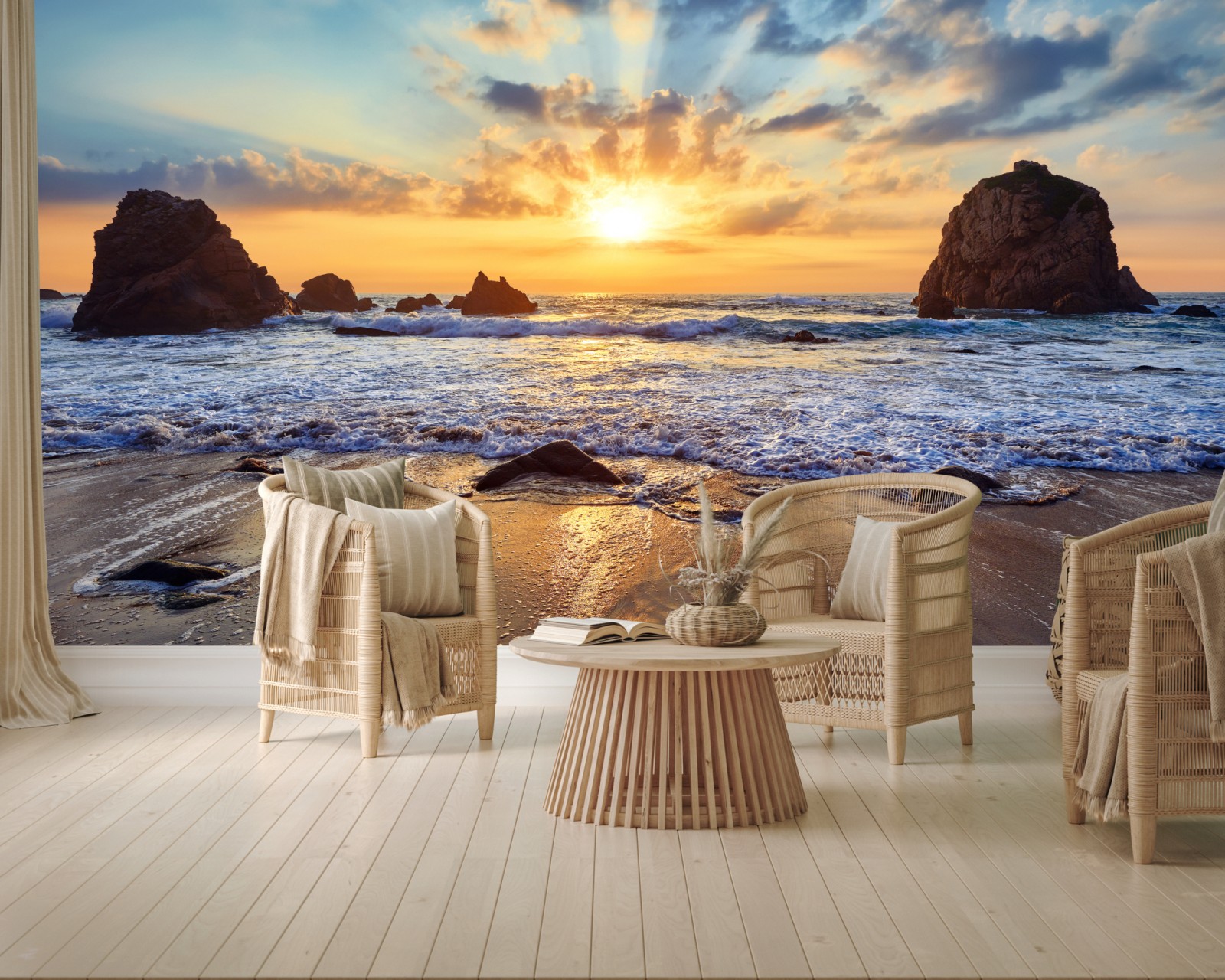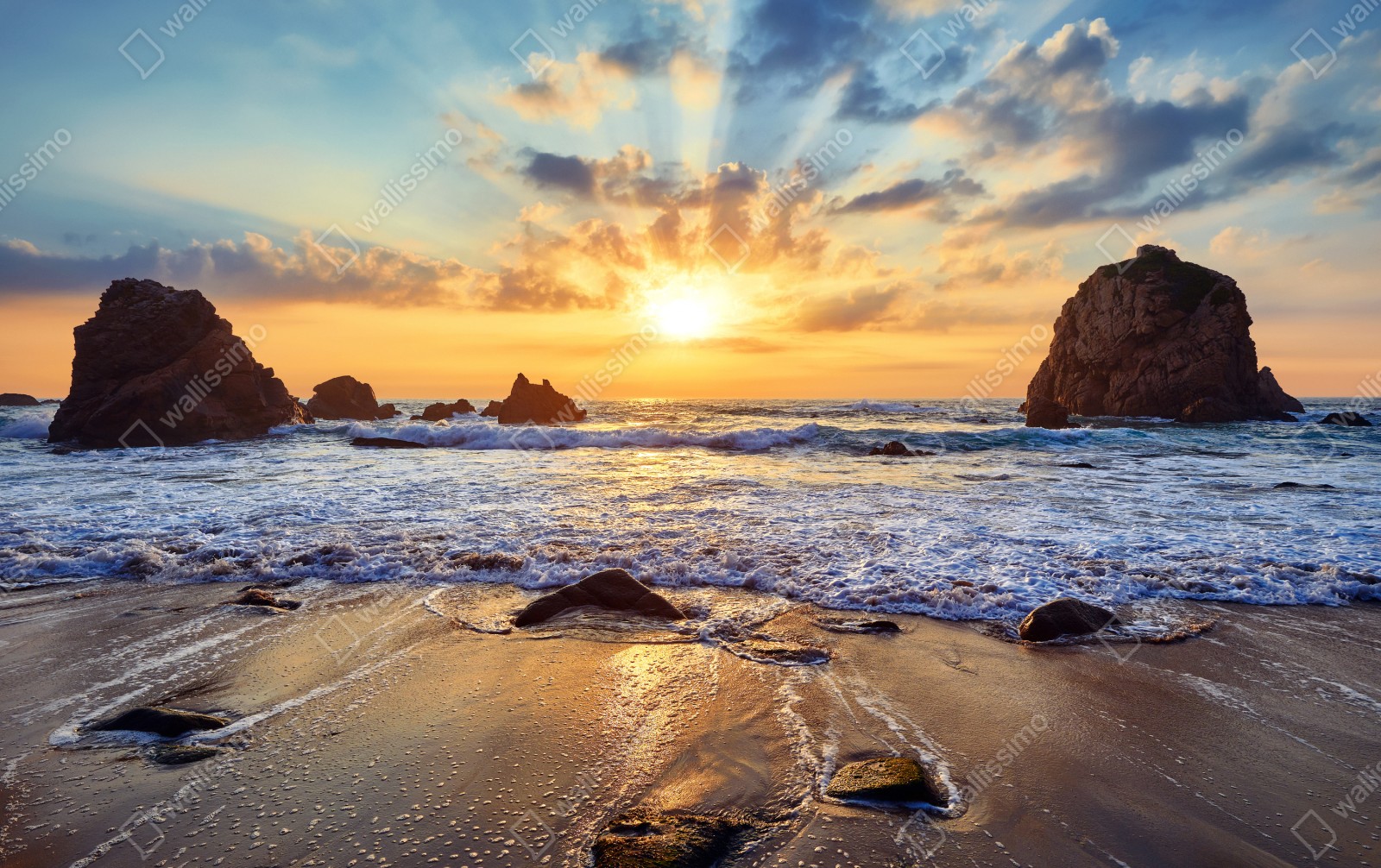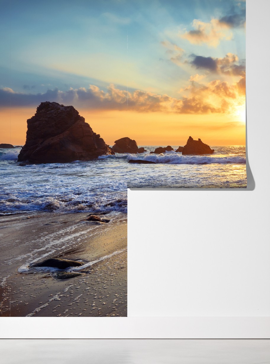 Bringen Sie beruhigende Meeresstimmung in Ihr Zuhause mit einem goldenen Sonnenuntergang über einem felsigen Strand eingefangen in lebendigen Farben.