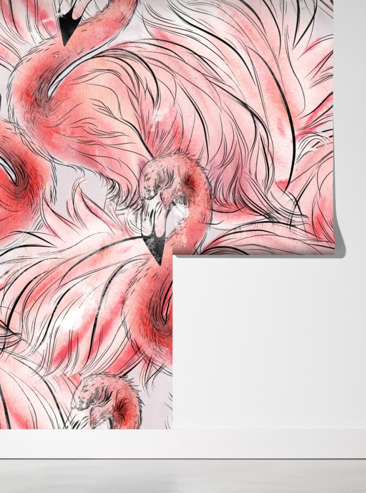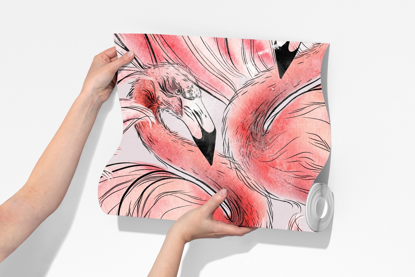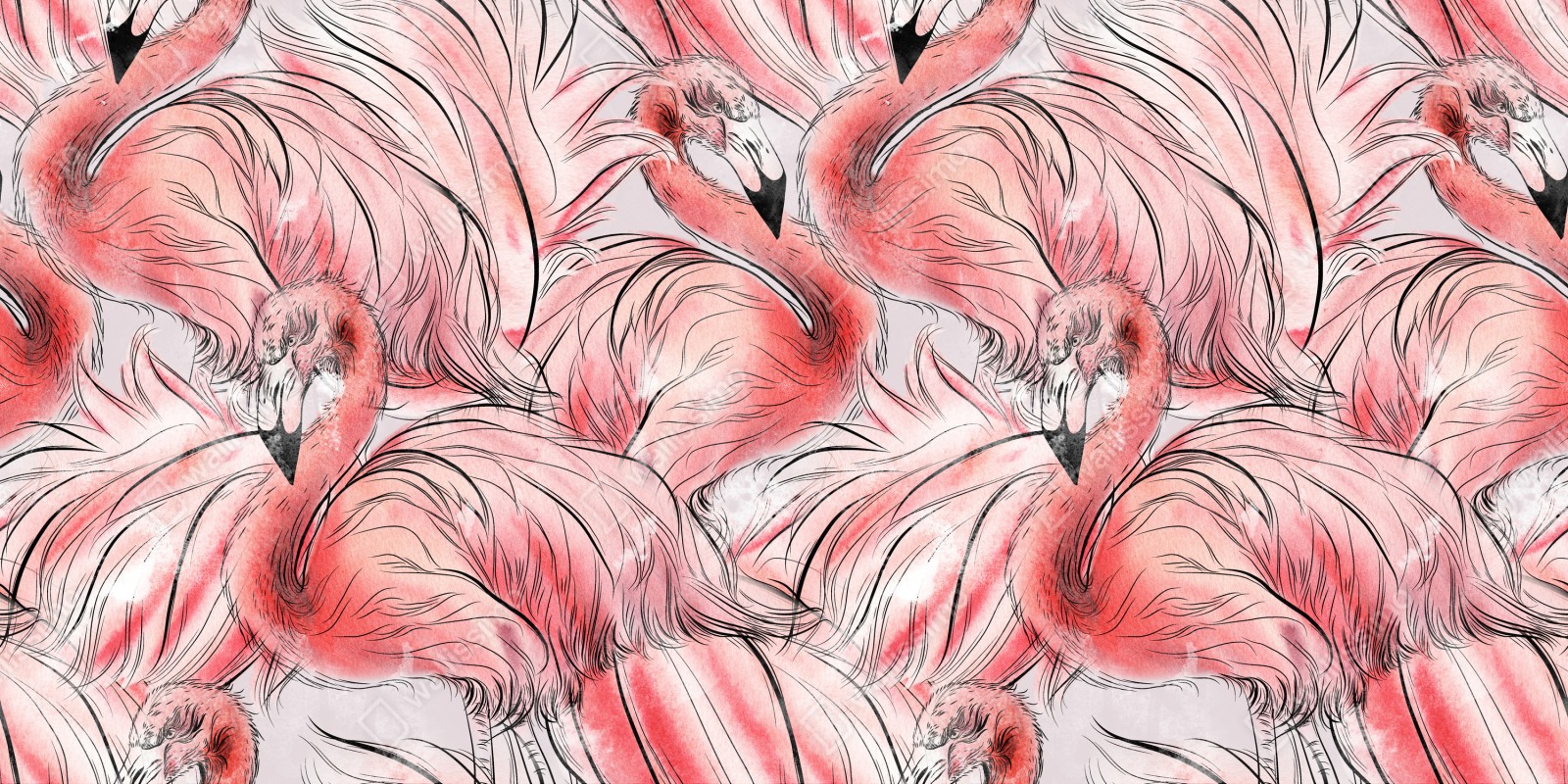 Verleihen Sie jedem Raum tropischen Charme mit diesem Aquarell-Flamingo-Nahtlosmuster; zarte rosafarbene Töne und elegante Federstriche schaffen eine verspielte und zugleich stilvolle Atmosphäre.