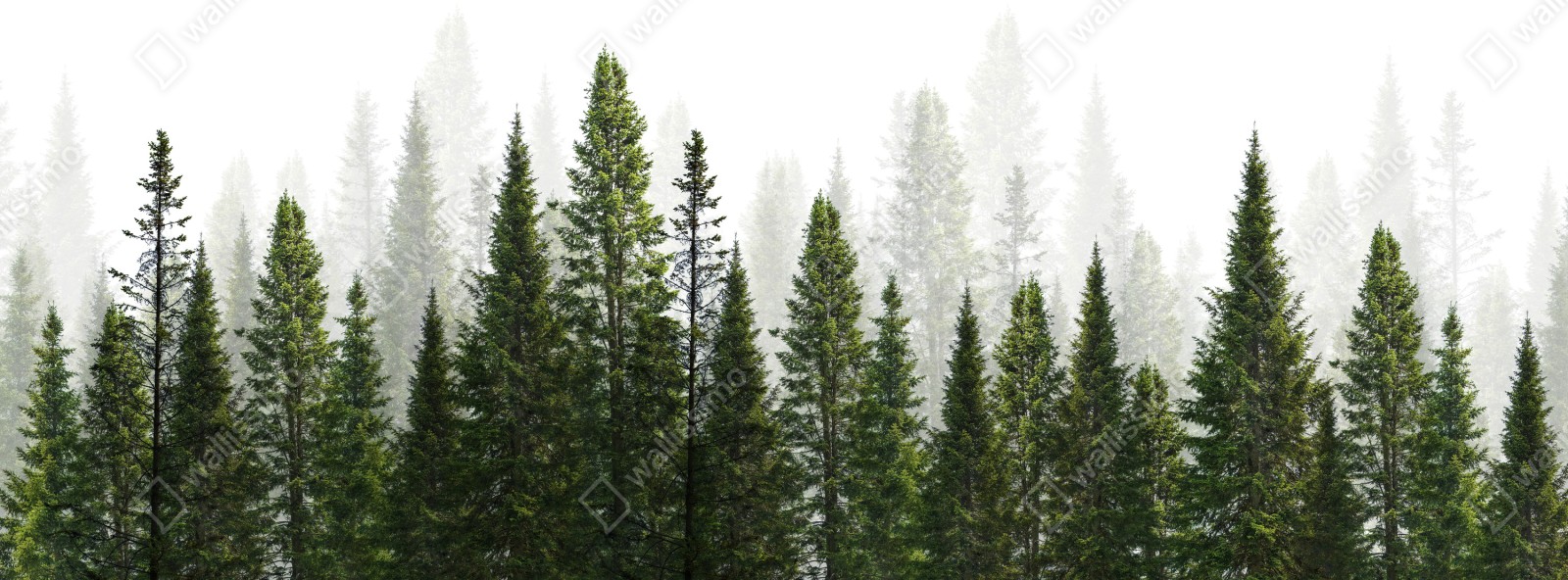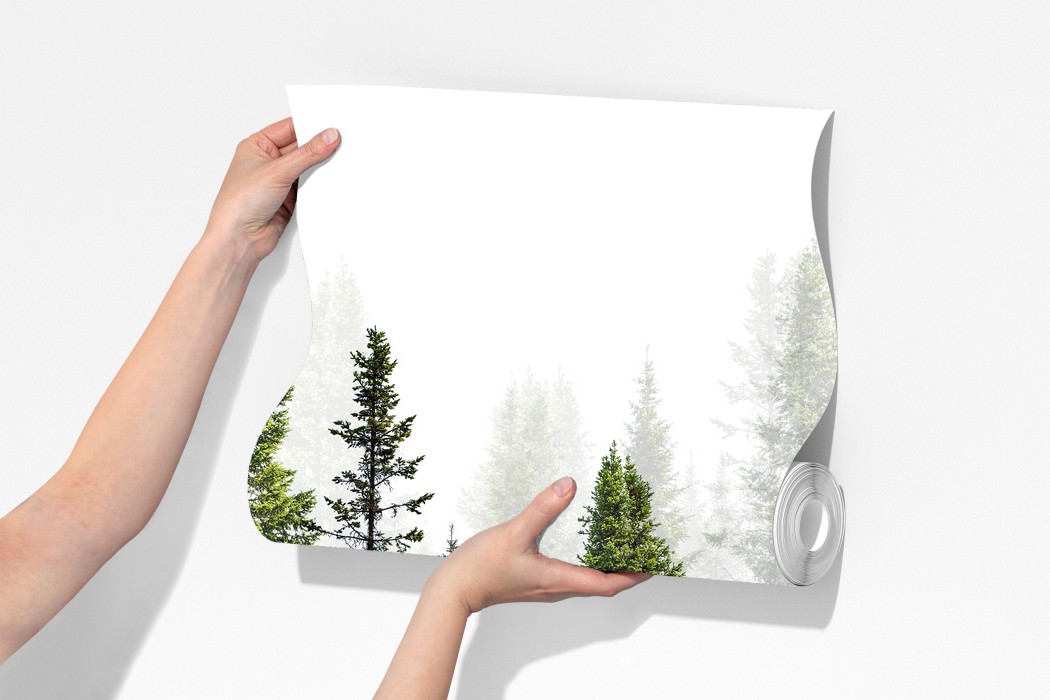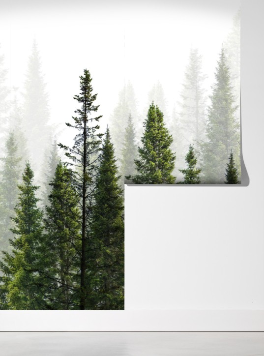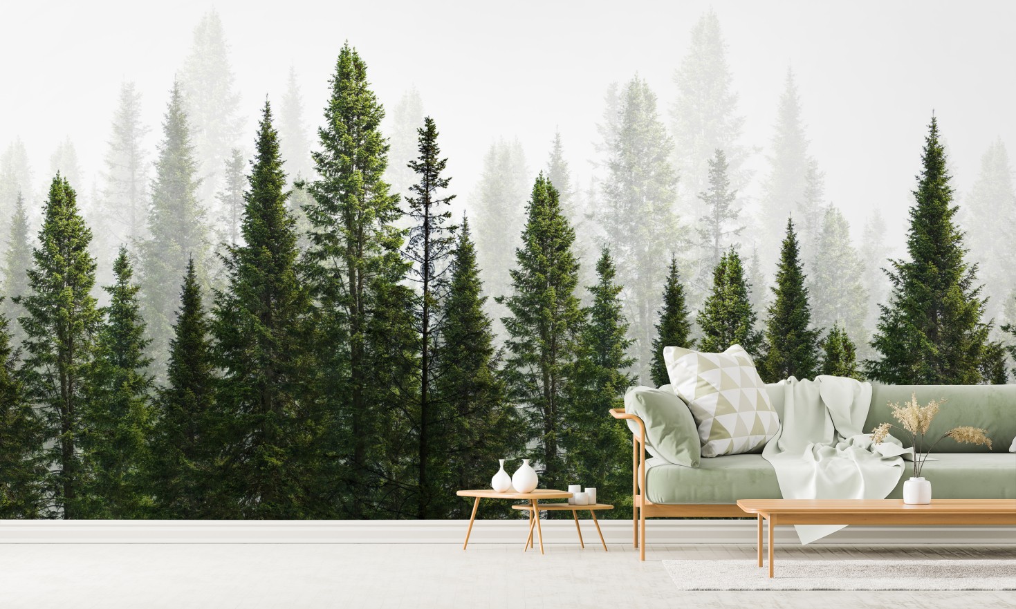 Bringen Sie beruhigende immergrüne Natur in Ihr Zuhause mit einem nebligen Tannenwald, der eine entspannende Atmosphäre schafft.