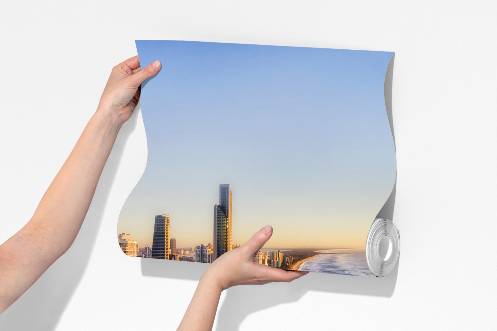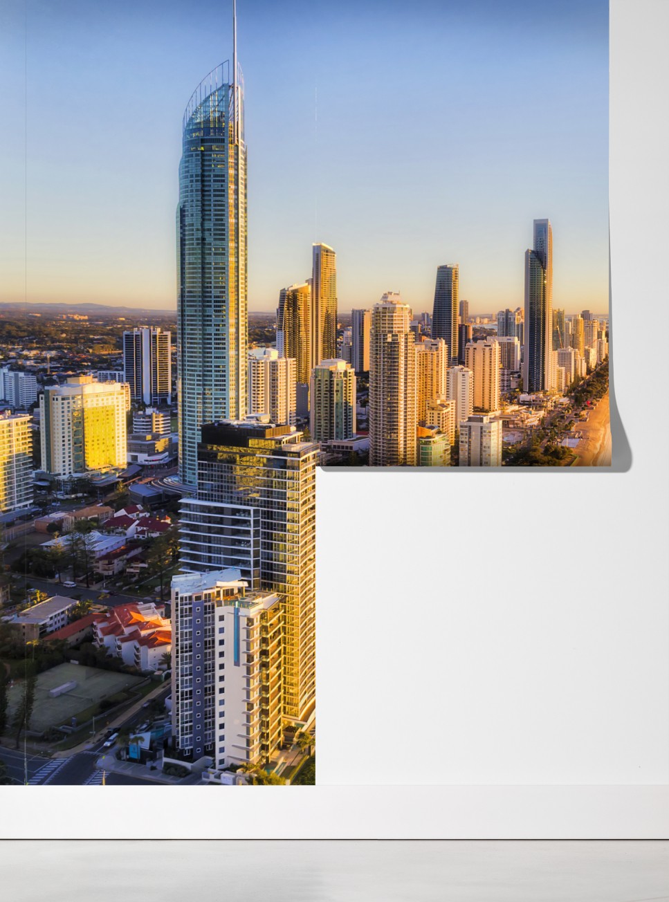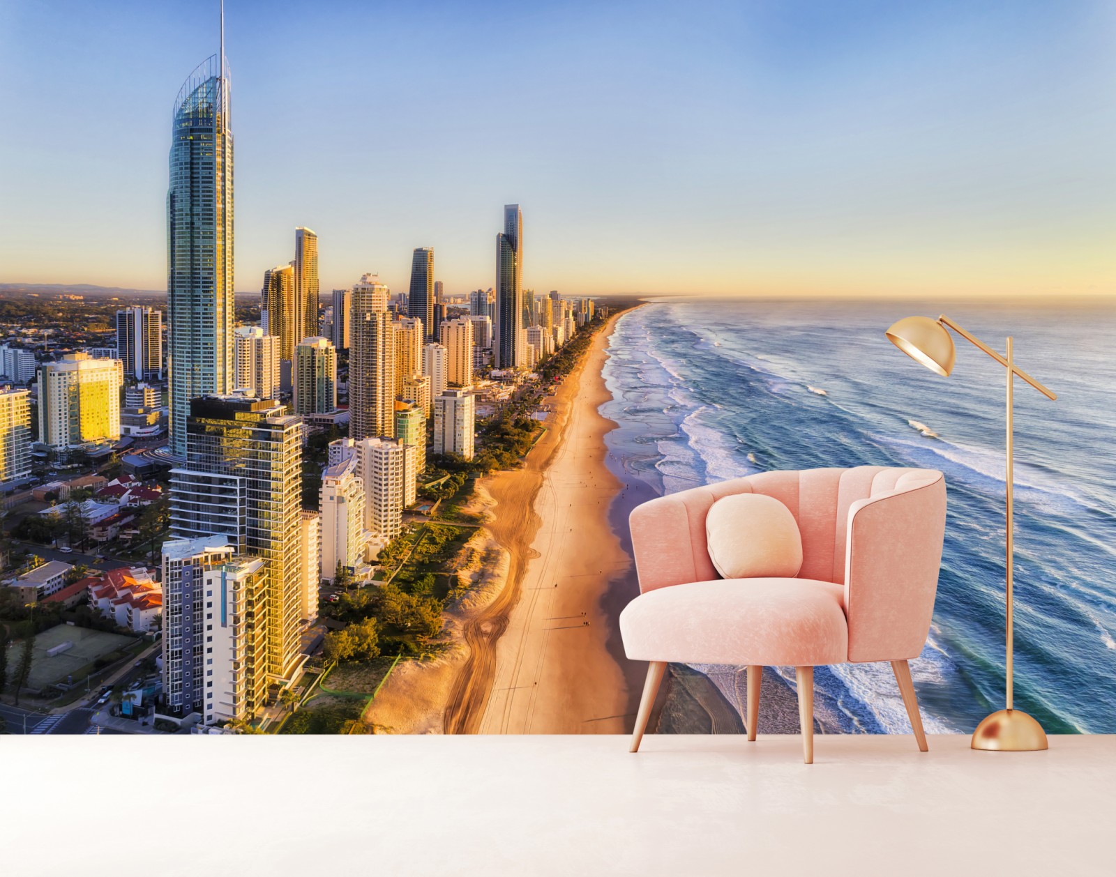 Luftaufnahme von Surfers Paradise Strand und Skyline bei Sonnenaufgang, perfekt um maritimen Flair und urbane Eleganz in jedes Zuhause zu bringen.
