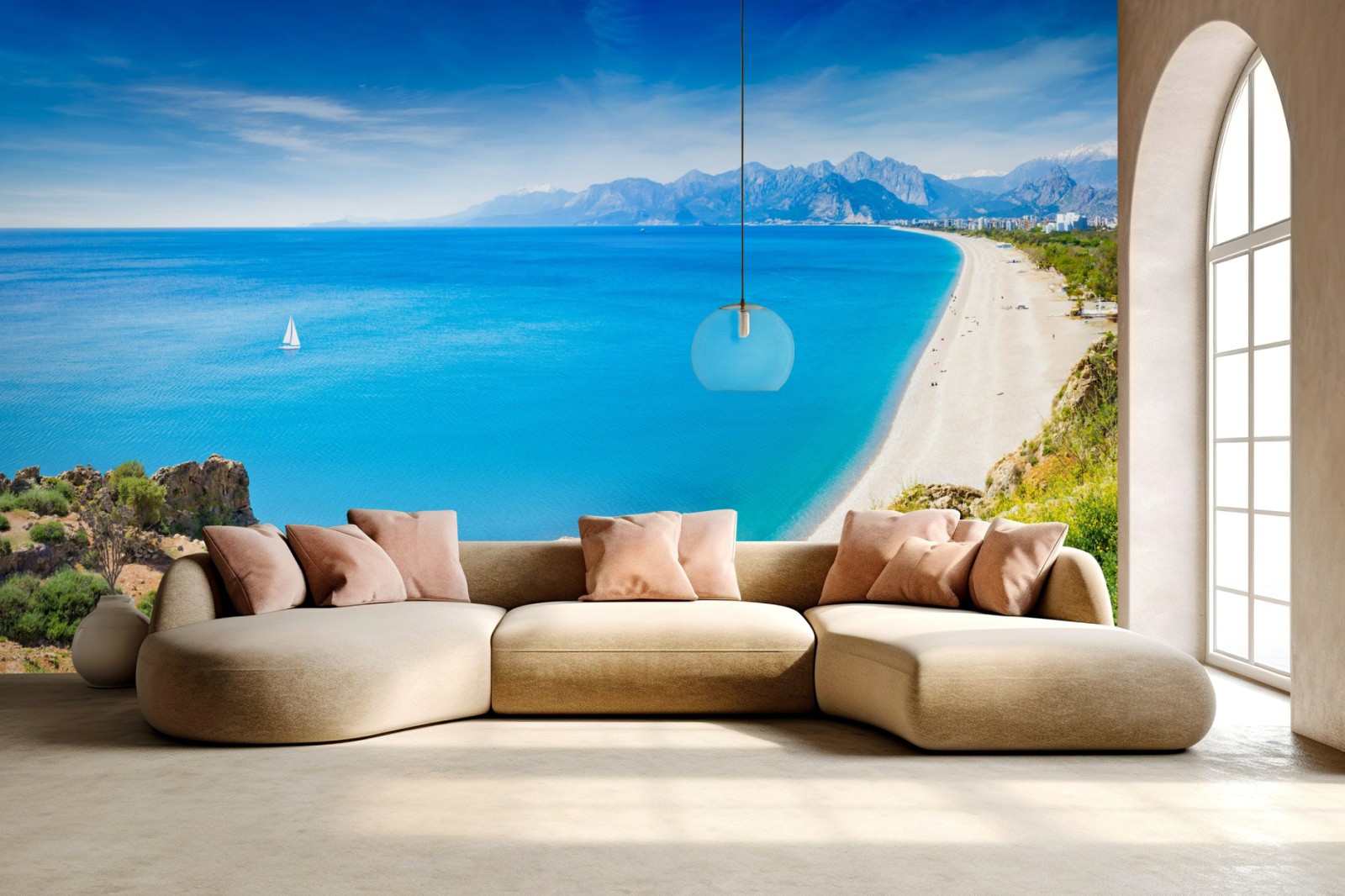 Bringen Sie das ruhige türkisfarbene Meer und die weite Küste von Konyaalti mit diesem lebendigen Panorama in Ihr Zuhause.