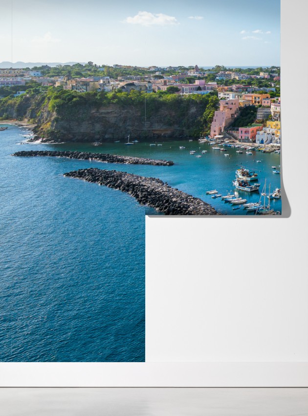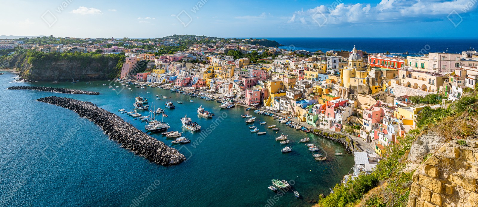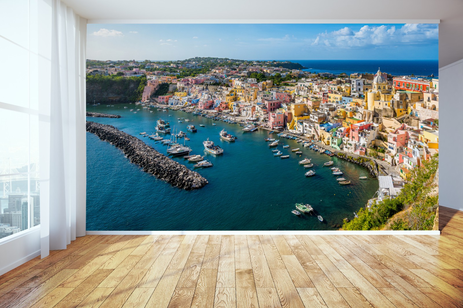 Bringen Sie mediterrane Urlaubsstimmung in Ihr Zuhause mit dieser Panoramaaufnahme eines bunten Küstenhafens, ideal zum Dekorieren von Wohnräumen.