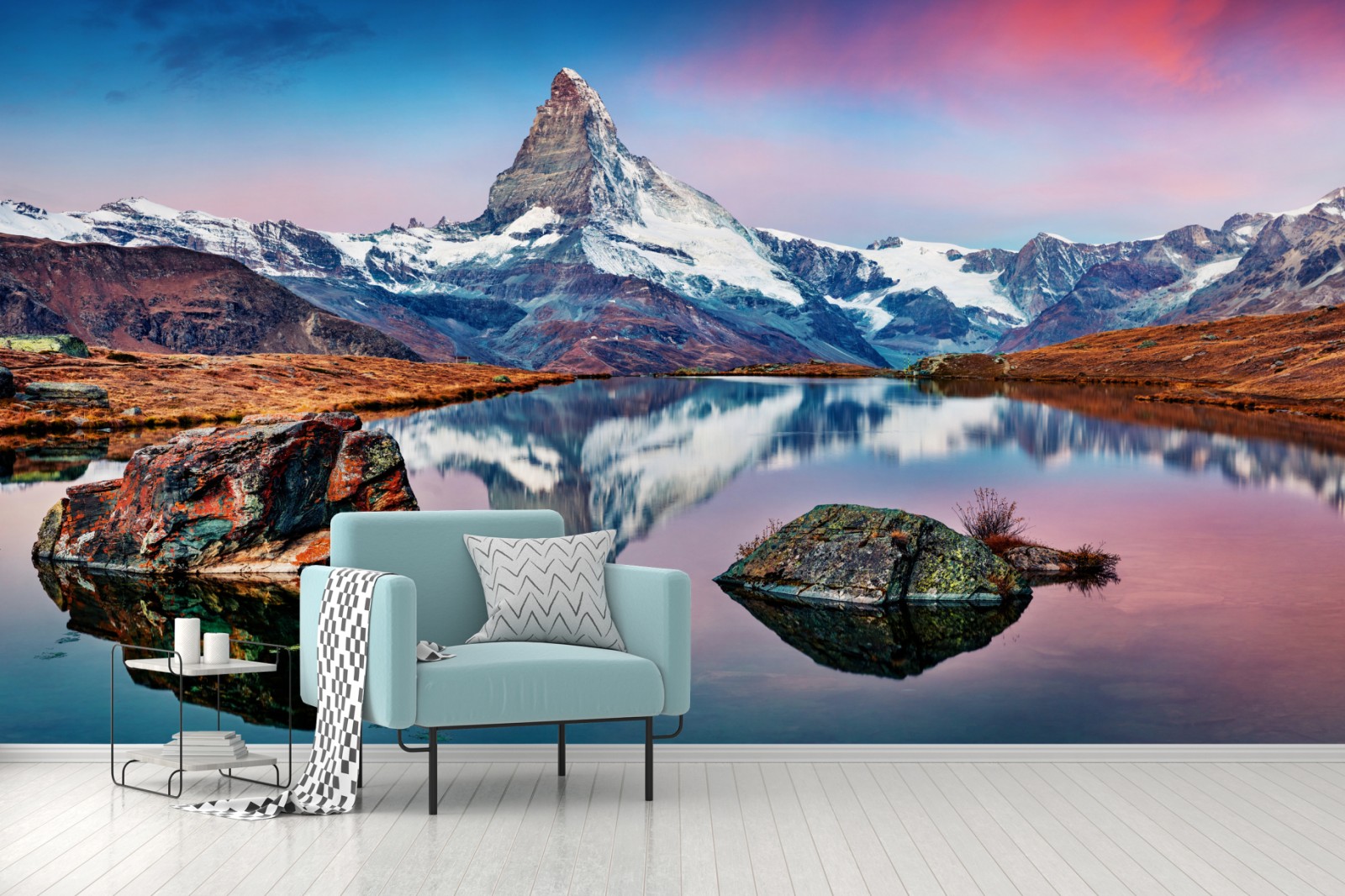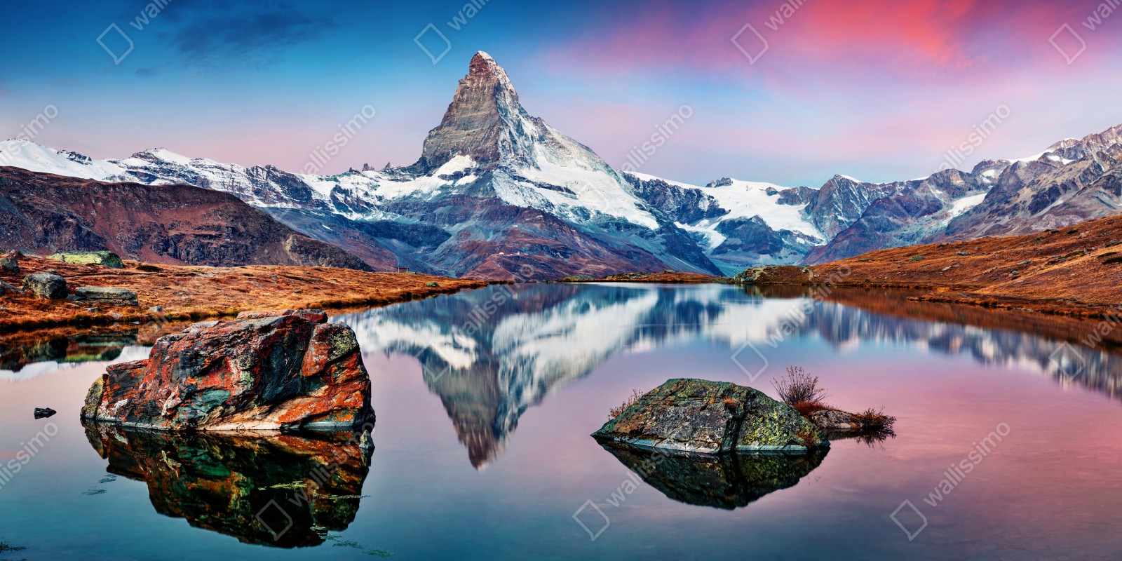 Erleben Sie die ruhige Schönheit des Matterhorns, gespiegelt im Stellisee bei Sonnenaufgang, und bringen Sie alpine Stimmung in Ihr Zuhause.