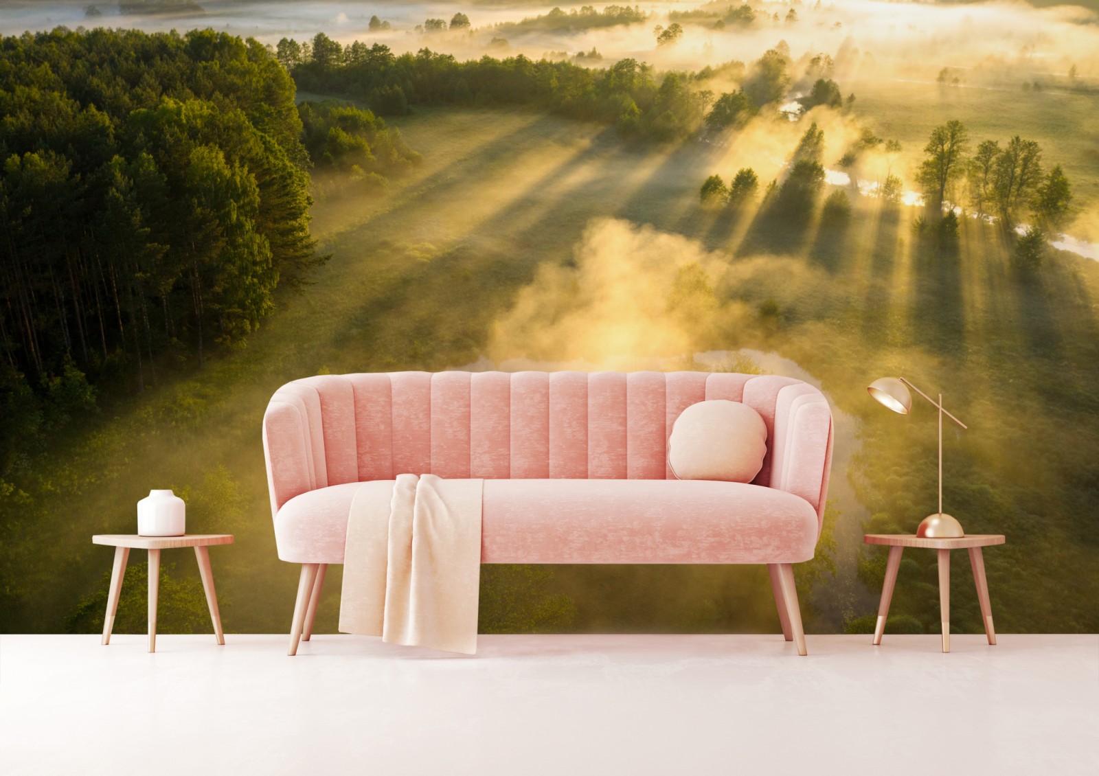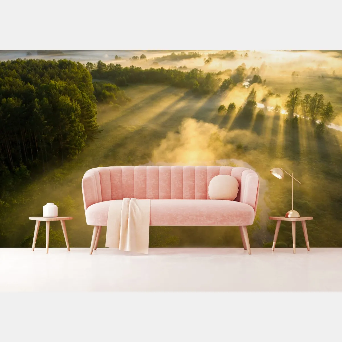Fototapete goldener morgen über nebligem fluss