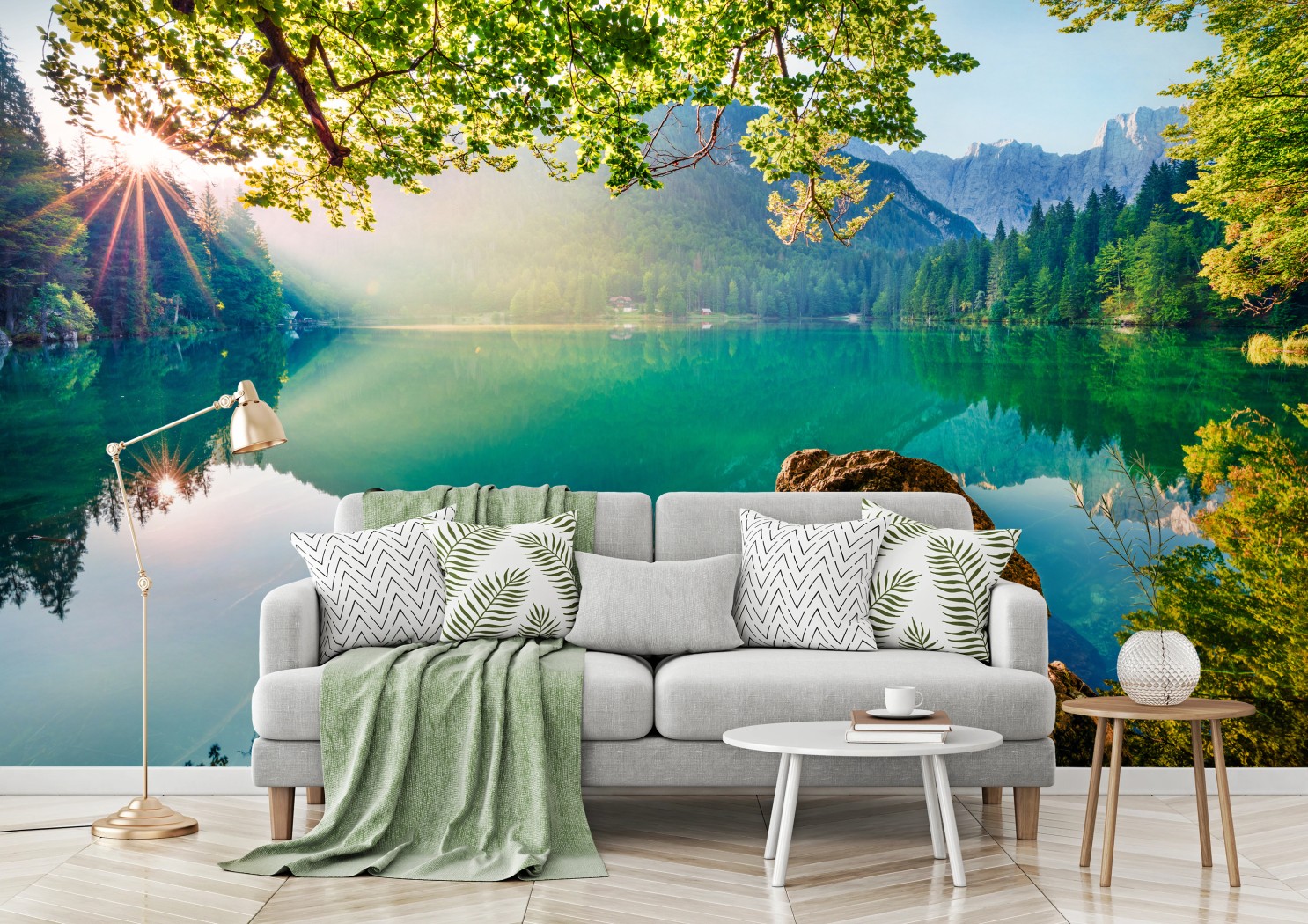Fototapete Morgendliche szene am Fusine-see mit Mangart
