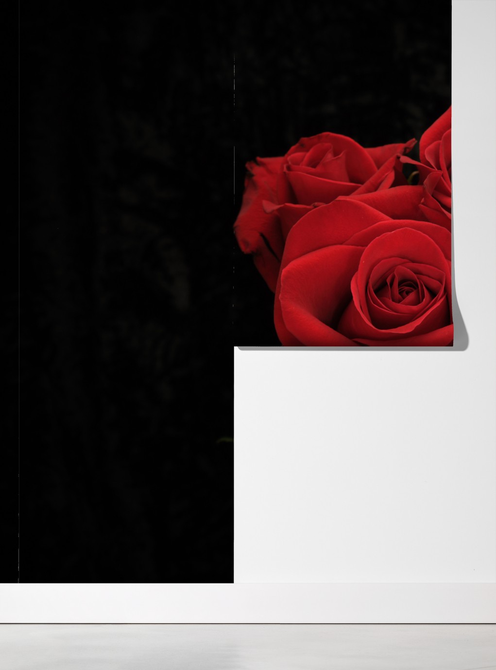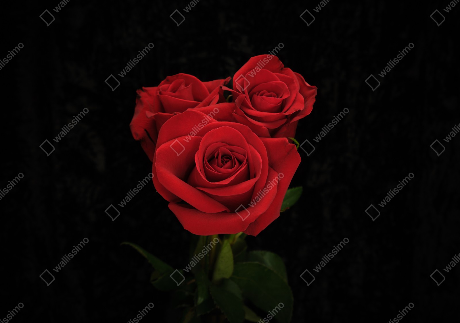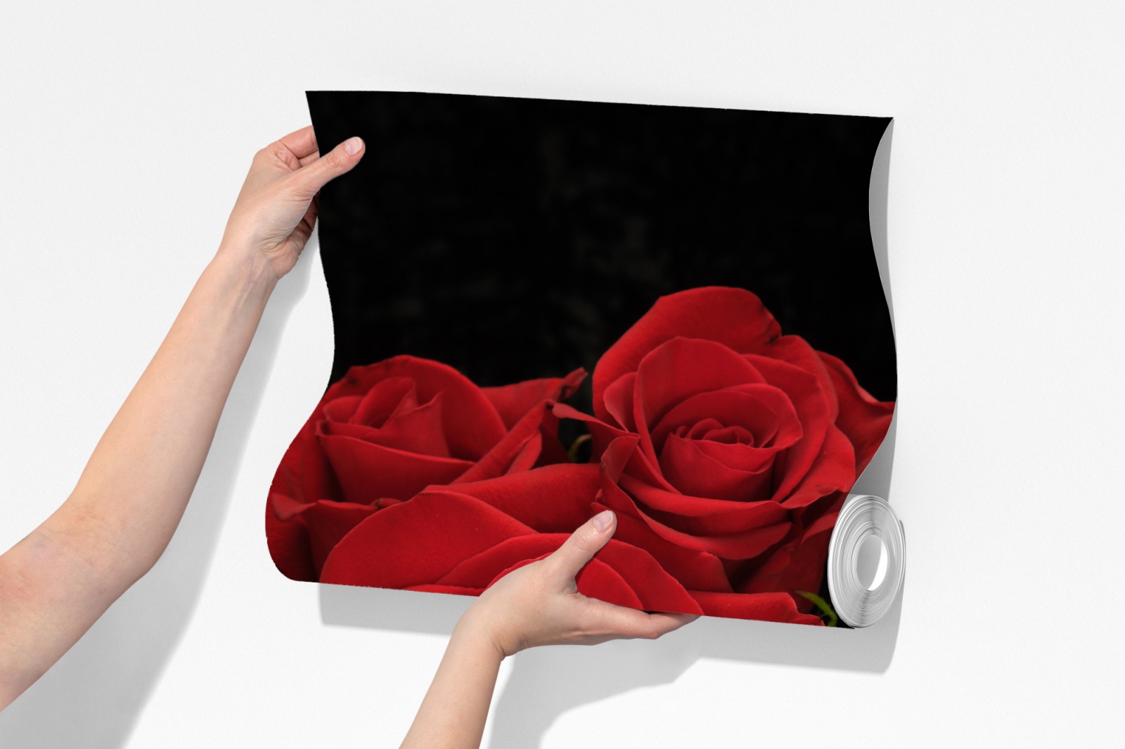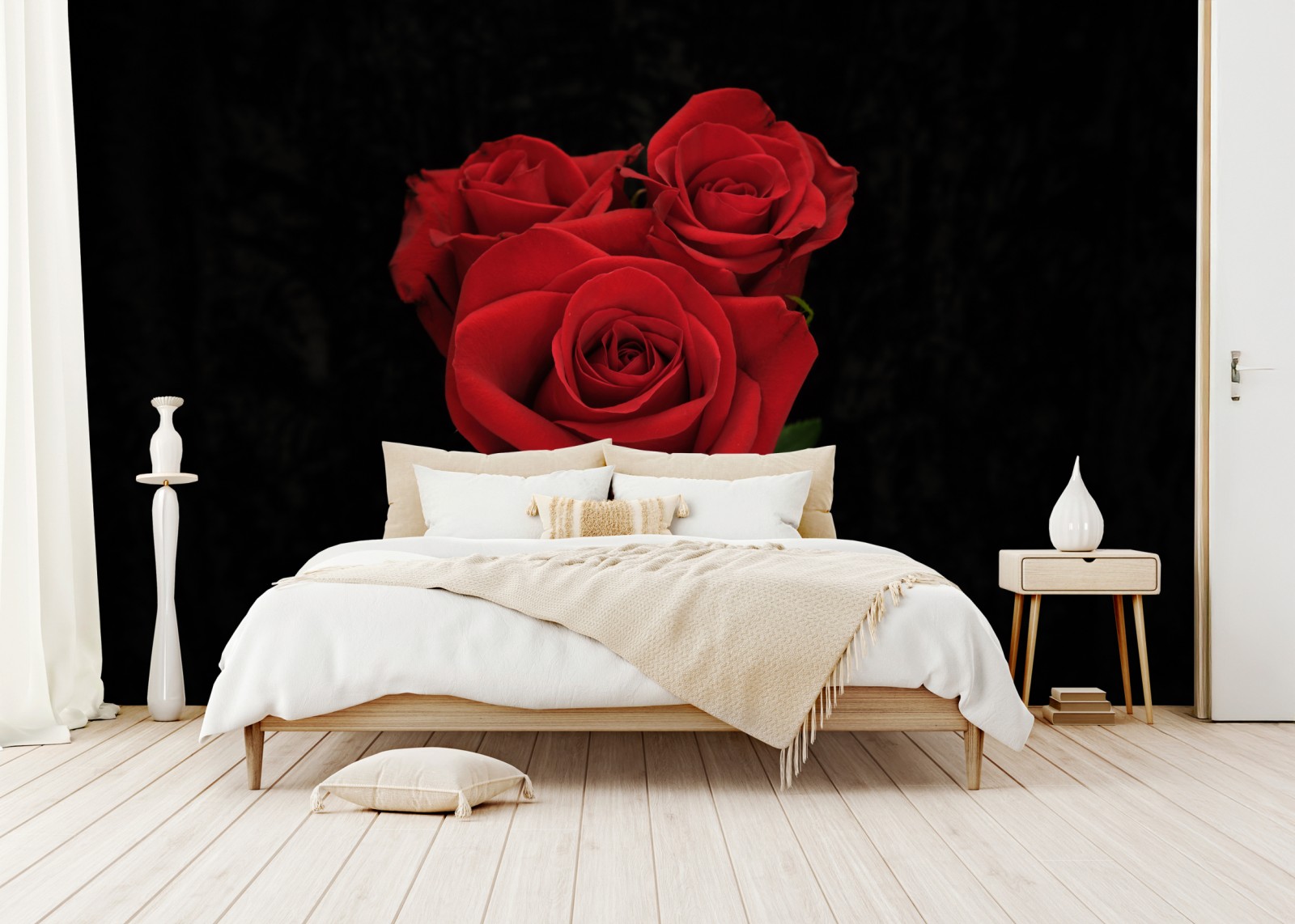 Verleihen Sie Ihrem Raum romantische und elegante Atmosphäre mit einer Nahaufnahme roter Rosen vor tiefschwarzem Hintergrund.