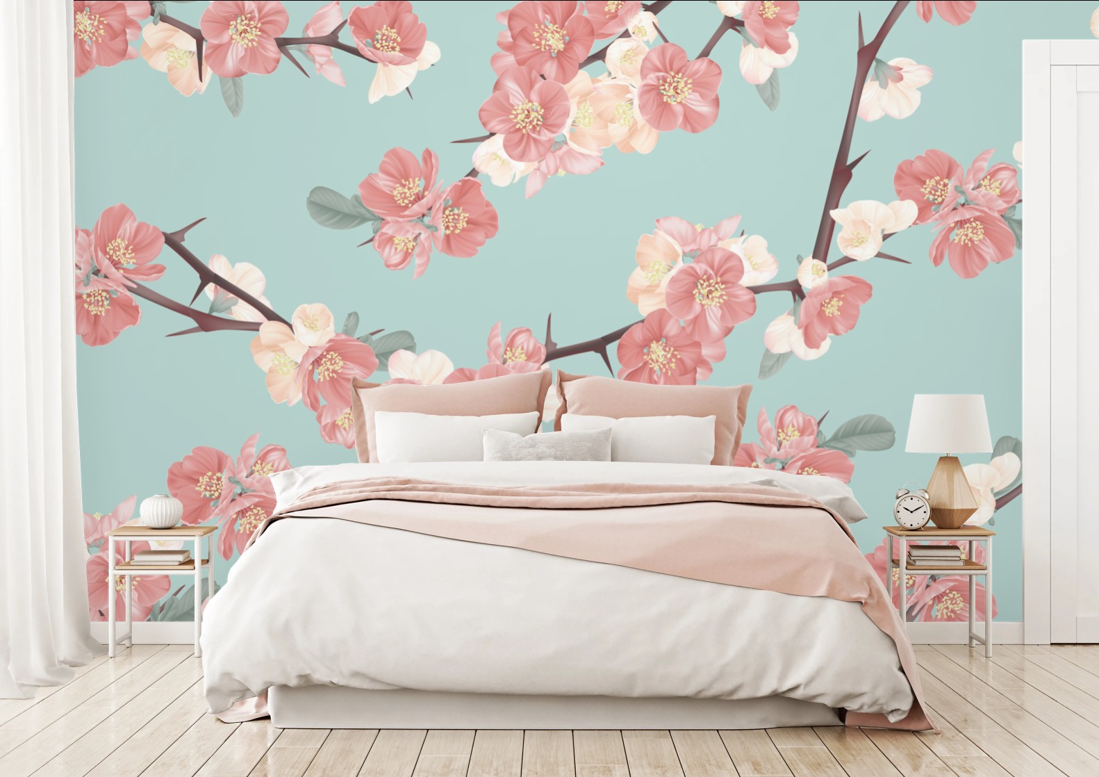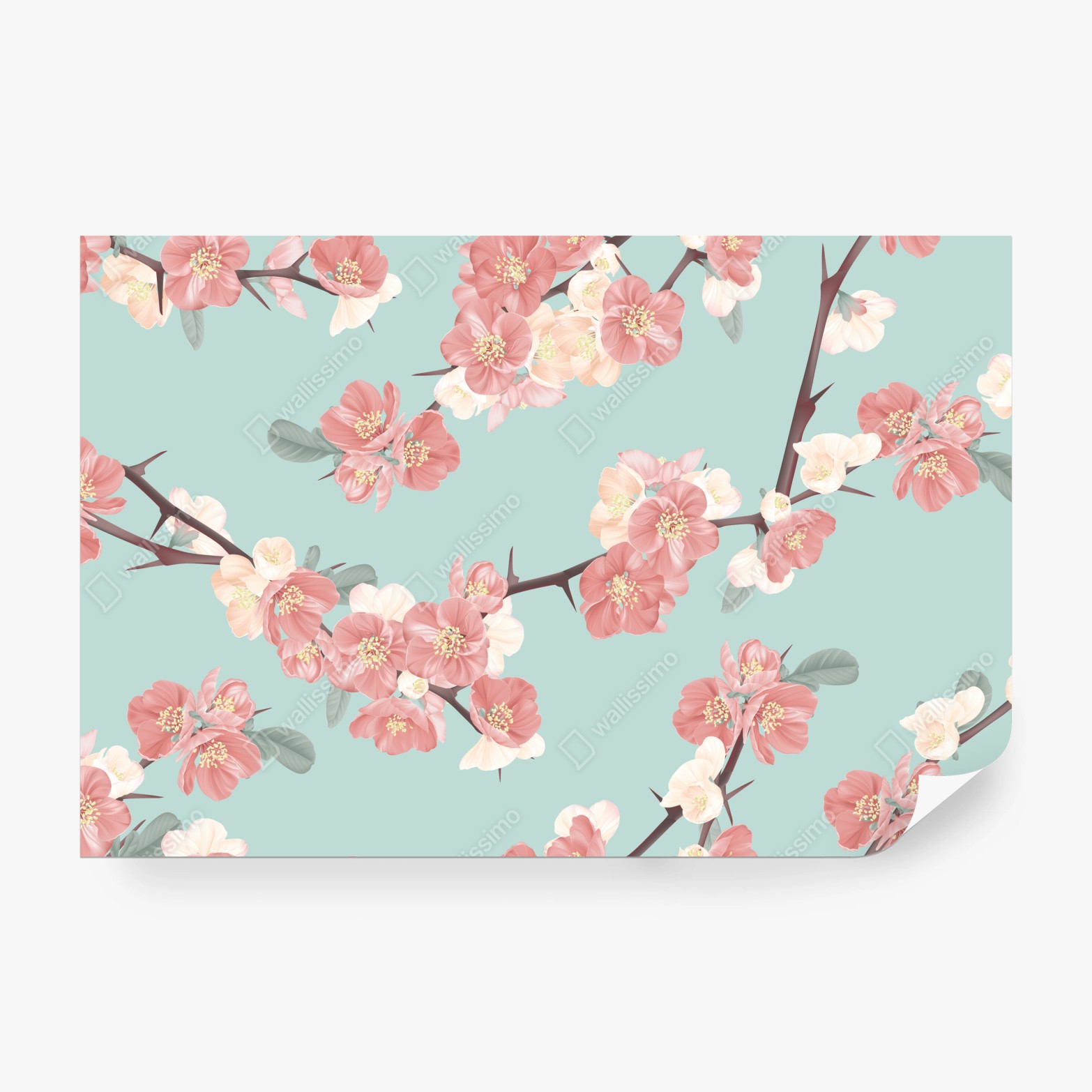 Fototapete Pastelliges kirschblütenmuster auf mintfarbenem hintergrund