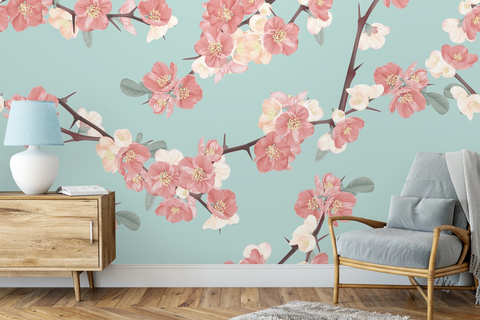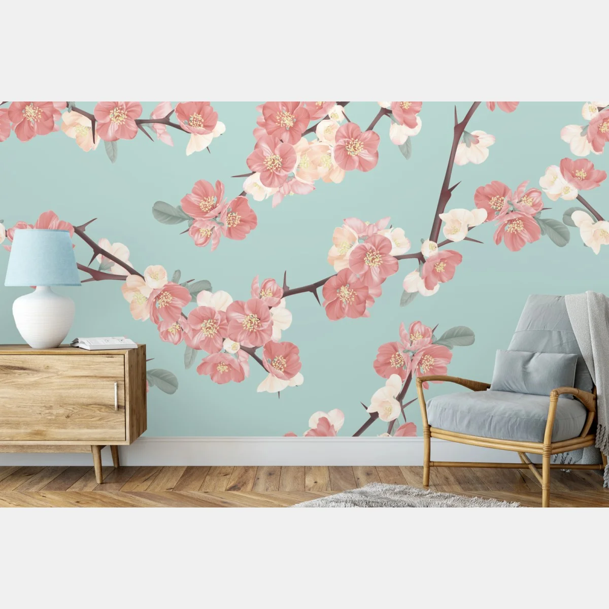 Fototapete Pastelliges kirschblütenmuster auf mintfarbenem hintergrund