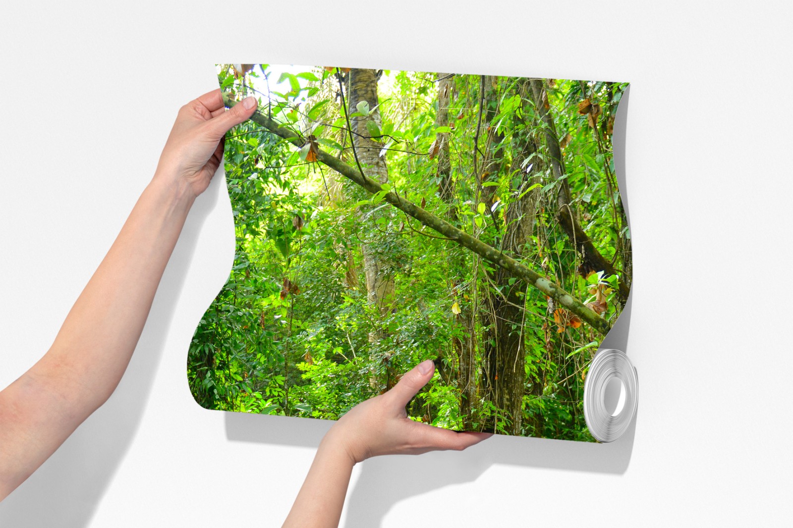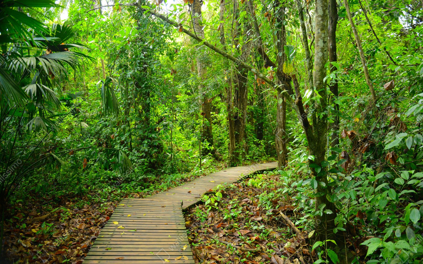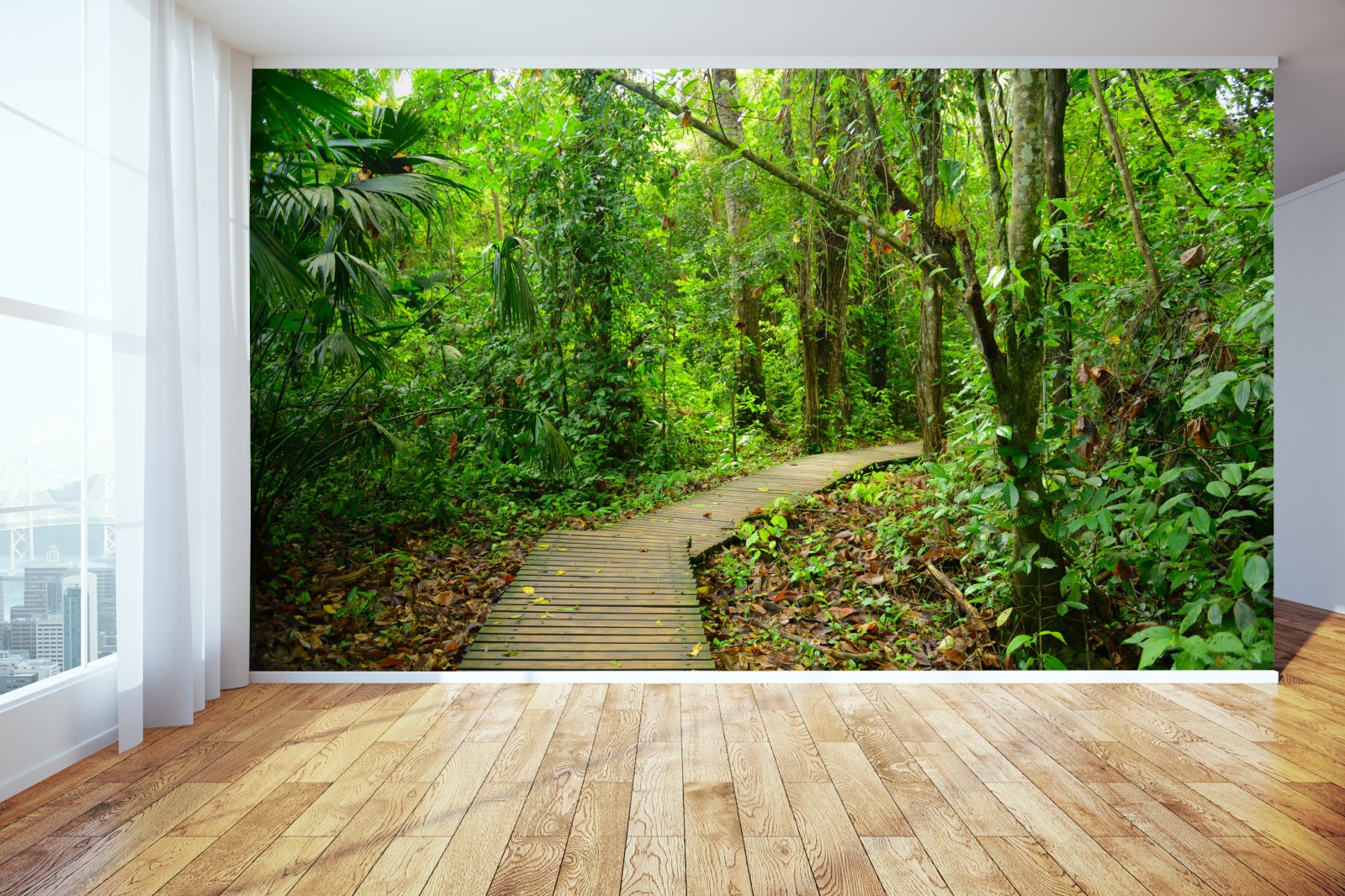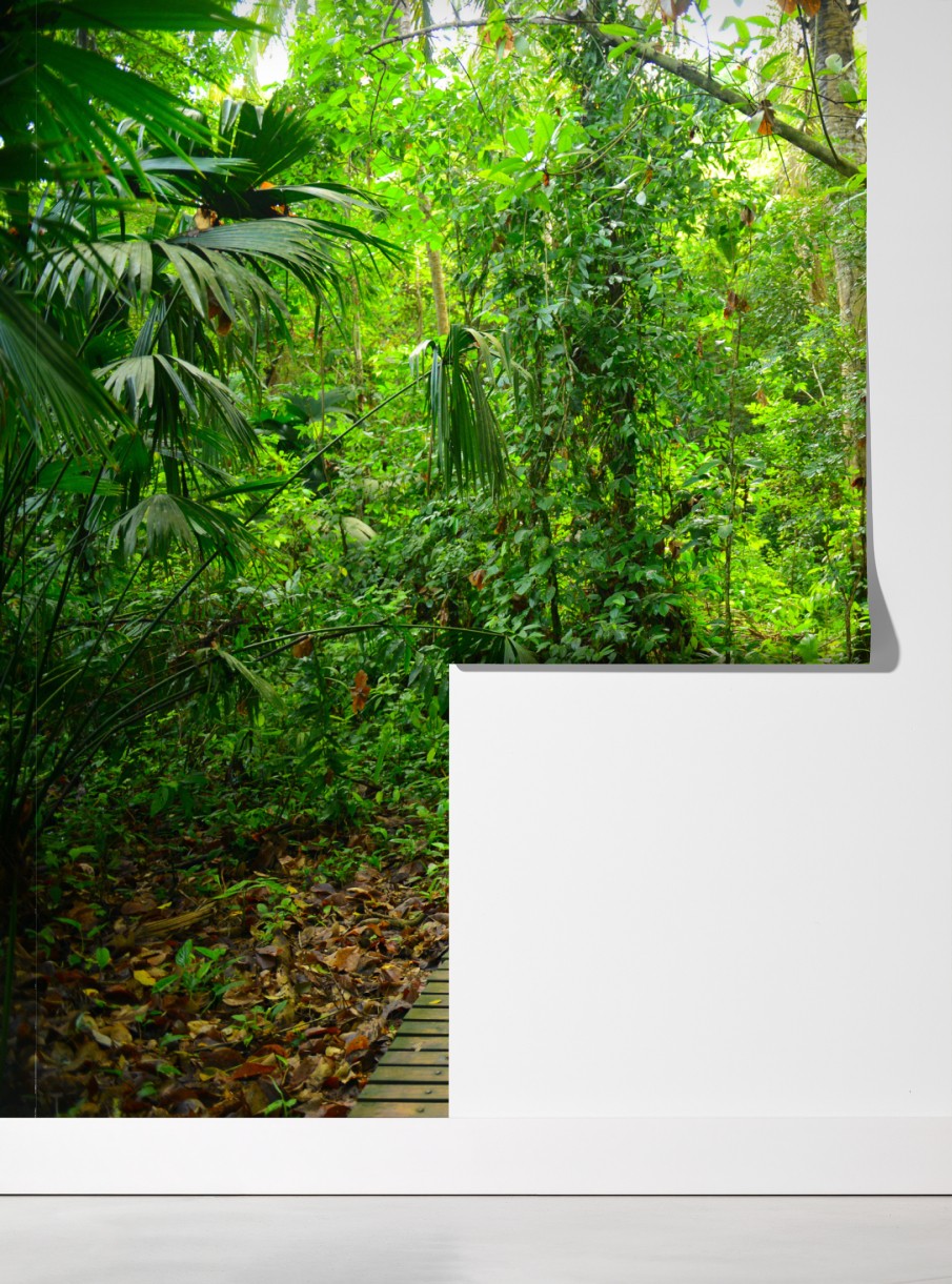 Bringen Sie die beruhigende Atmosphäre eines tropischen Regenwaldes in Ihr Zuhause mit dieser üppigen Stegszene.