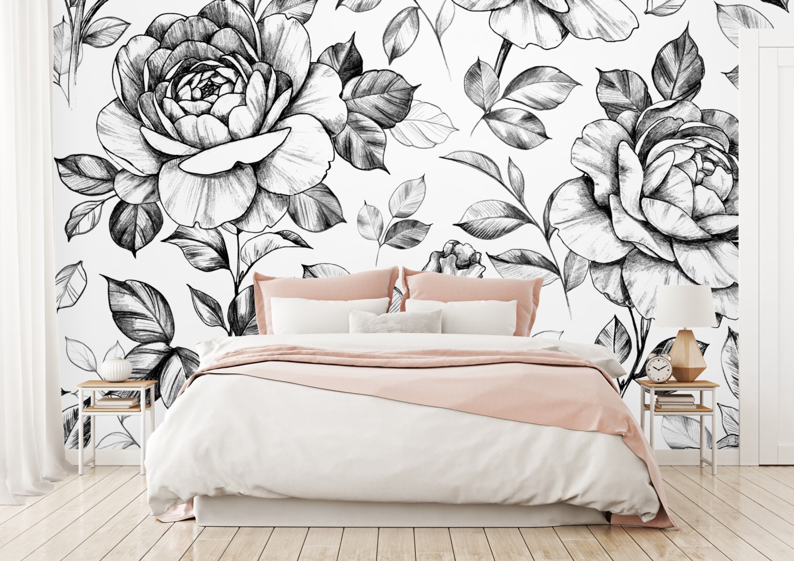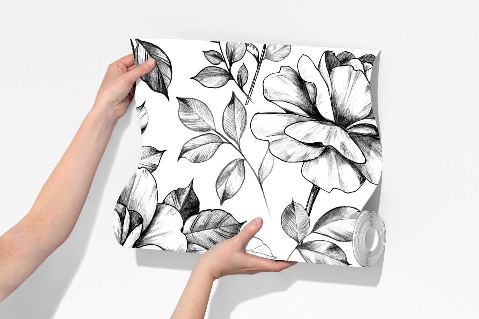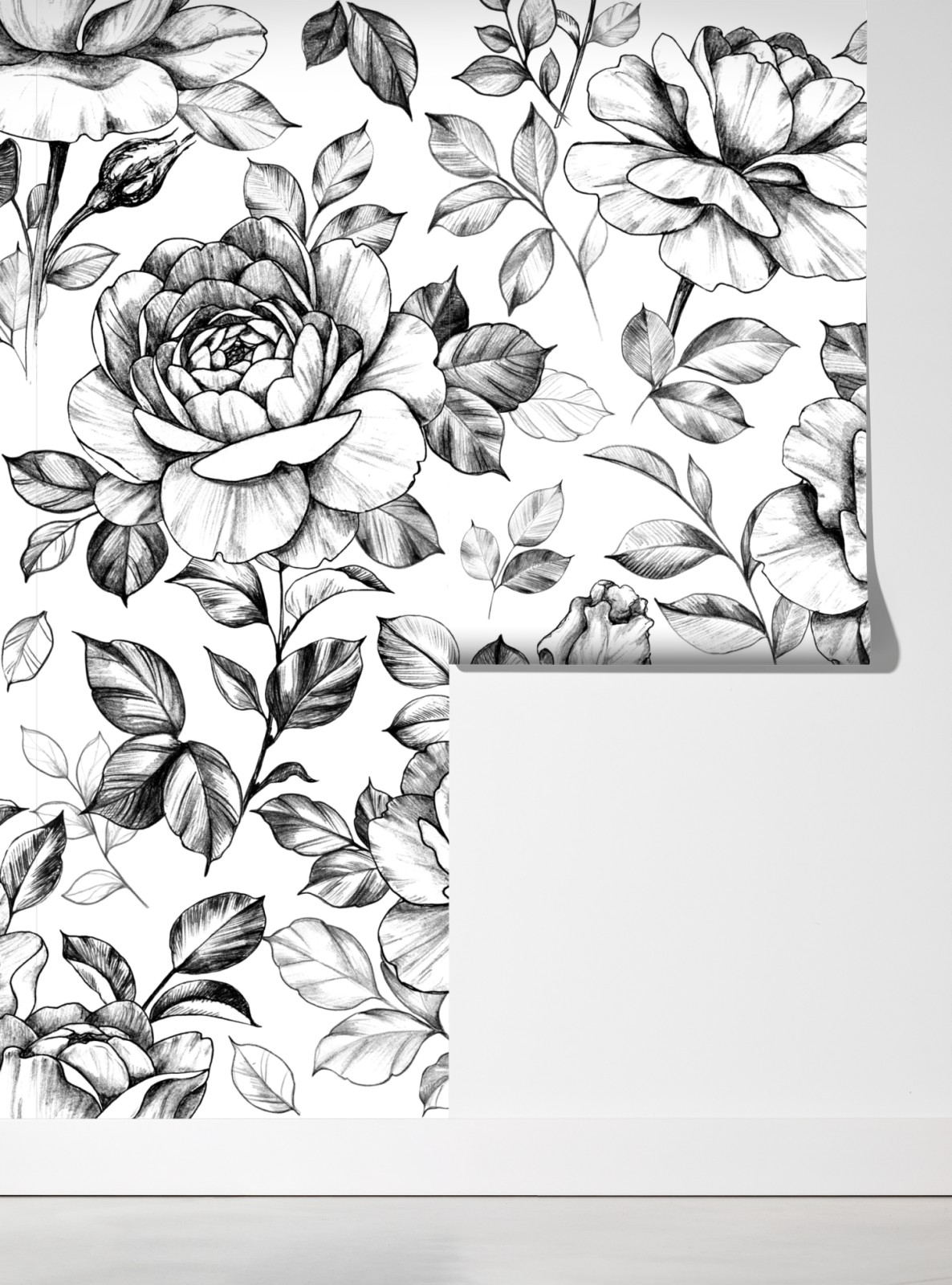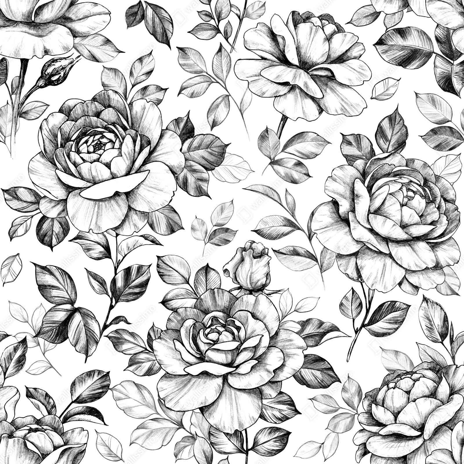 Elegantes handgezeichnetes Rosenmuster in monochromer Optik, ideal um dem Raum einen vintage-botanischen Akzent zu verleihen.