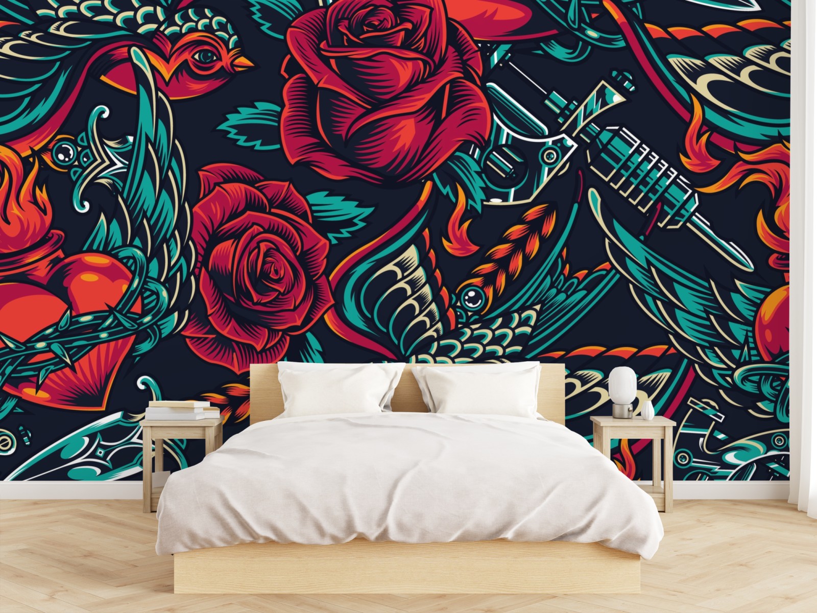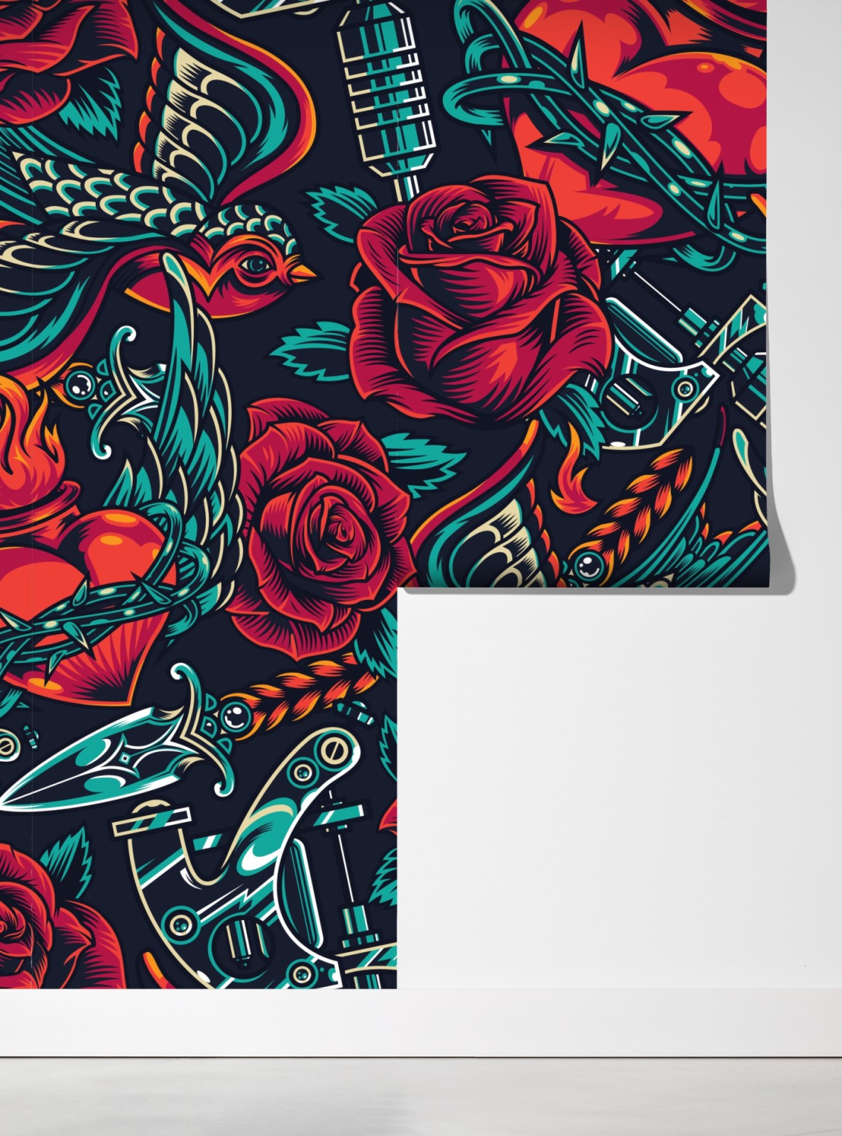 Kräftige tattoo-inspirierte grafik mit roten rosen, schwalben und retro-motiven für einen urbanen akzent.