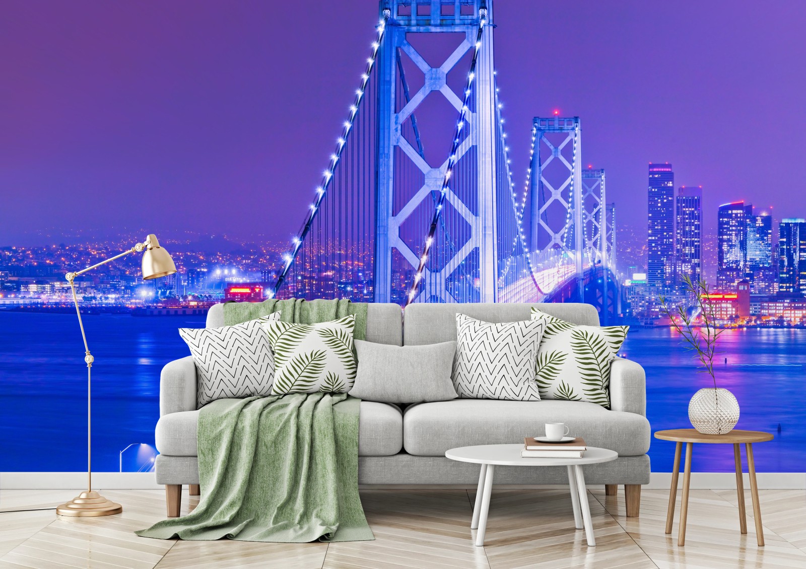 Fototapete Beleuchtete hängebrücke und stadtsilhouette bei nacht