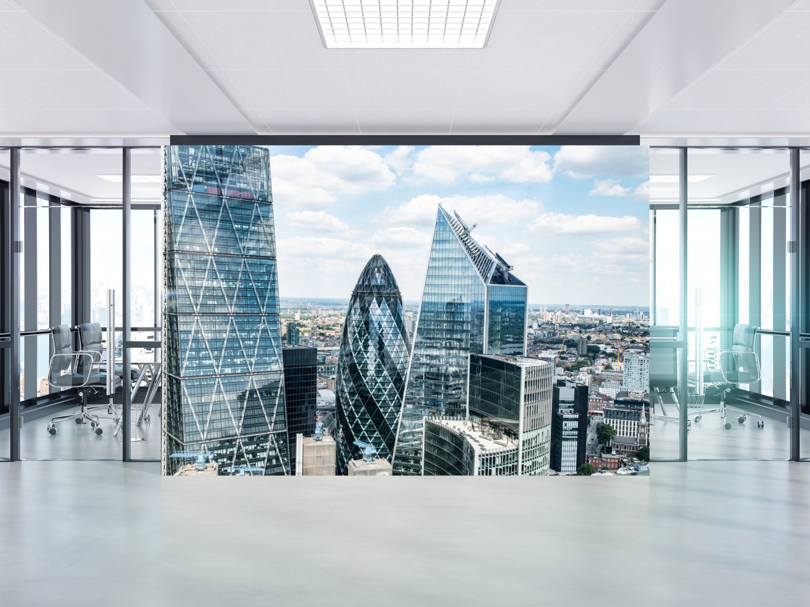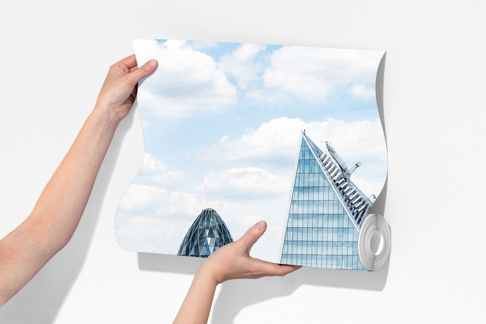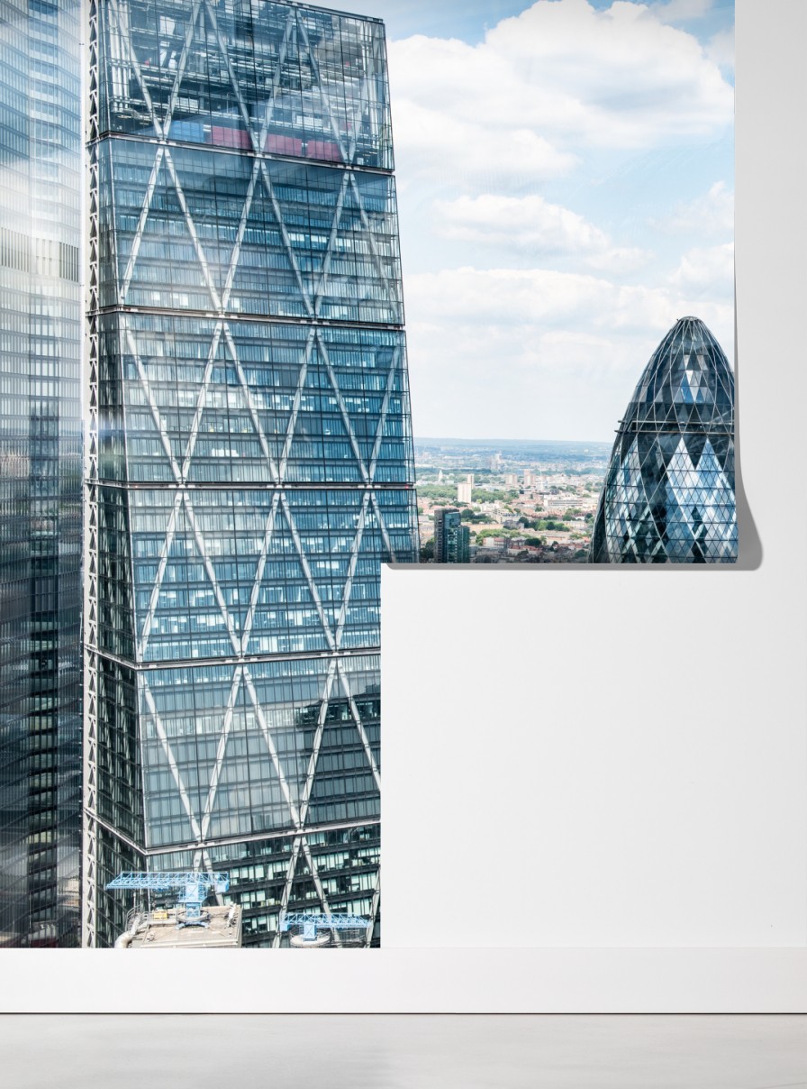 Bringen Sie die dynamische Energie der Londoner Skyline in Ihr Interieur mit diesem klaren Foto von reflektierenden Glaswolkenkratzern und hellem Himmel.