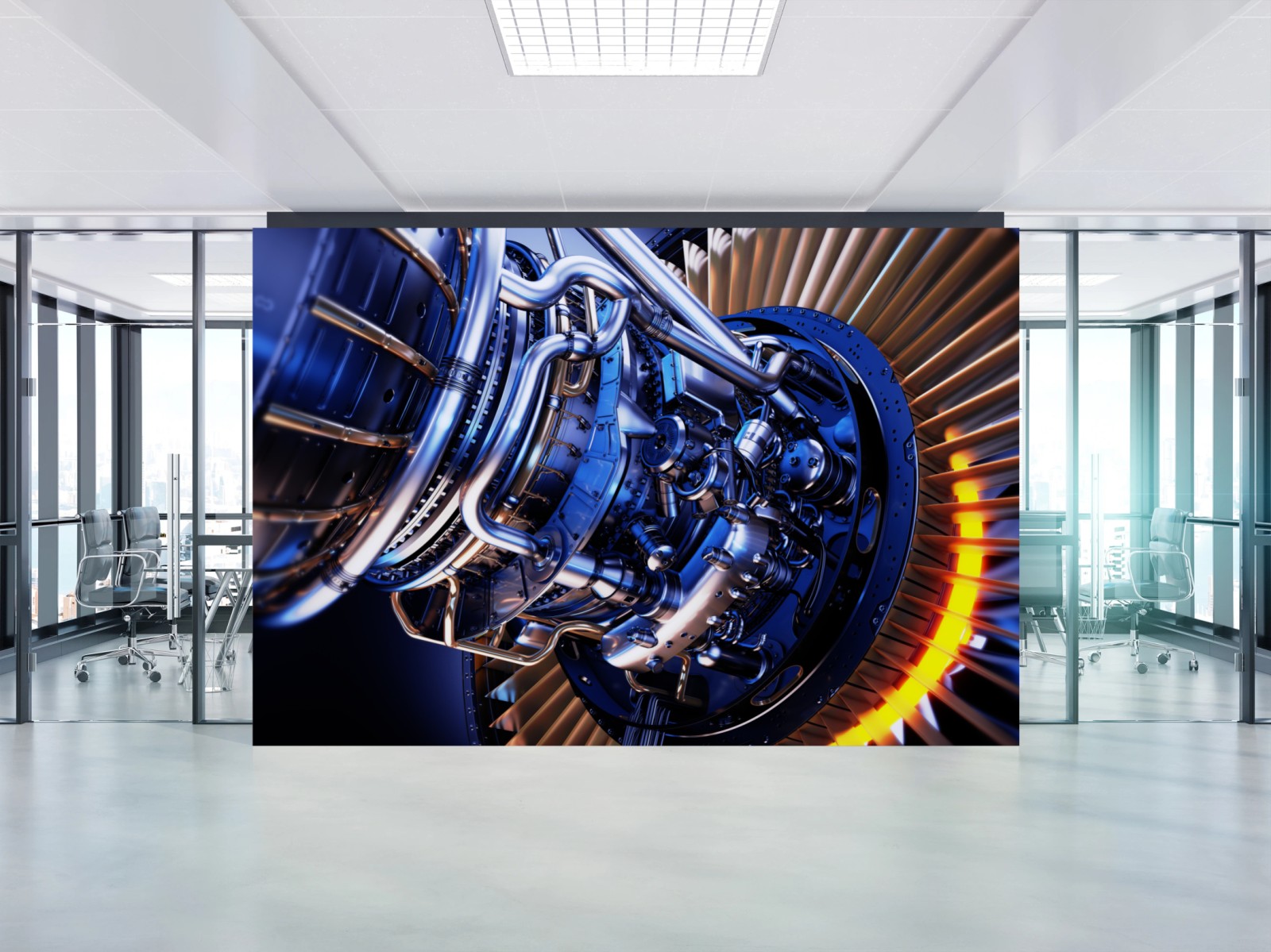 Fototapete Nahaufnahme einer turbinenanlage in blau und orange