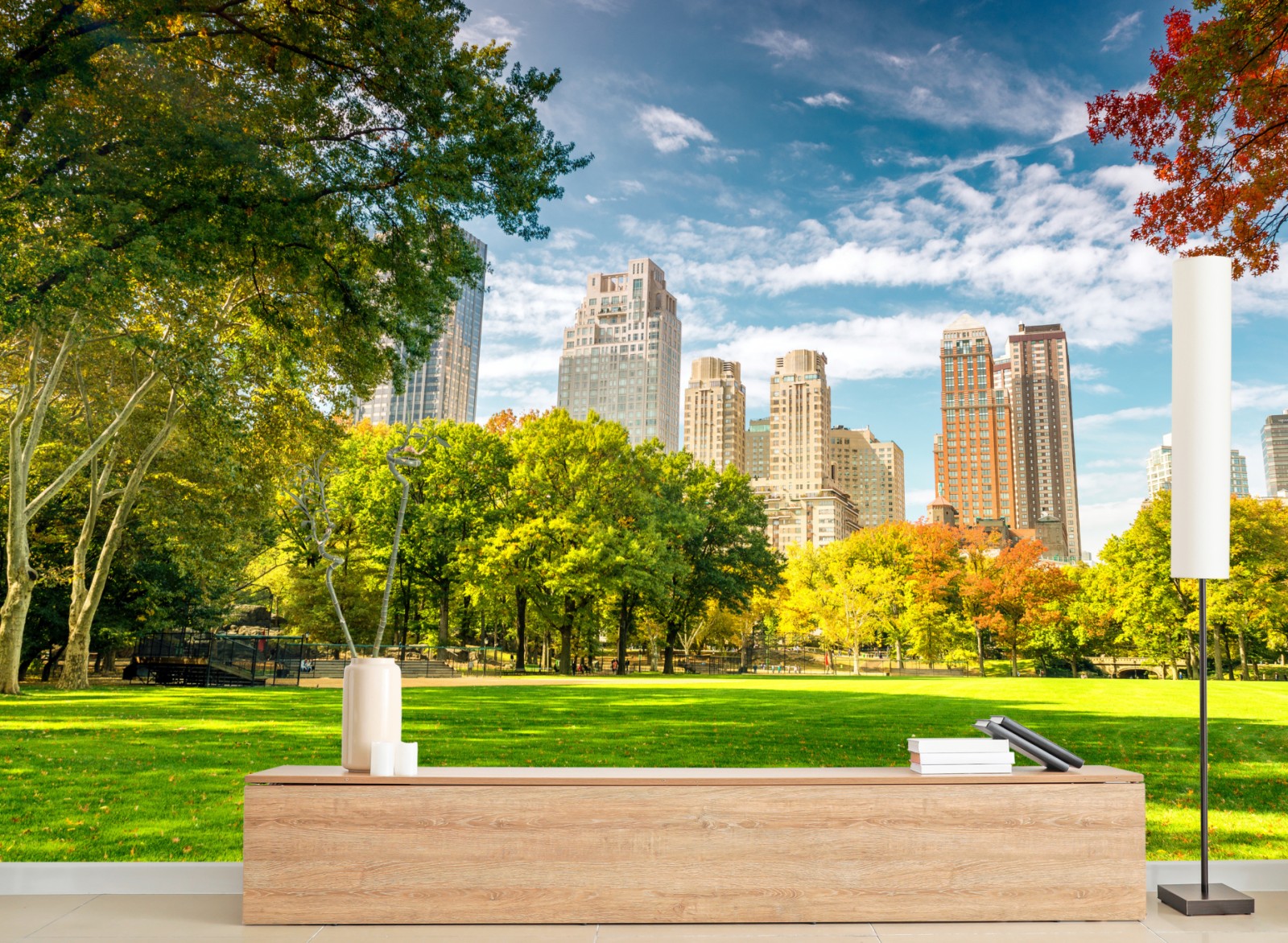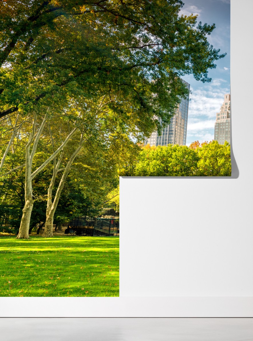 Bringen Sie die lebendigen Herbstfarben des Central Park in Ihr Zuhause mit dieser hellen Skyline- und Parklandschaft.