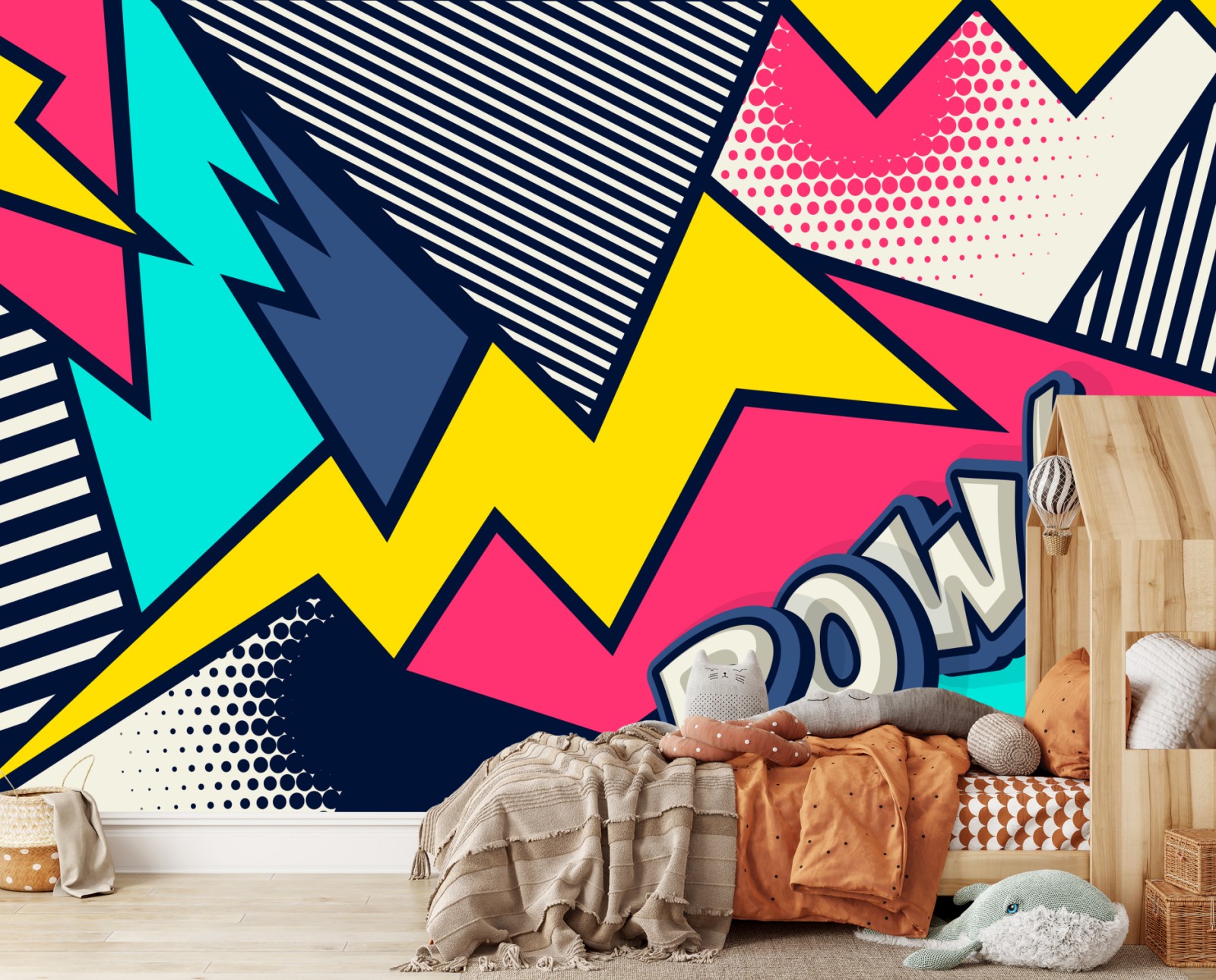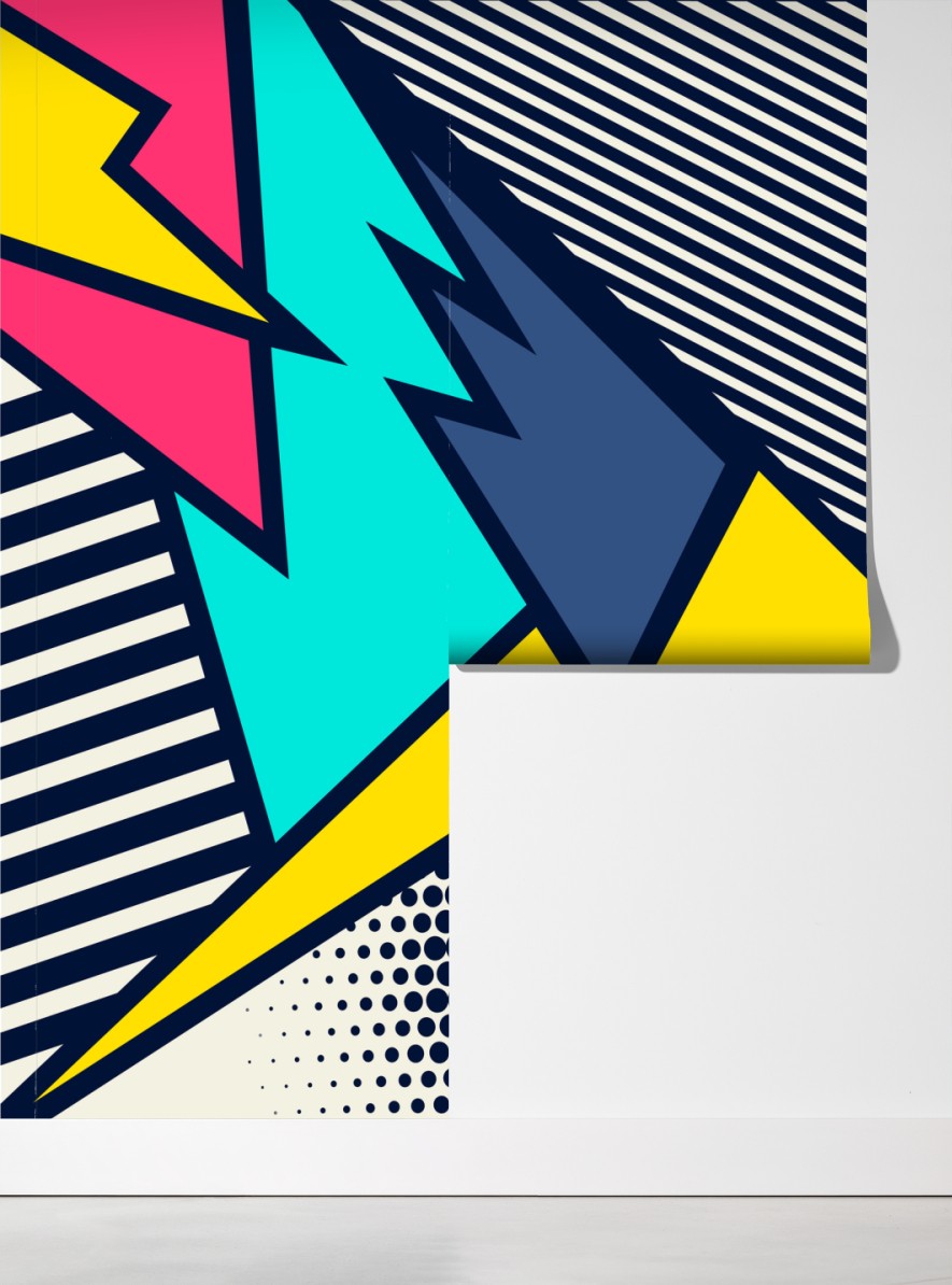 Verleihen Sie jedem Raum Energie und Farbe mit diesem kräftigen Pop-Art-Comic-Motiv mit dynamischen Formen und verspieltem POW-Akzent.
