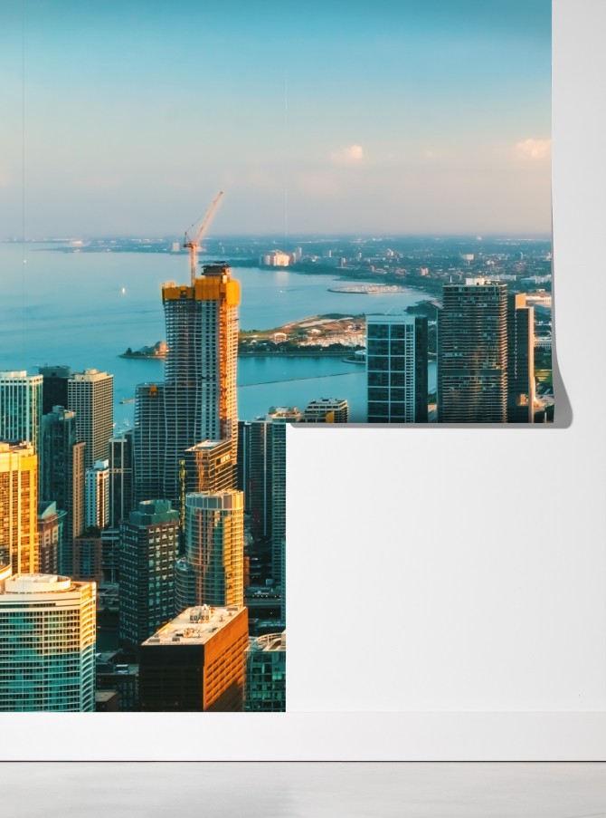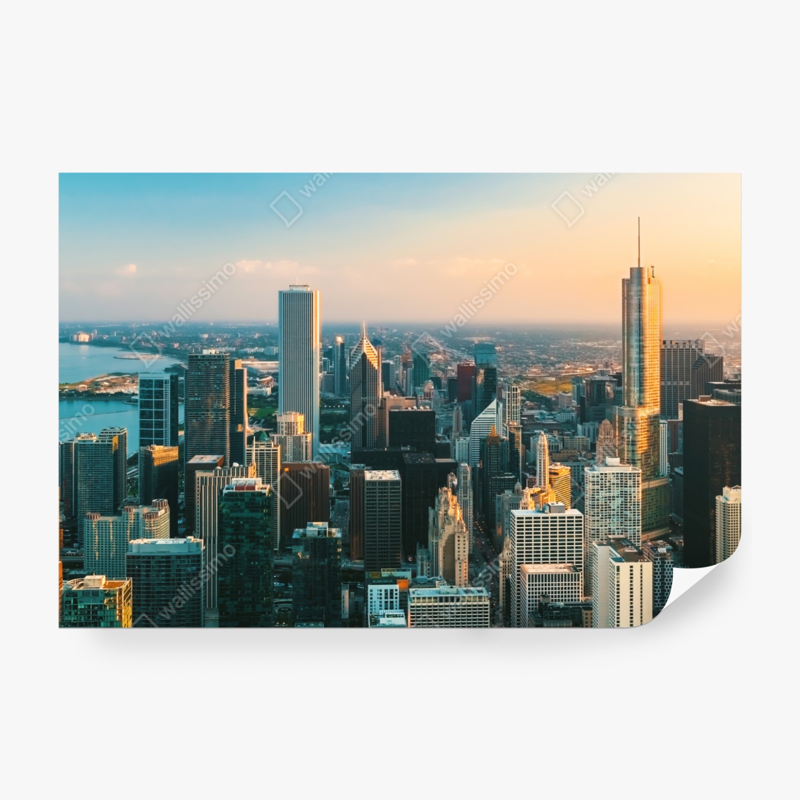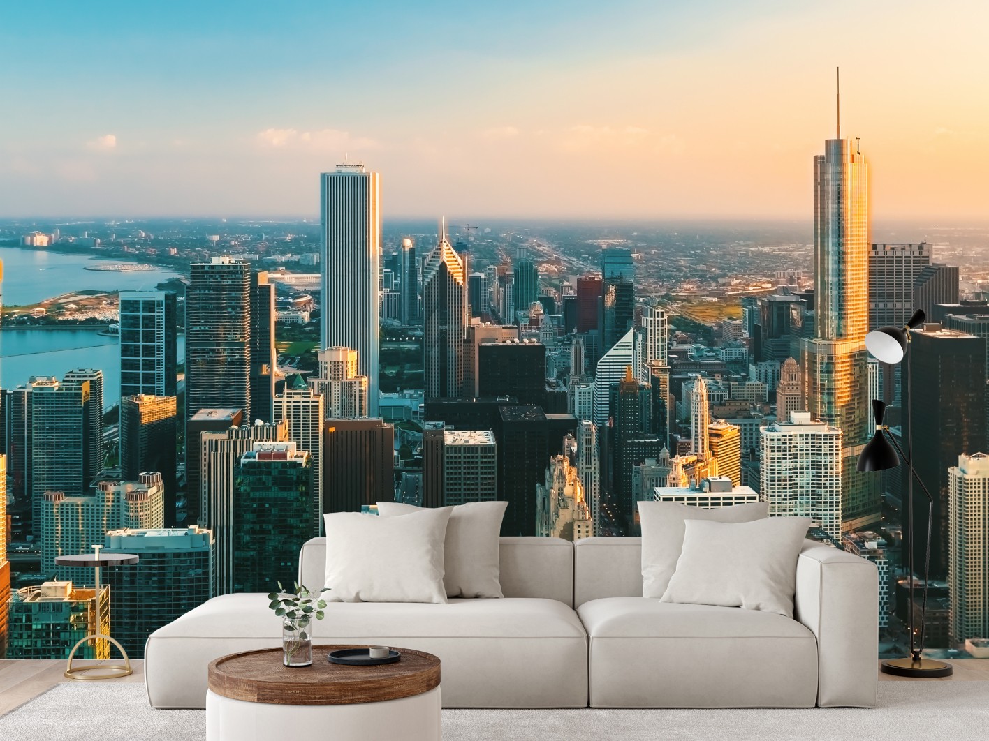 Verleihen Sie Ihrem Raum mit der goldenen Skyline von Chicago bei Sonnenuntergang urbanen Charme und warme Atmosphäre.
