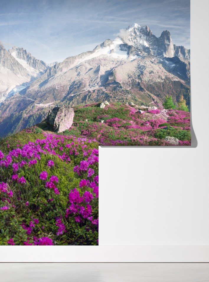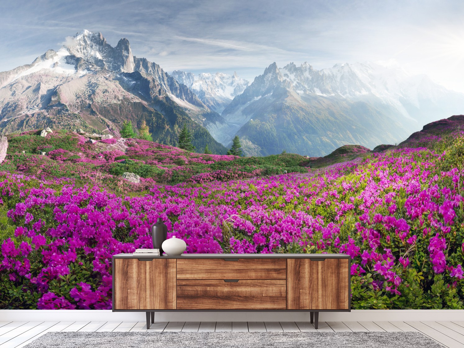 Erleben Sie die friedliche Schönheit des Mont Blanc, wo leuchtende Rhododendren alpine Wiesen unter majestätischen Gipfeln bedecken und Frühlingsfrische in jeden Raum bringen.