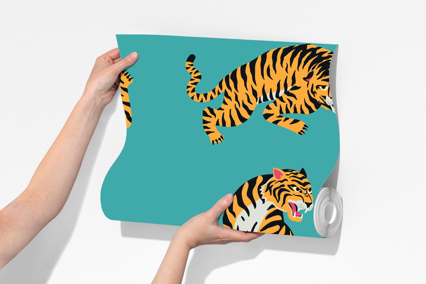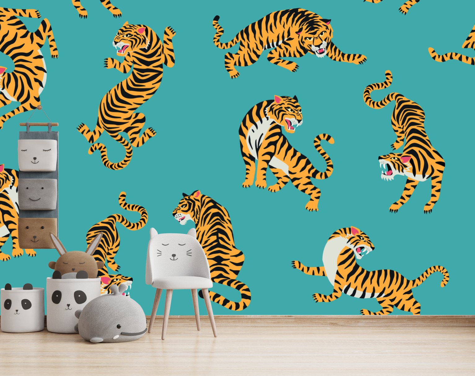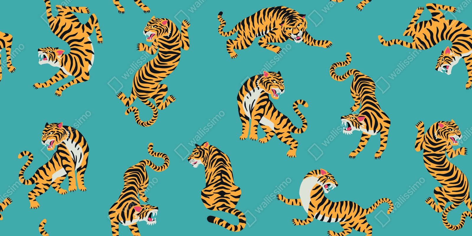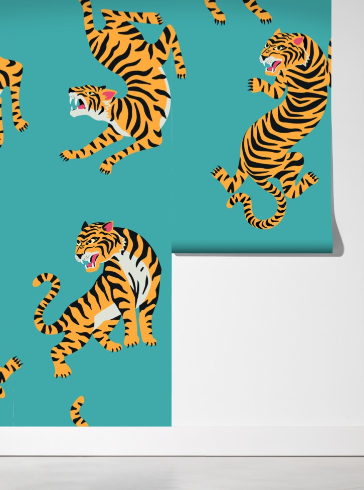Verleihen Sie jedem Raum kraftvollen Charakter mit diesem stilisierten Tigerdesign auf lebhaft türkisfarbenem Hintergrund.