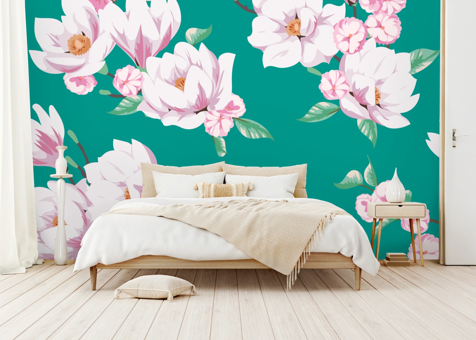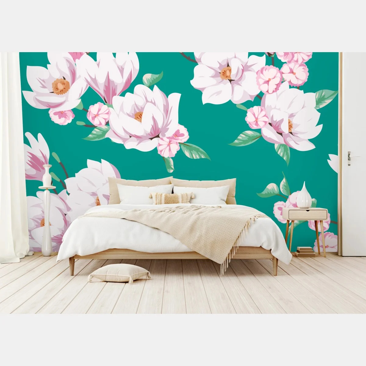 Fototapete Pastell magnolienmuster auf türkisfarbenem hintergrund